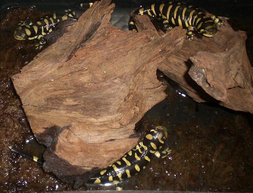 Ambystoma mavortium mavortium, genau 6 Tiere hatte ich in Gruppenhaltung, immer ordentlich hungrig gewesen, diese Tiger.<br />Auf dem Foto mussten sie bei einer Terrarienreinigung mal kurz das Plantschbecken wechseln ;).