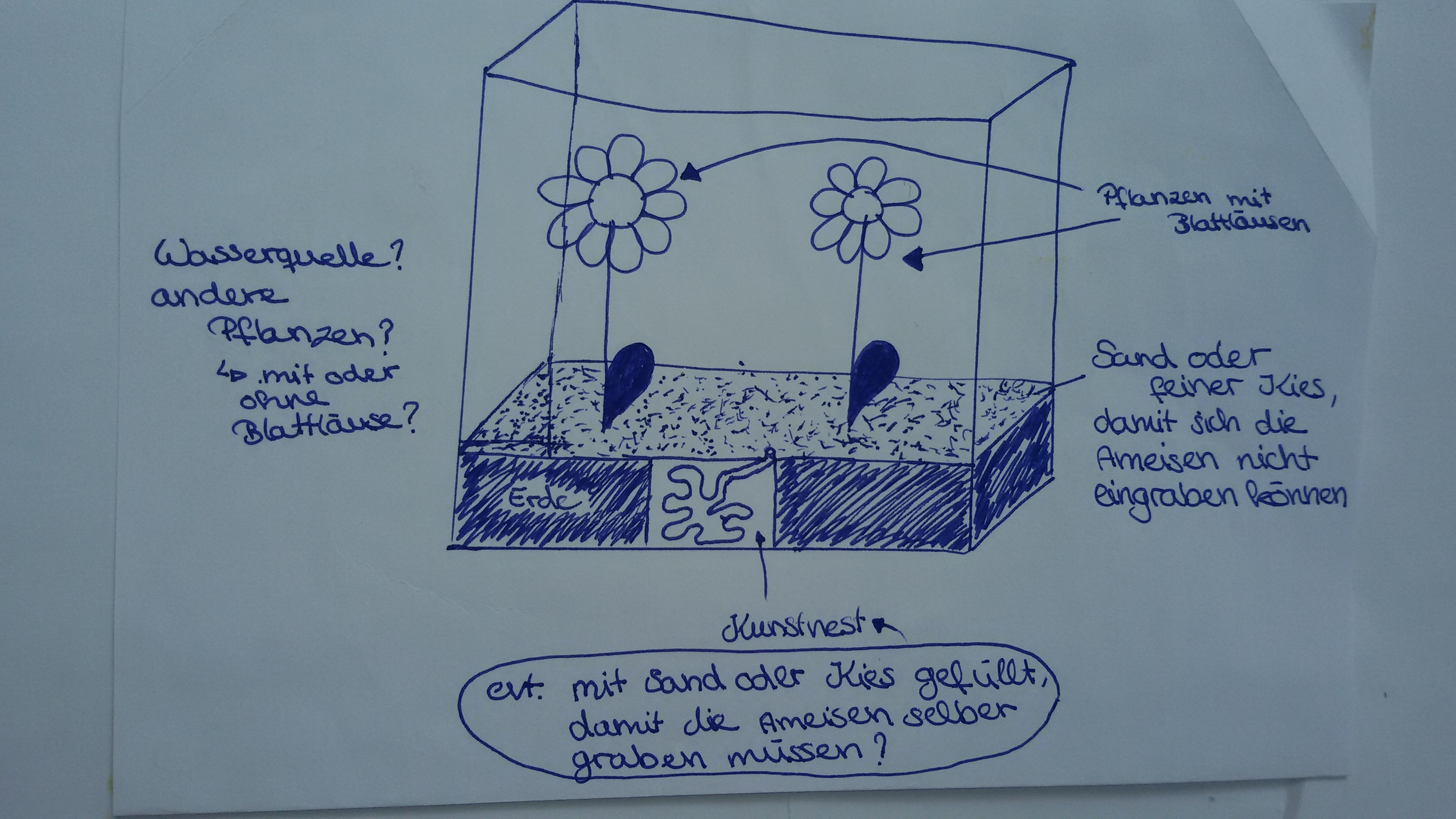 Die Ameisen brauchen in diesen Kästen auf jeden Fall Futter. Deshalb müssteb Pflanzen mit Blattläusen in die Kästen. Für die Pflanzen muss natürlich ERde da hinein. Außerdem müsste ich dafür sorgen, dass es Insekten und evt. Obst gibt.