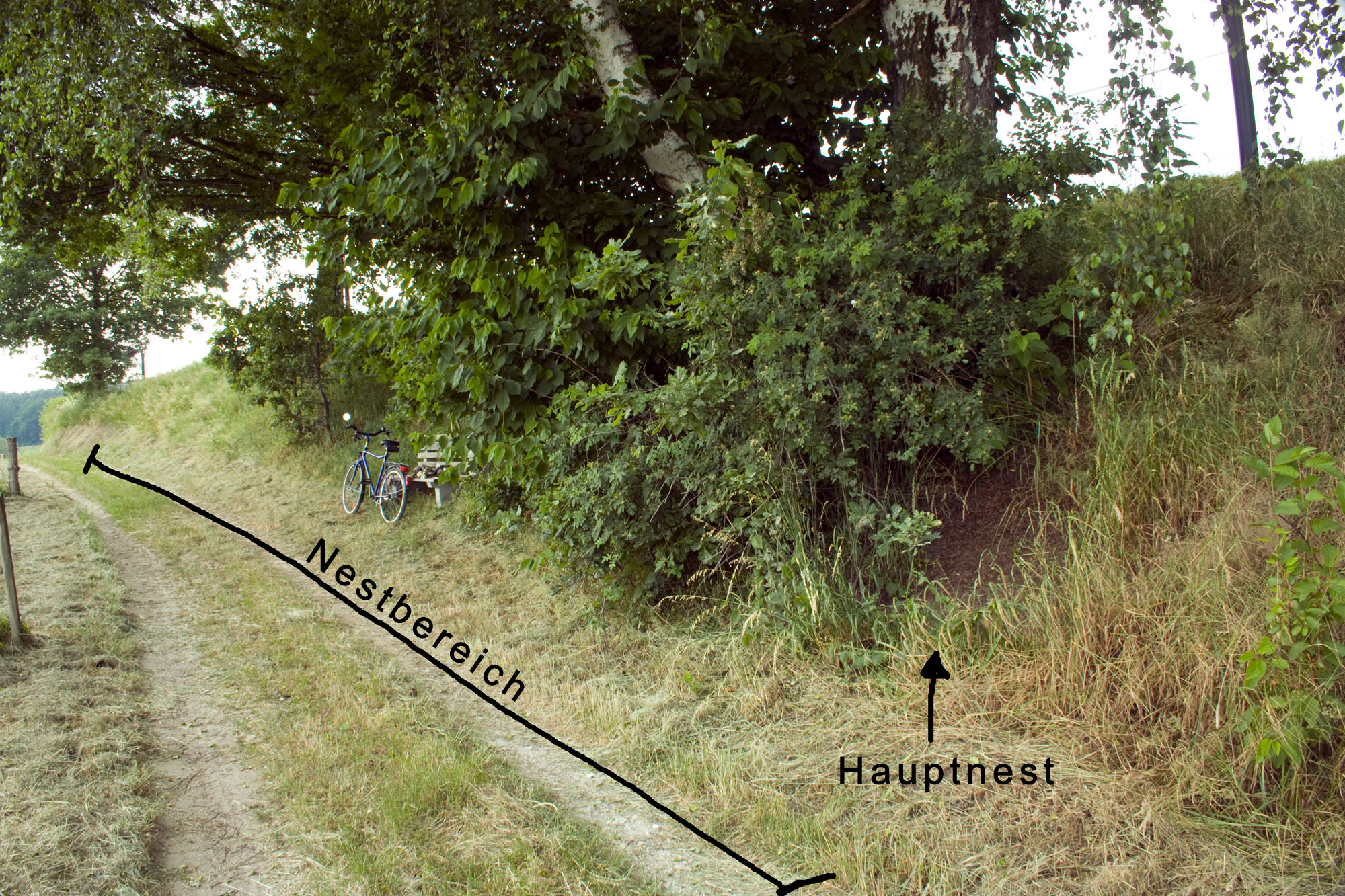 Das Nest ist an einem begrasten SĂŒd-West Erdhang direkt neben dem Weg. Es erstreckt sich vermutlich auf mehrere Quadratmeter oder es sind mehrere verbundene Nester den ganzen Hang entlang. Die Arbeiteranzahl wĂŒrde ich auf >1000 schĂ€tzen. Wenn man ca 1m vom Nest entfernt steht, hört man es richtig laut rascheln und knistern, weil der ganze Hang mit arbeitenden Ameisen voll ist.