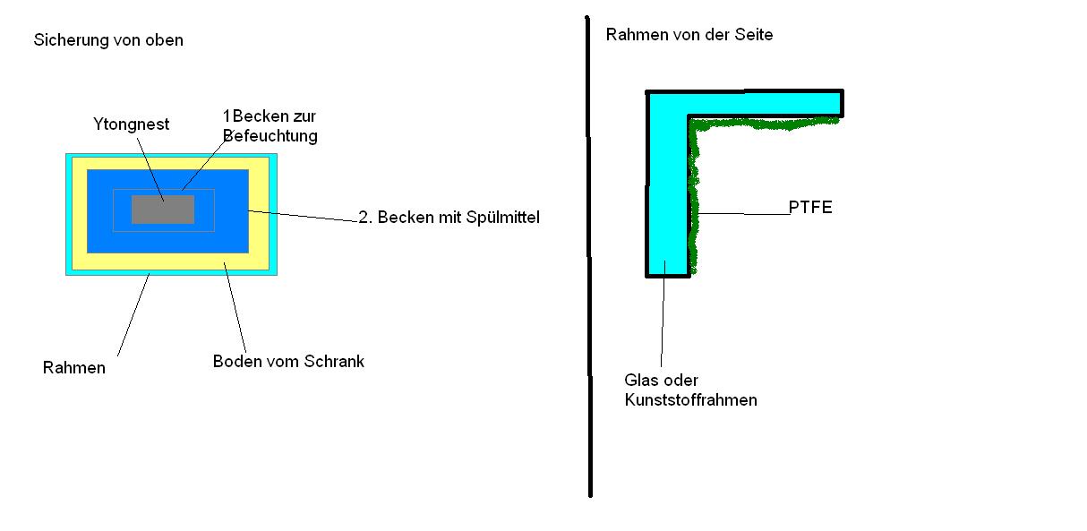 Nun zur Sicherung.Als erstes eine Schale in dem der Ytong selber steht.Die befülle ich mit Normalen Wasser.Und das eine Recht dünne lange Schale damit viel Wasser rein passt sie aber auch nicht sehr Hoch ist und sozusagen der Ytong in einer Wanne steht ist ja zum Nest betrachten auch sehr umständlich.Und genau diese Schalle kommt nochmals in eine andere größere Schalle.In diese kommt dann das Wasser mit Spülmittel.