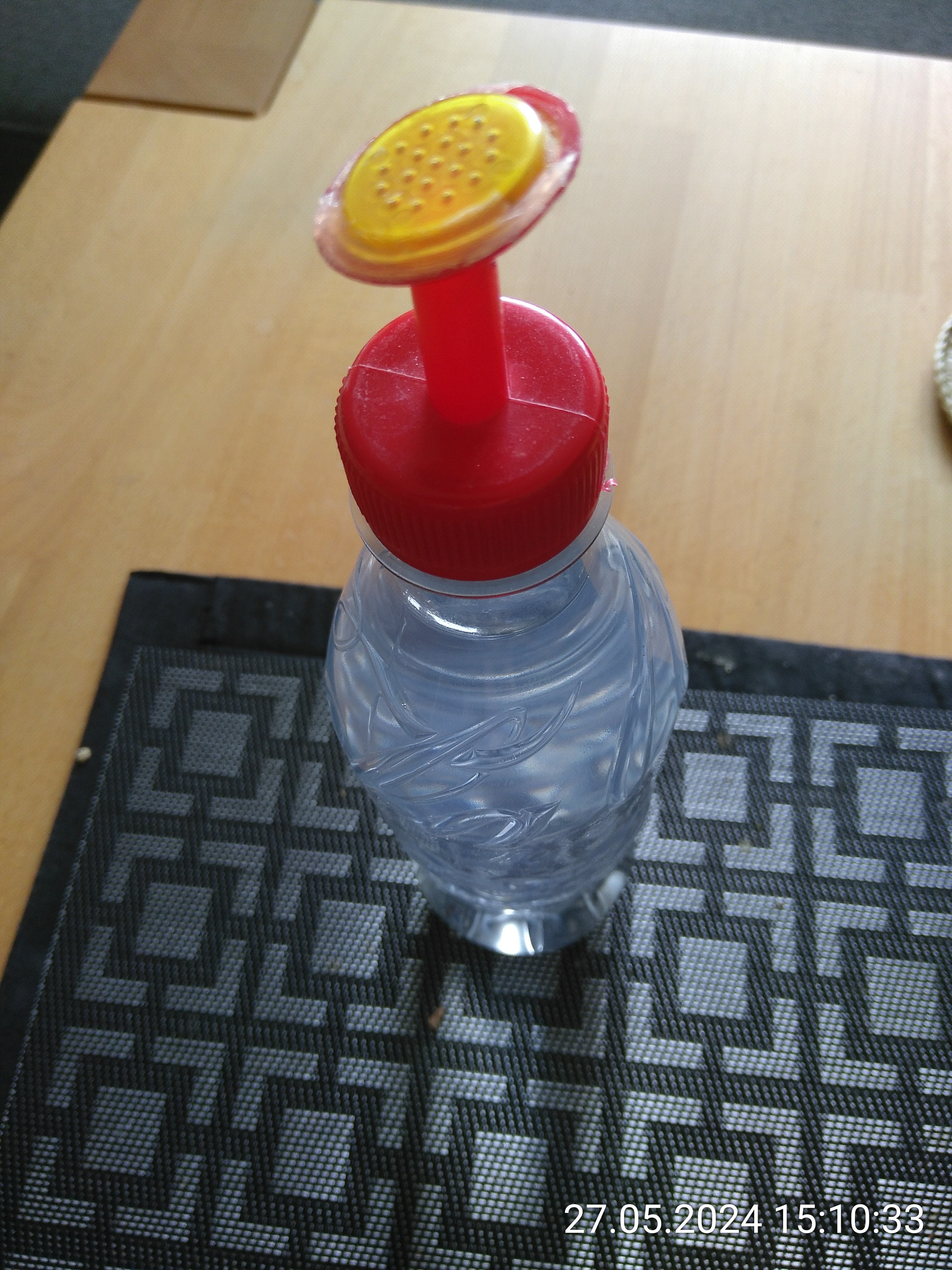 Ich würde bei einem so kleinen Becken auch eine kleine Gießkanne empfehlen. Ich nutze so einen Schraubverschluss für normale Getränkeflschen, sehr praktisch. Je nach Druck auf die Flasche wird der Strahl stärker oder schwächer und man kommt damit auch gut in Ecken.