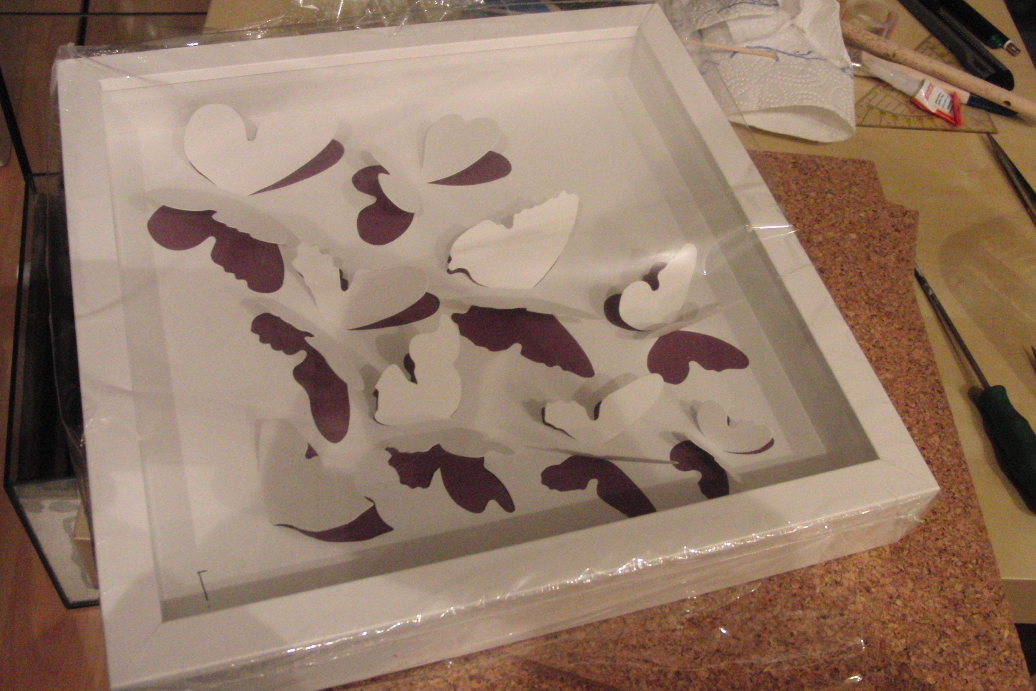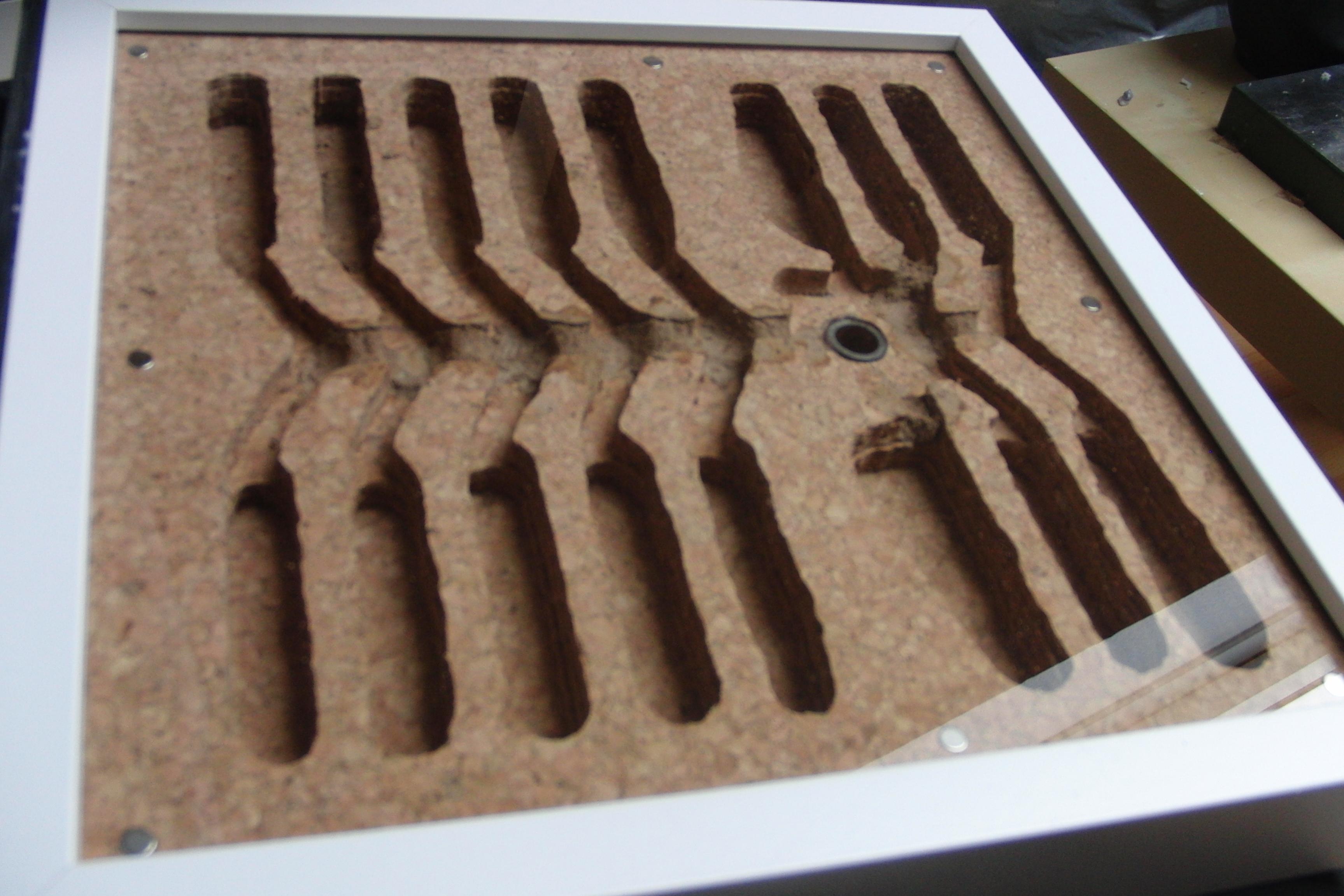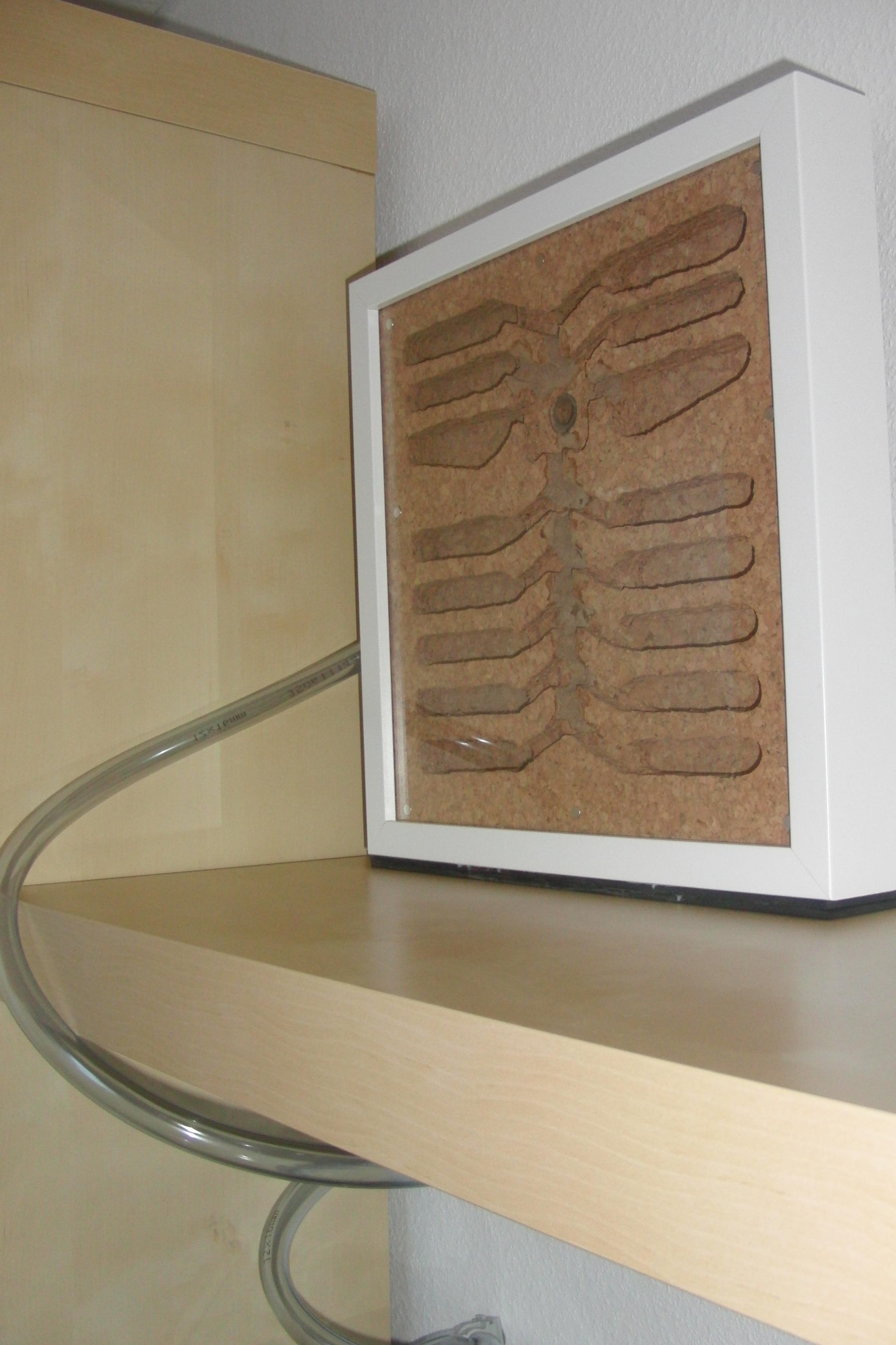 Das Ganze hab ich dann passgenau in der Rahmen eingefĂŒgt. Vorher noch kleine Magnete in die Ecken eingelassen. FĂŒr die spĂ€tere Nestverdunklung mit roter oder schwarzer Folie. Diese ist dann einfach von auĂen an der Scheibe zu befestigen. Teilweise hab ich Nestbereiche noch mit einem Lehm/Korkstaub-Gemisch verschlossen.