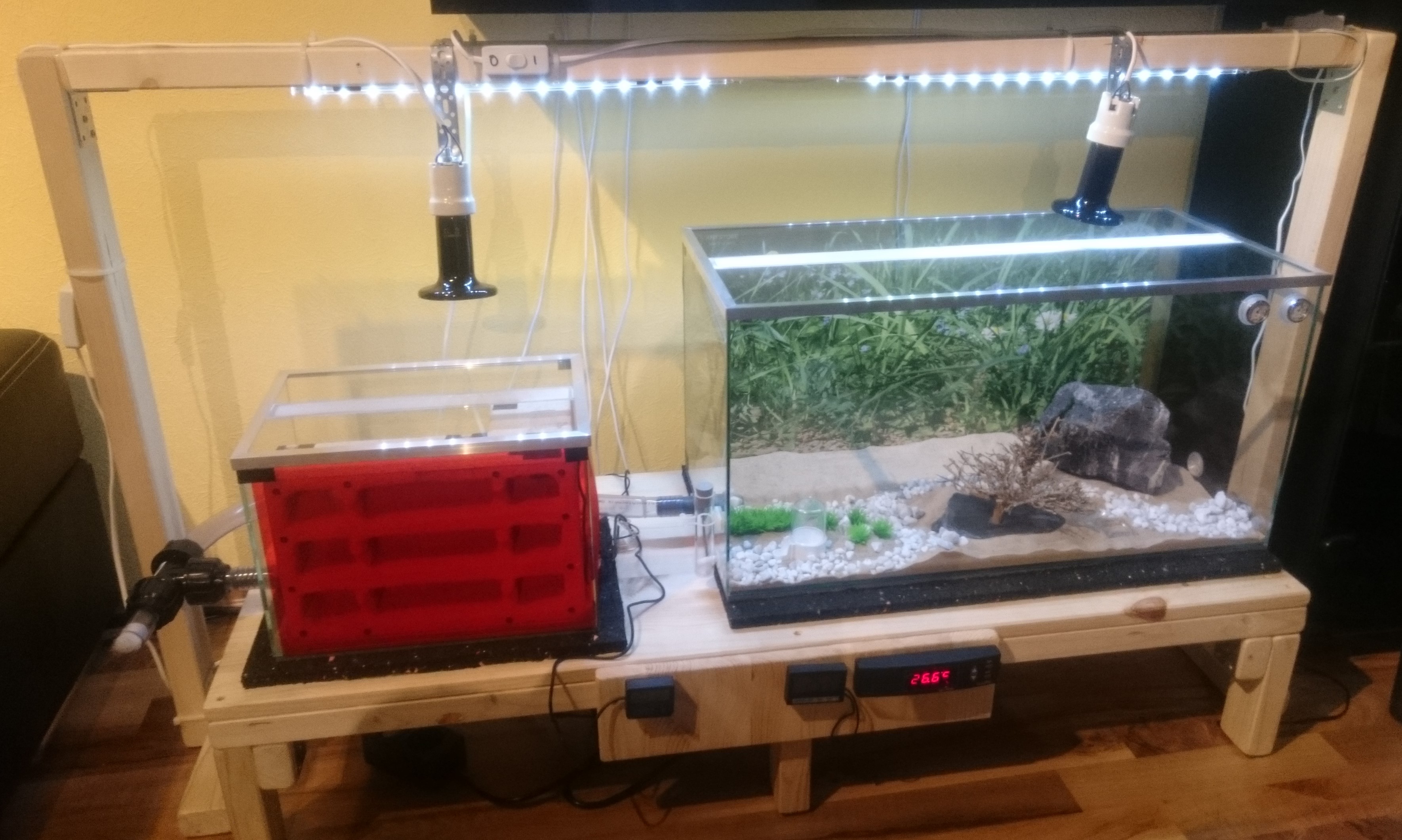 Der Arenaboden besteht aus einer 1-2cm dicken Sandschicht. Mit weißen Marmorsteinchen sind ein paar Wege dargestellt. Außerdem ist der Trinkbereich mit den Steinchen bestückt. Hier sind aktuell noch 2 verschiedene Tränken zu sehen. Ich möchte testen welche der beiden Tränken besser ankommt. Neben dem Trinkbereich gibt es noch 2 Futterbereiche. Der 1. Futterbereich liegt auf dem schwarzen Stein. Auf diesem Stein sollen zukünftig Insekten angeboten werden. Der 2. Futterbereich ist für die Körner und befindet sich in der vorderen Rechten Ecke. Der Keramikstrahler über der Arena wird über eine Zeitschaltuhr gesteuert und dient nur dazu kalte Wintertage in der Arena angenehmer zu machen. Die LED Leiste über den Becken ist so angeschlossen, dass sich die LEDs über dem Nest abschalten lassen, um die Lichteinwirkung zu minimieren. Die kleinen Pflanzen sind Aquarienpflanzen aus Plastik.