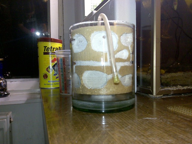 Noch ist das ganze nicht fertig. Als nĂ€chstes wird der Schlauch an das Ausgangsloch angeklebt. Erste Versuche mit Heisskleber liefen schief. Als nĂ€chstes versuch ich es mit Aqauriensilikon. An den Ausgang kommt ein Plastikgelenk, das ich im Aquarienladen bekommen habe (ist fĂŒr Aqaurienfilter). Daran kommt dann der Schlauch.