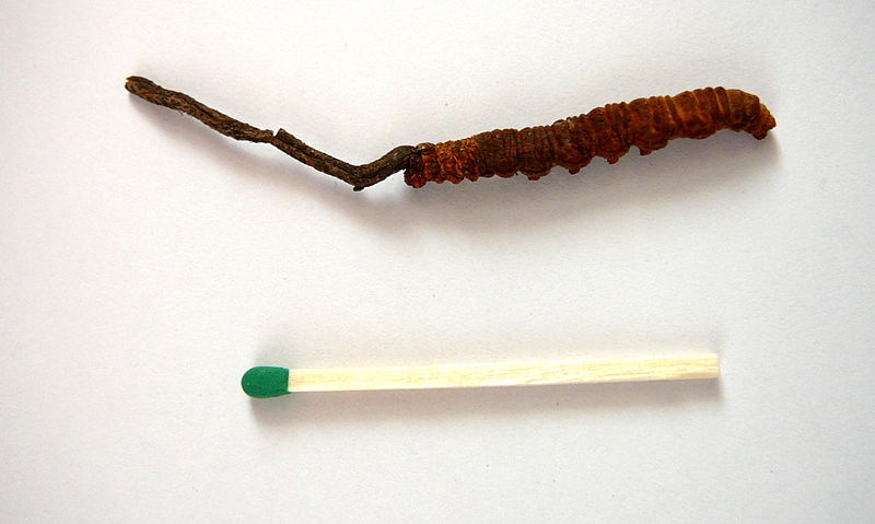 Bild: Ophiocordyceps sinensis (links), rechts der Wirt, eine Raupe; von Nicolas Merky, CC-BY-SA-3.0-DE