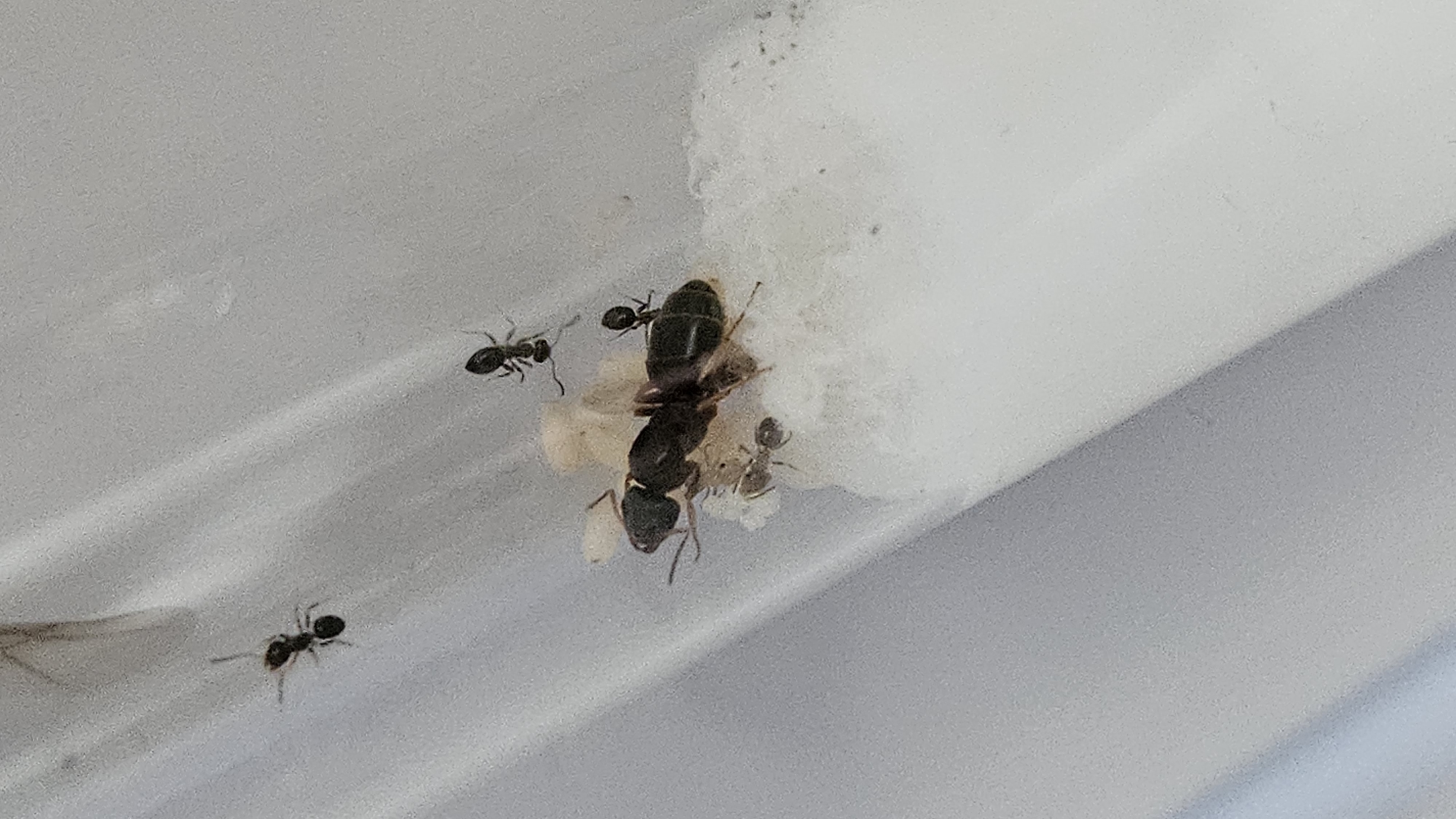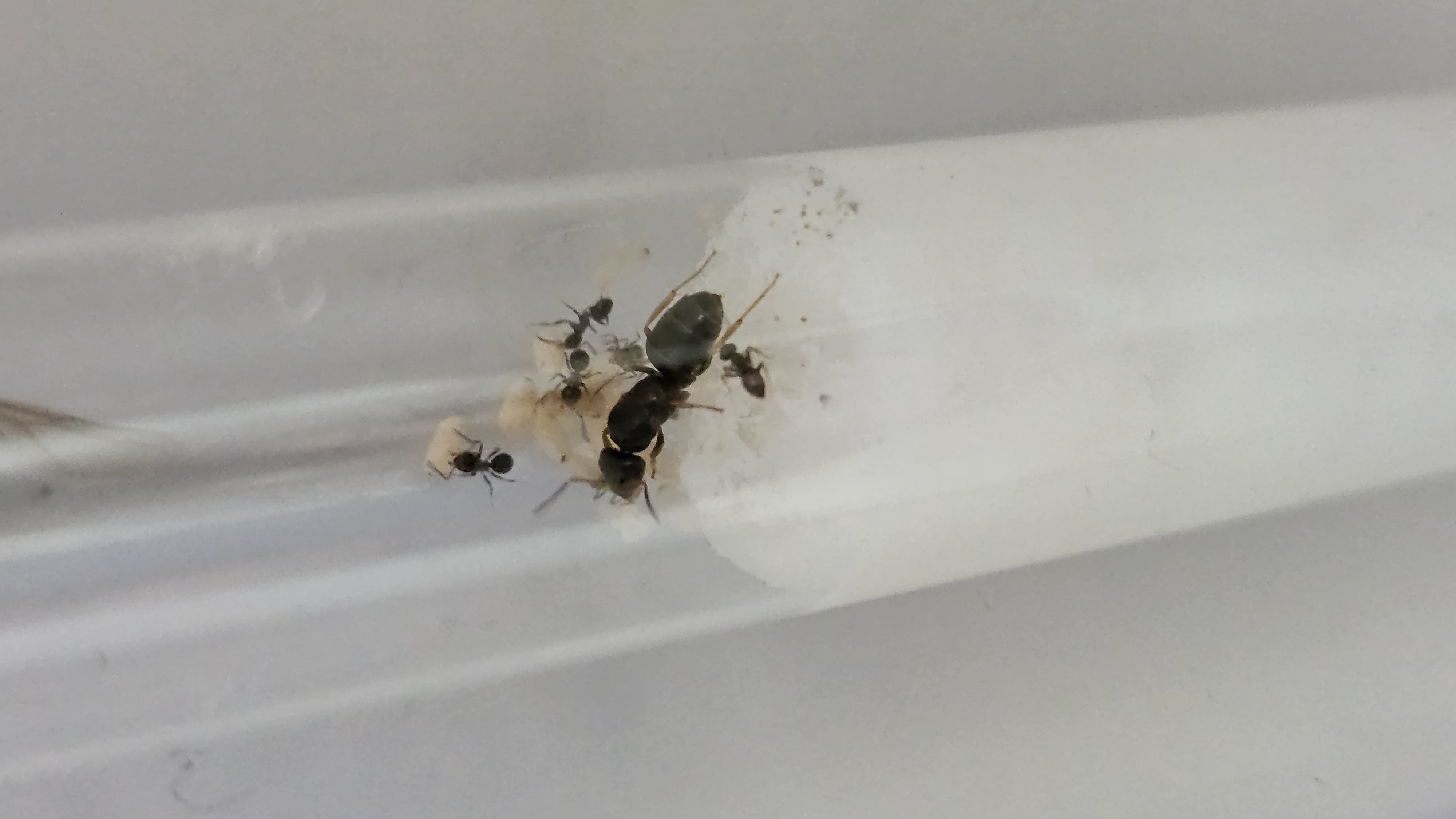 Du kannst jetzt auch schon mit dem Füttern loslegen (dieGyne sieht finde ich etwas hungrig aus). Am einfachsten für dich und am wenigsten stressig für die Ameisen geht das, indem du das RG abgedunkelt in eine provisorische Arena (z.B. Plastikbox) mit Ausbruchsschutz und Bodengrund legst und ihnen dort regelmäßig frisches Zuckerwasser und hin und wieder ein kleines, totes Insekt anbietest.