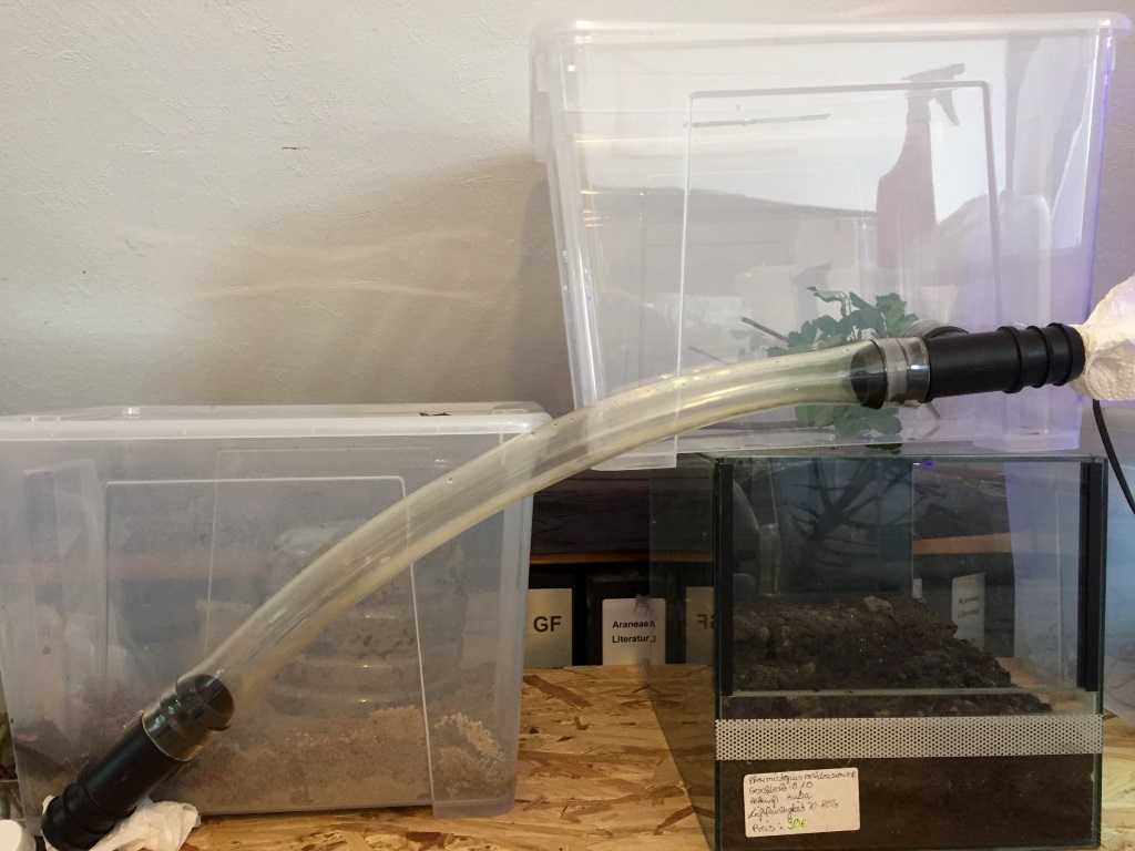 Da das Futter aufgrund der schlechten Luftzirkulation (Samla Box ohne Belüftungsflächen, damit die Luftfeuchtigkeit für den Pilz recht hoch ist) immer recht schnell verschimmelt ist, habe ich provisorisch ein zweite Box als Futterarena angeschlossen und höher gestellt, damit durch "Thermik" ein bisschen Luftaustausch stattfindet.