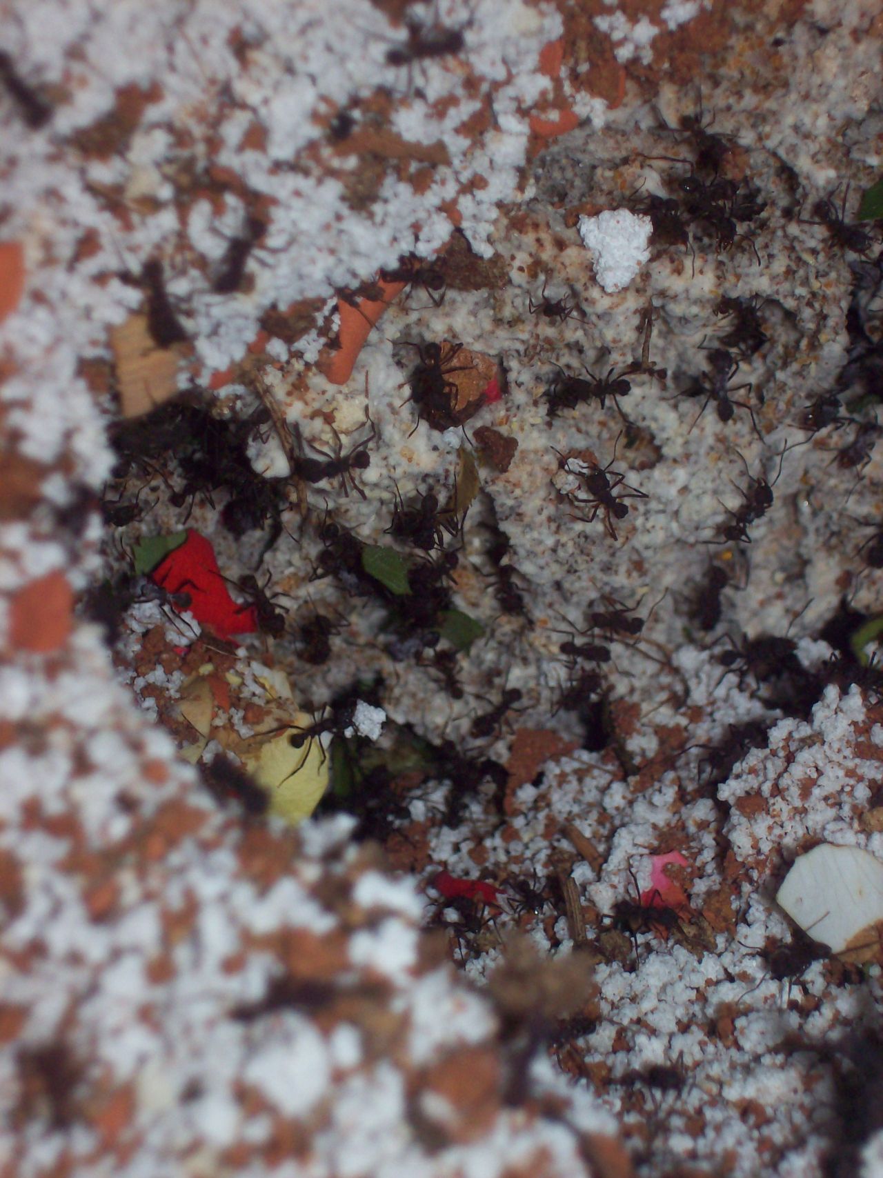 Arbeiterinnen dĂŒrften es ca. 300 im Moment sein, die meisten Hocken auf dem Pilz oder untertunneln mein Formi weiter, ca. 20-50 (je nach Nahrungsangebot) beschĂ€ftigen sich mit dem blattschnitt!