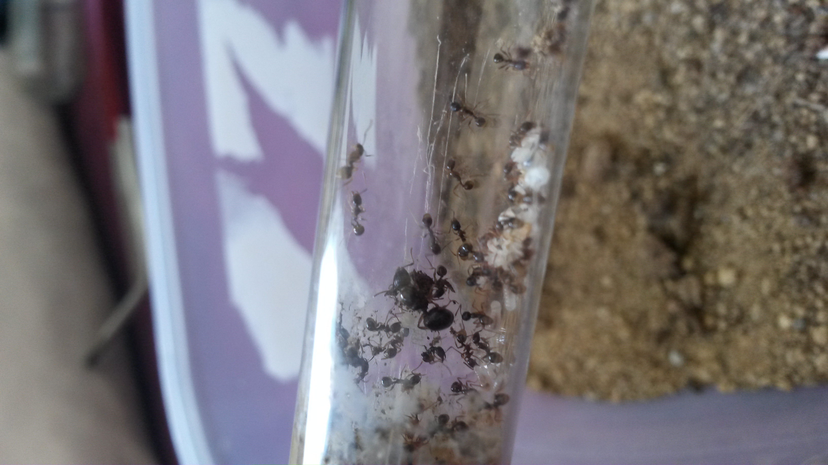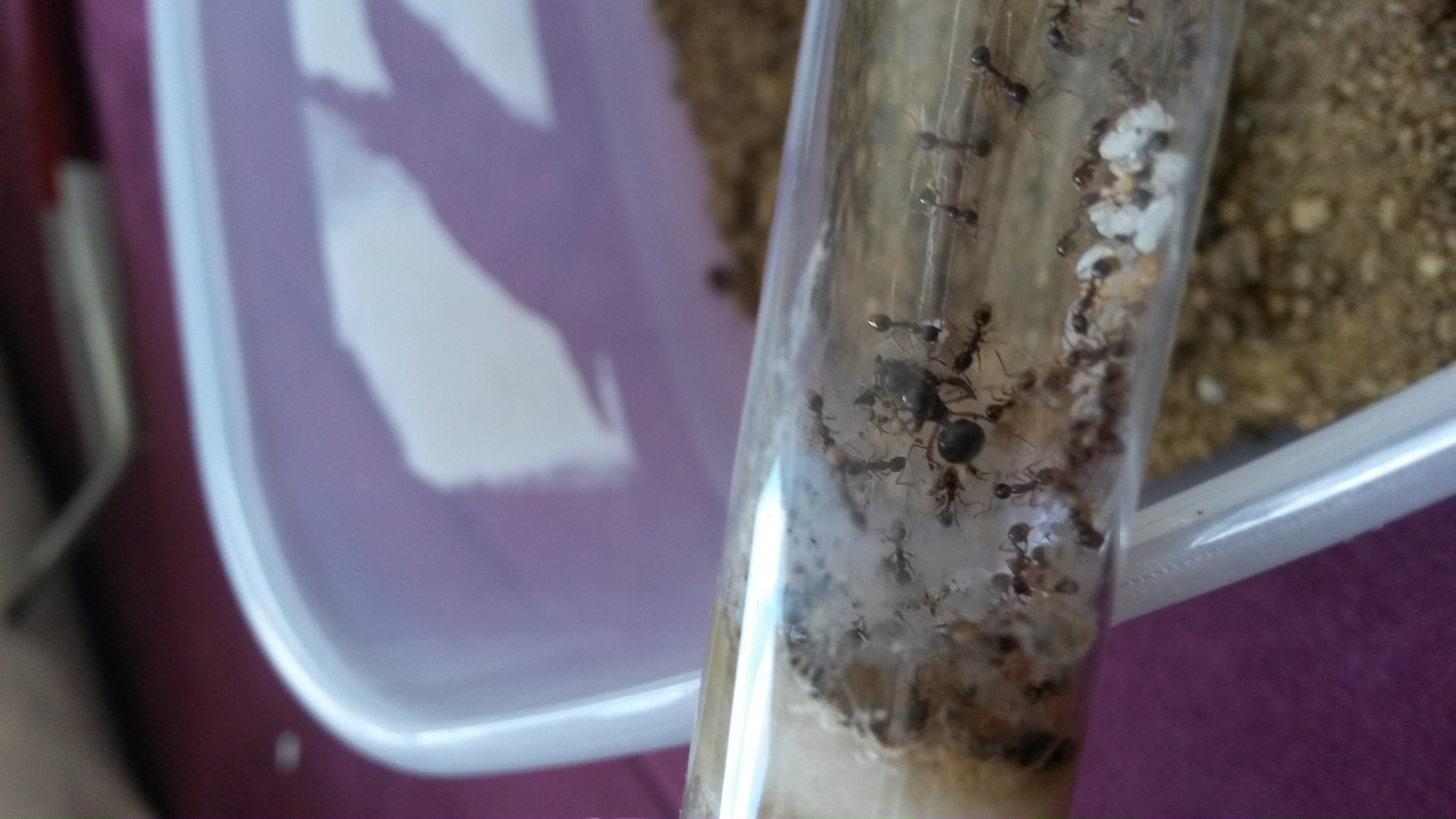 Das sind definitv myrmicine Ameisen (zwei Petiolusglieder, Lasius fällt damit raus), da sie gegründet hat würde ich mal auf Tetramorium tippen (Myrmica ist ja semi-claustral und gründet ohne Futterzugabe garnicht erst).