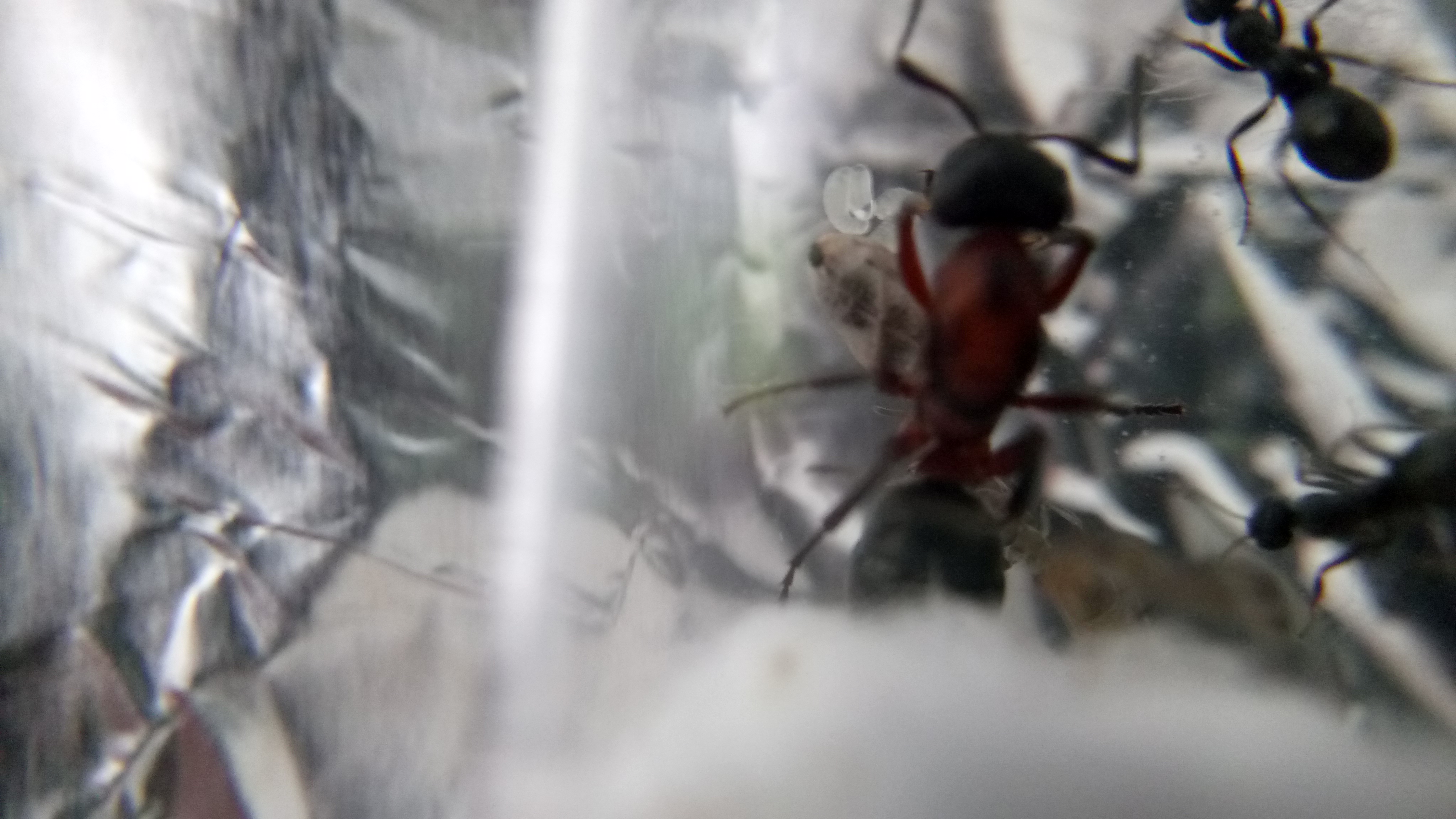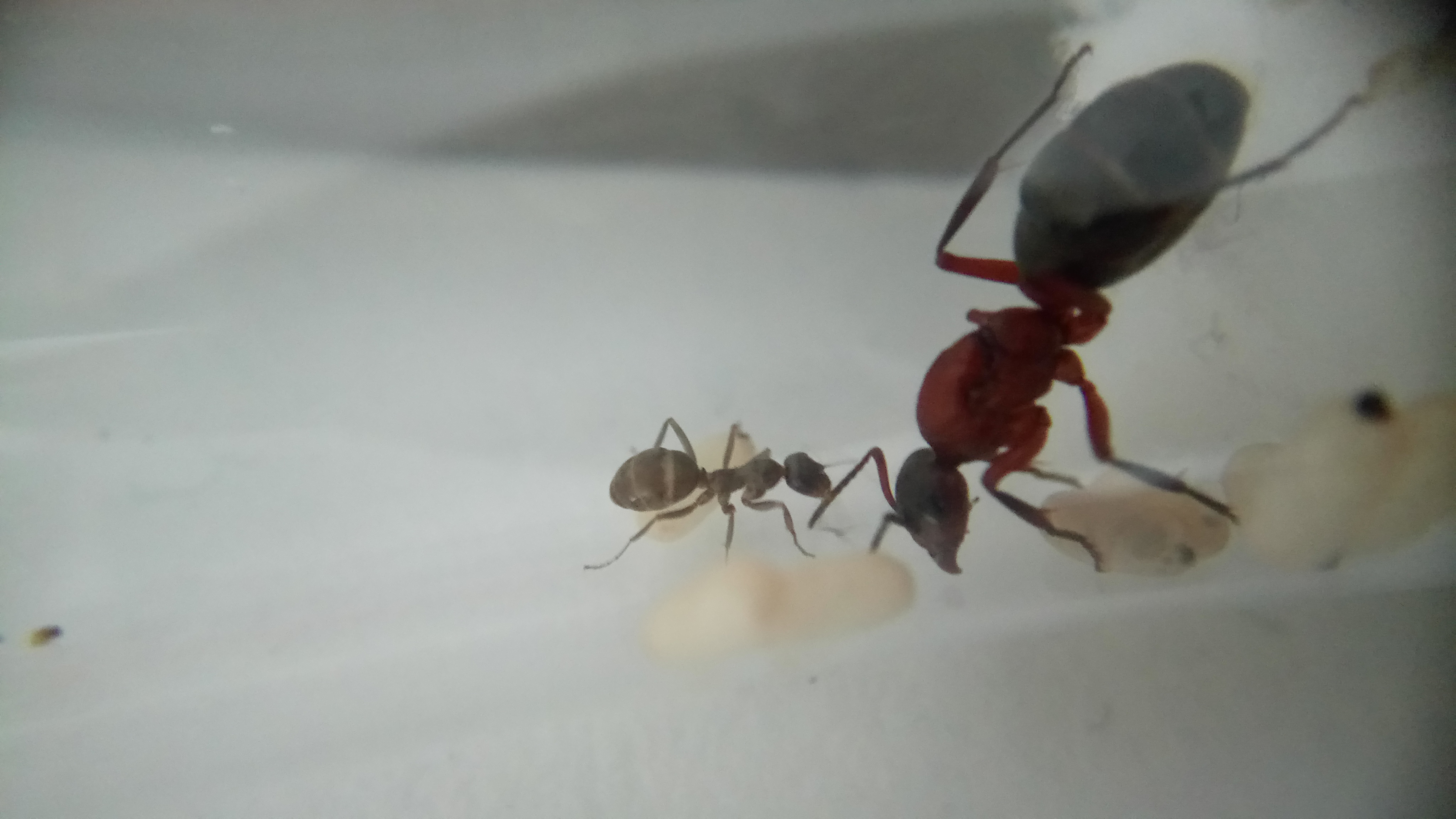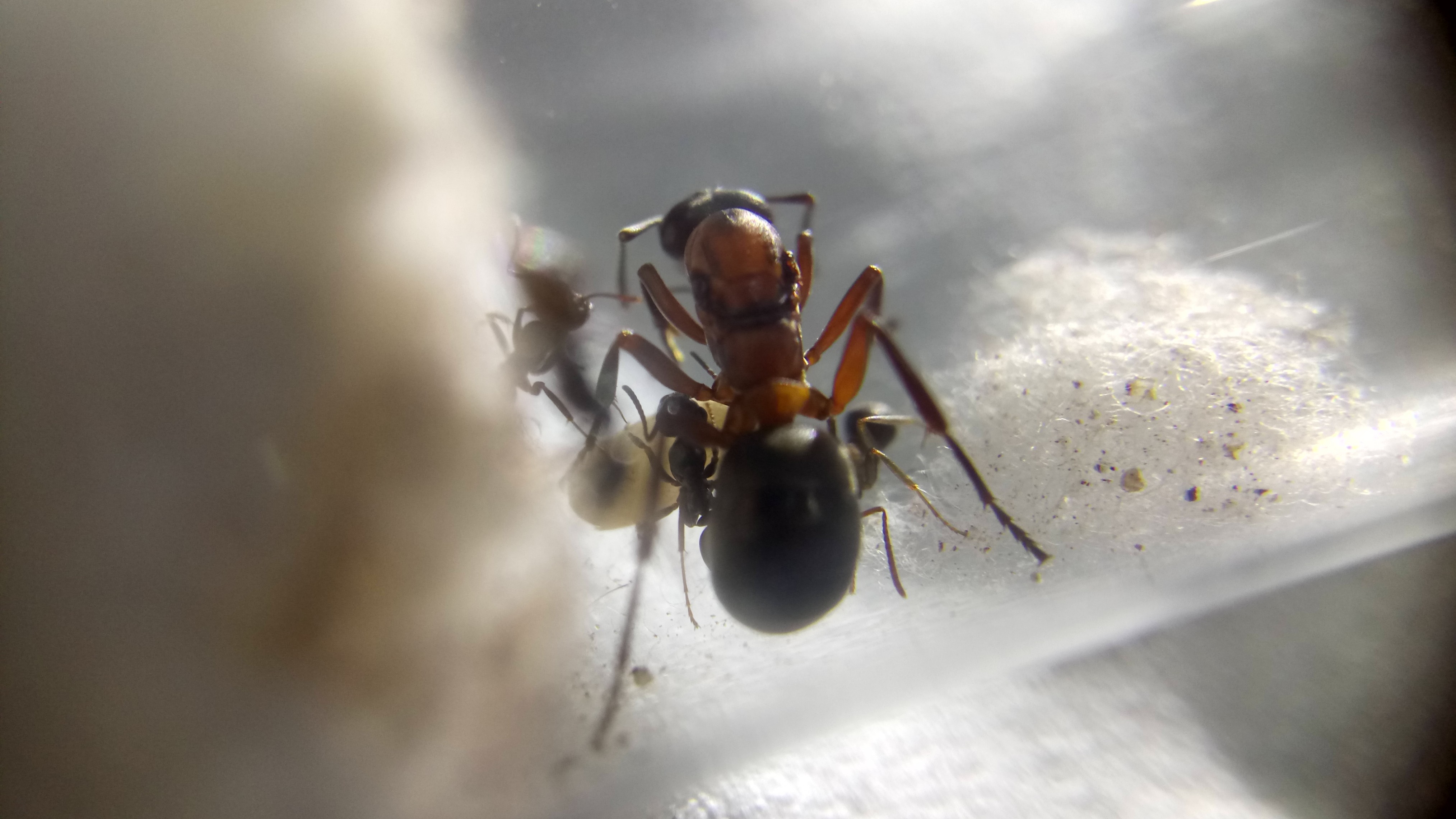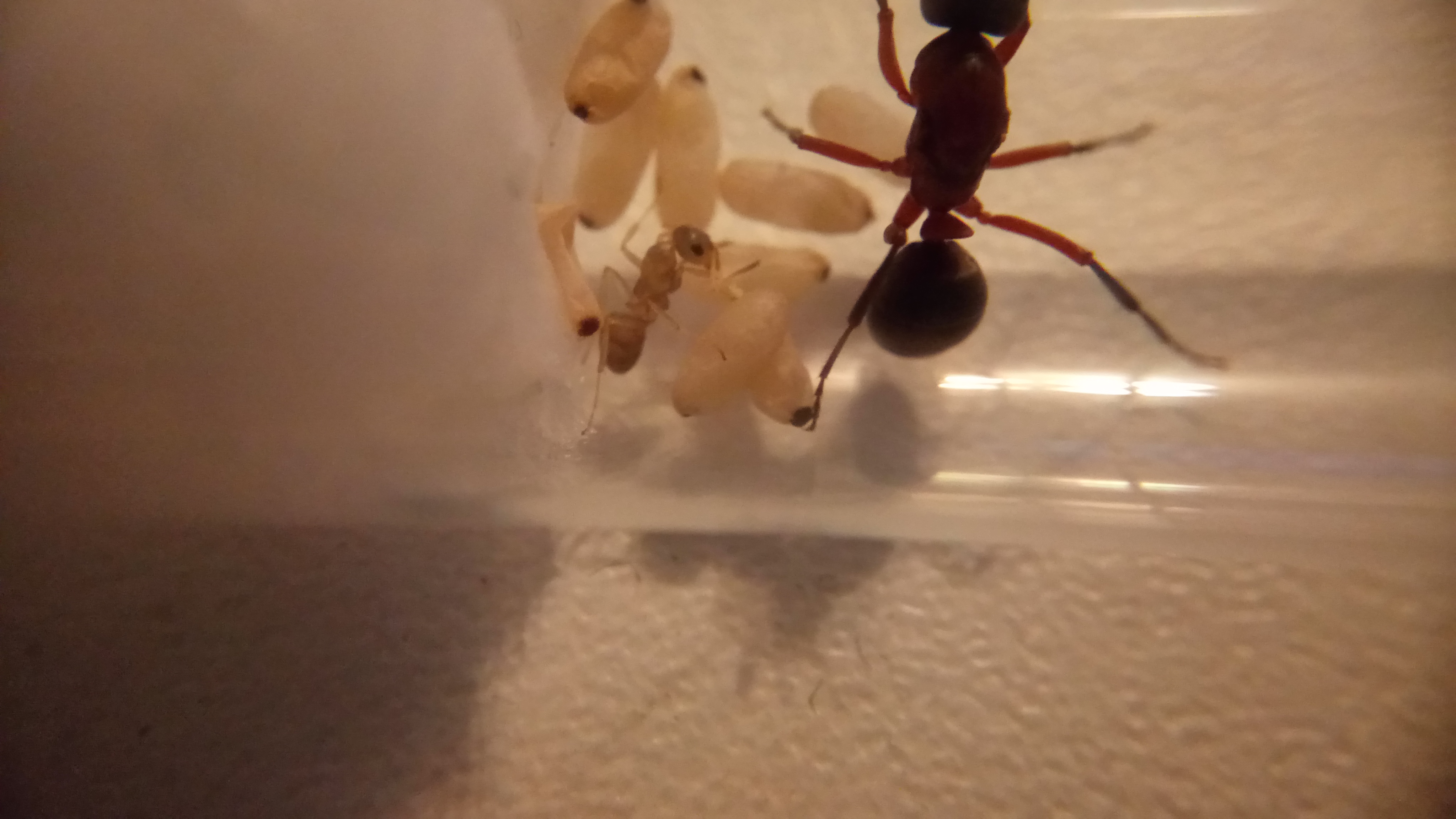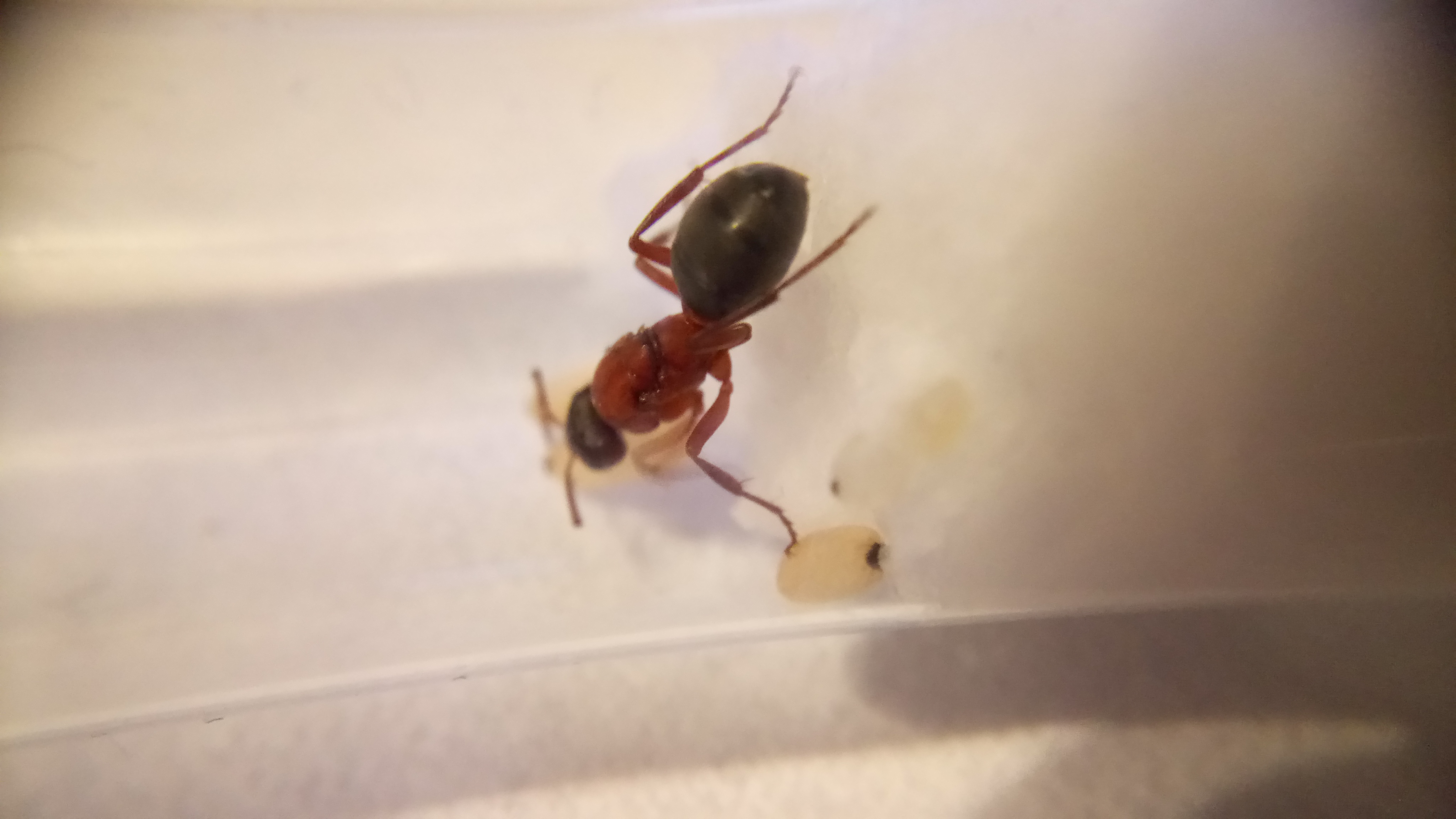 20.06.2018Es ist eine zweite Serviformica Arbeiterin geschlüpft! Gegen 6 Uhr morgens habe ich nochmal nach ihr gesehen und tatsächlich, eine zweite Arbeiterin. Das Bild stammt von Nachmittag, wo die Arbeiterin bereits etwas gefärbt war. Man sieht, dass die