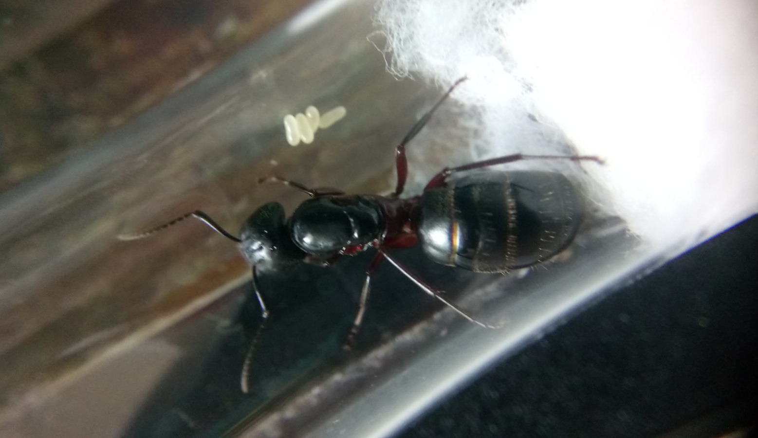 Vor 7 Tagen habe ich die Camponotus ligniperda Gyne gefangen. Nun habe ich nach ihr gesehen und sie hat tatsächlich schon 6 Eier.