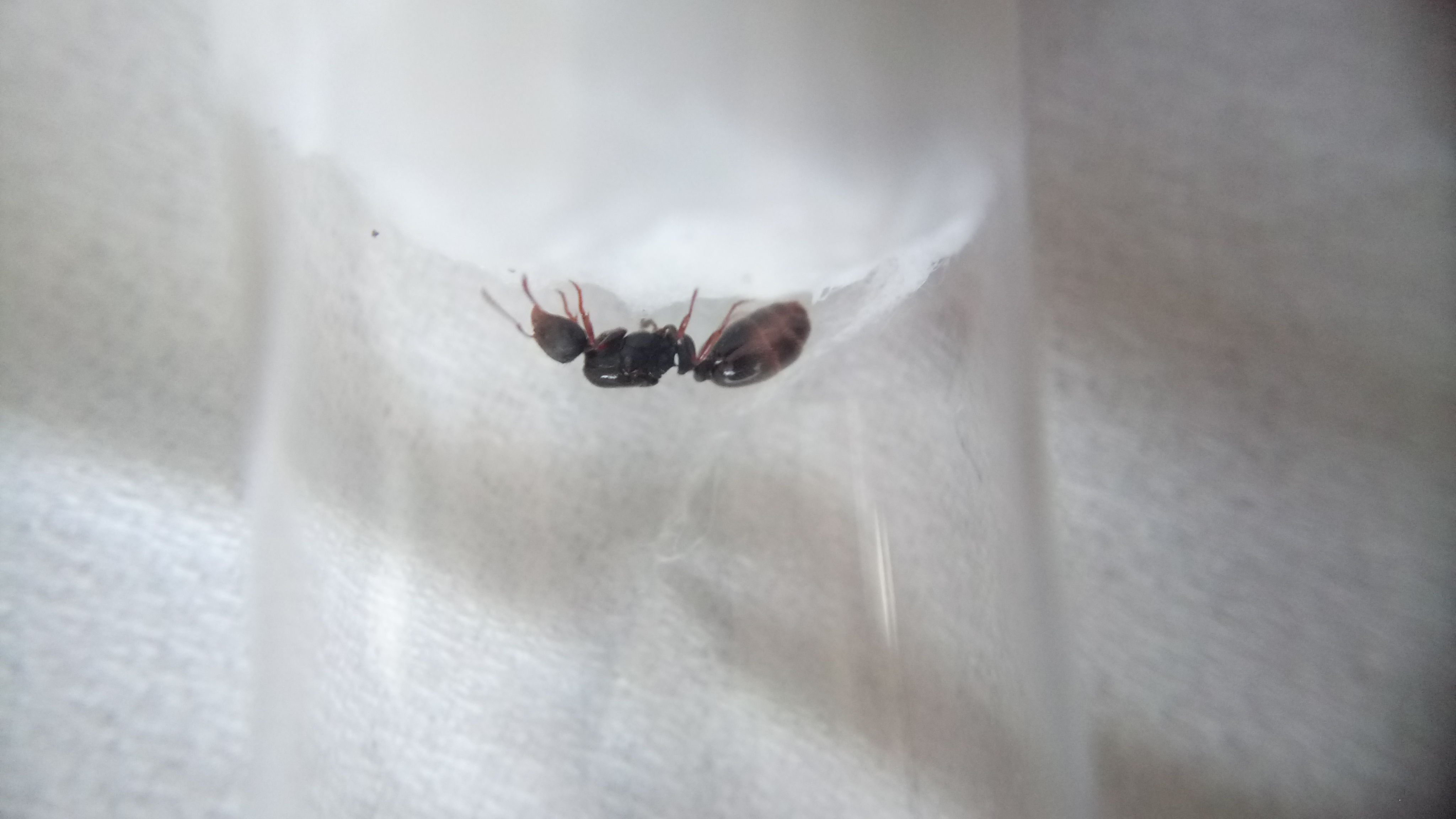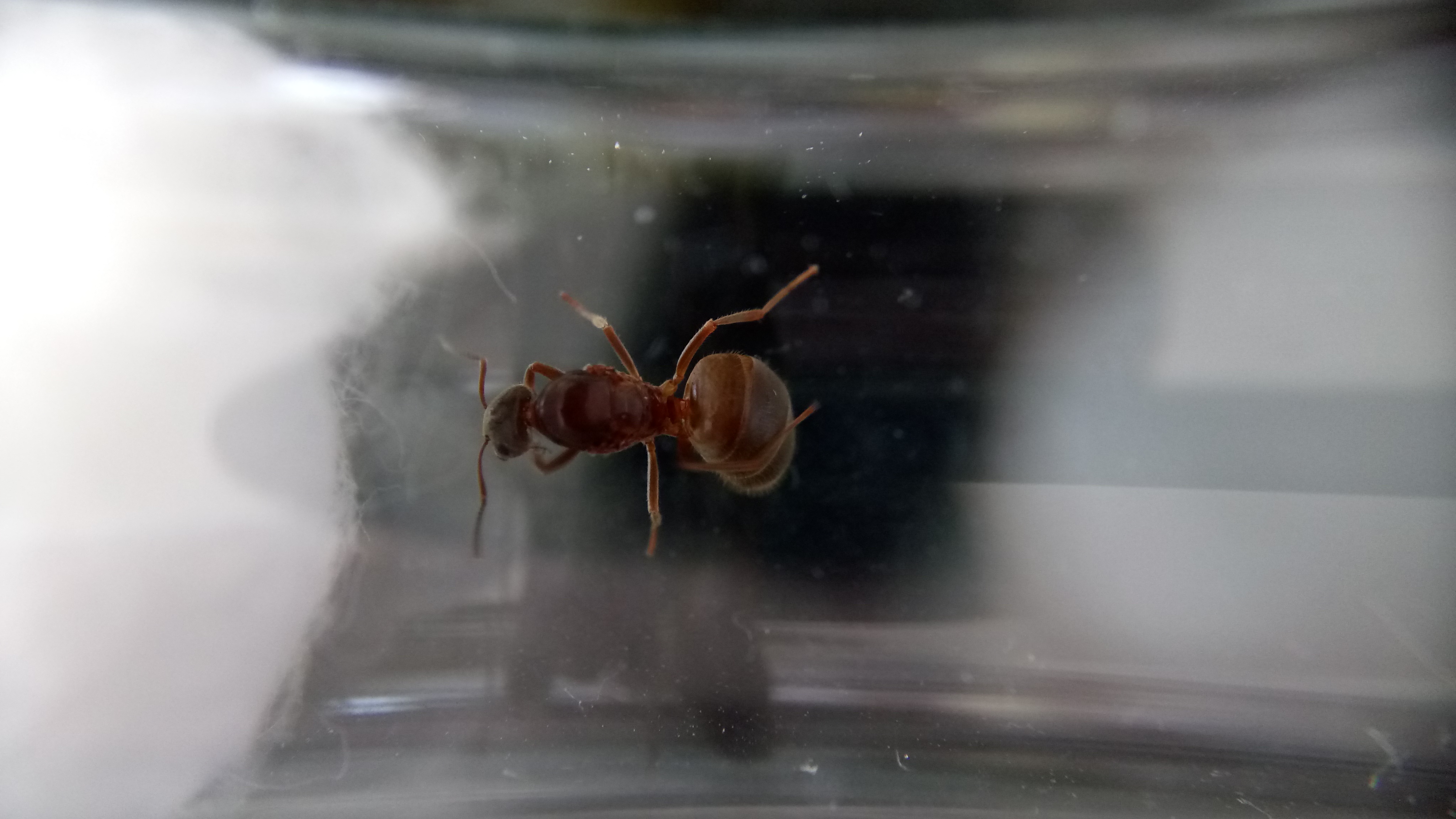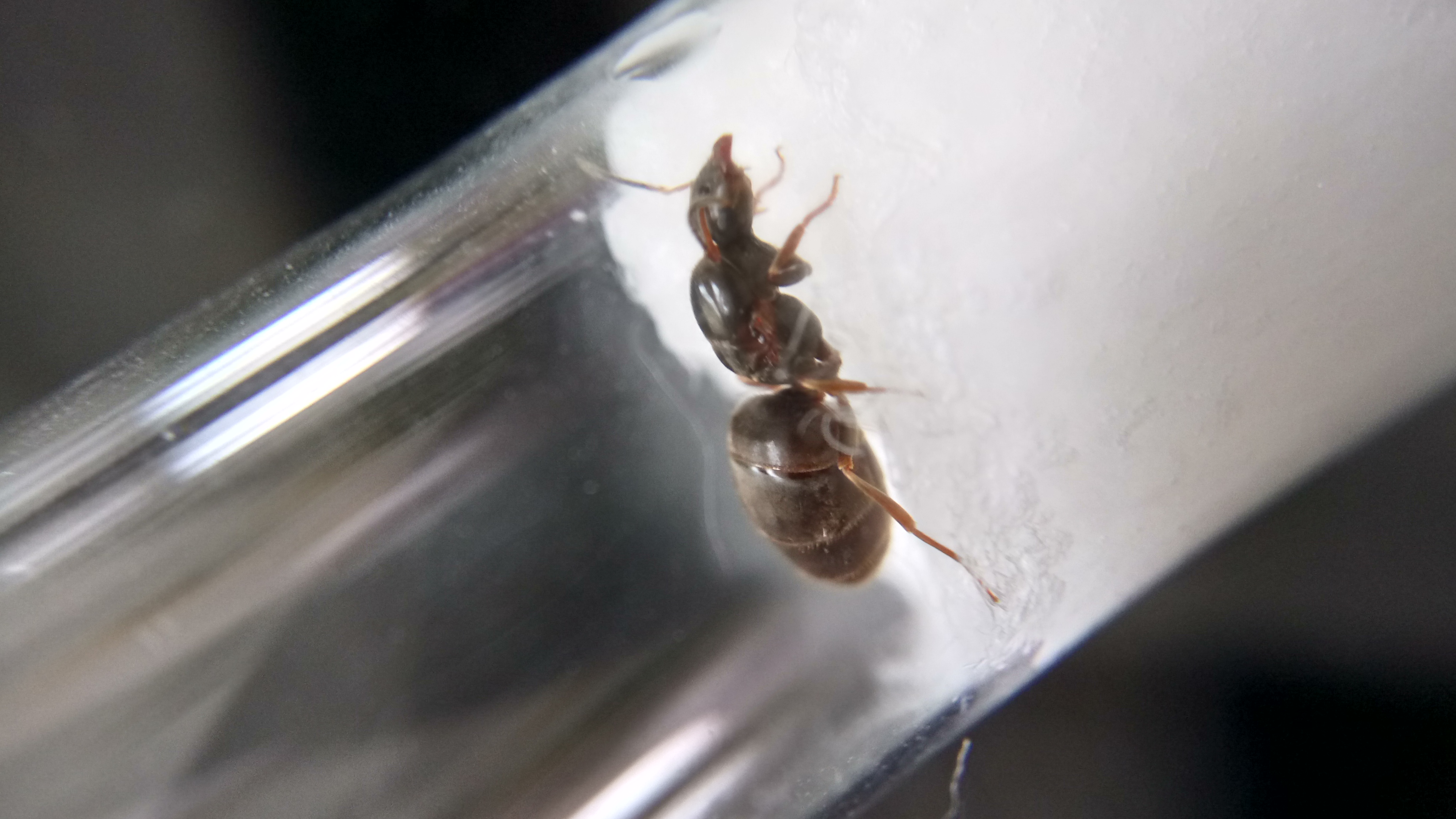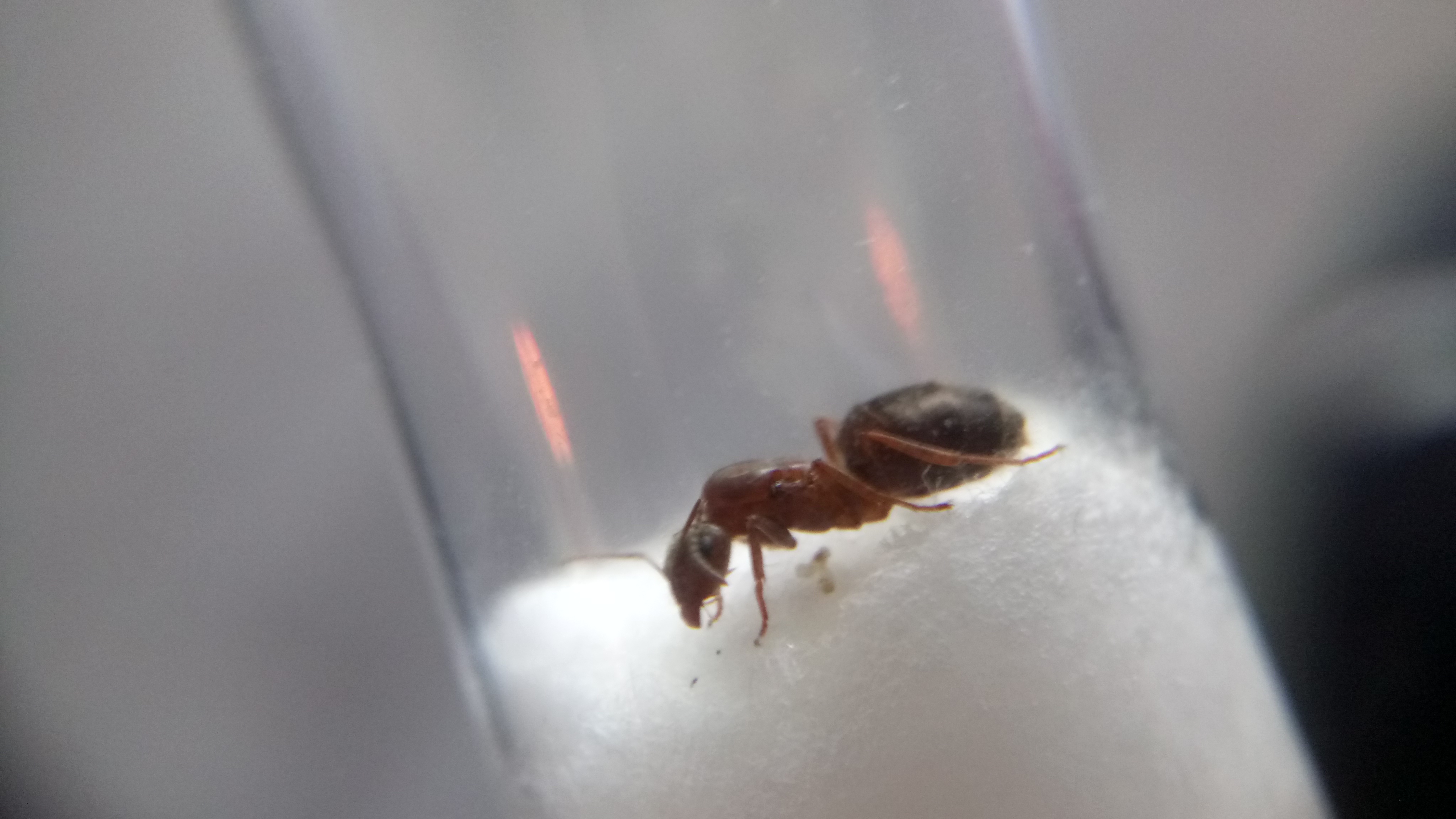 Gefunden habe ich sie in einer Stadt, als ich auf dem Weg zum Zug war. Provisorisch eingepackt habe ich sie, mit einem kleinen angefeuchtetem Stück Taschentuch, nach Hause transportiert. Dass es sich um Lasius emarginatus handelt und nicht um Lasius brunneus, konnte ich sofort feststellen. Im Gegensatz zu Lasius brunneus, die farblich teils an Lasius niger erinnern kann (markant ist hierbei dann das länglichere Gaster von Lasius brunneus), ist meine Gyne deutlich rötlich am Thorax gefärbt und weist ein schönes hellbraunes Gaster auf.