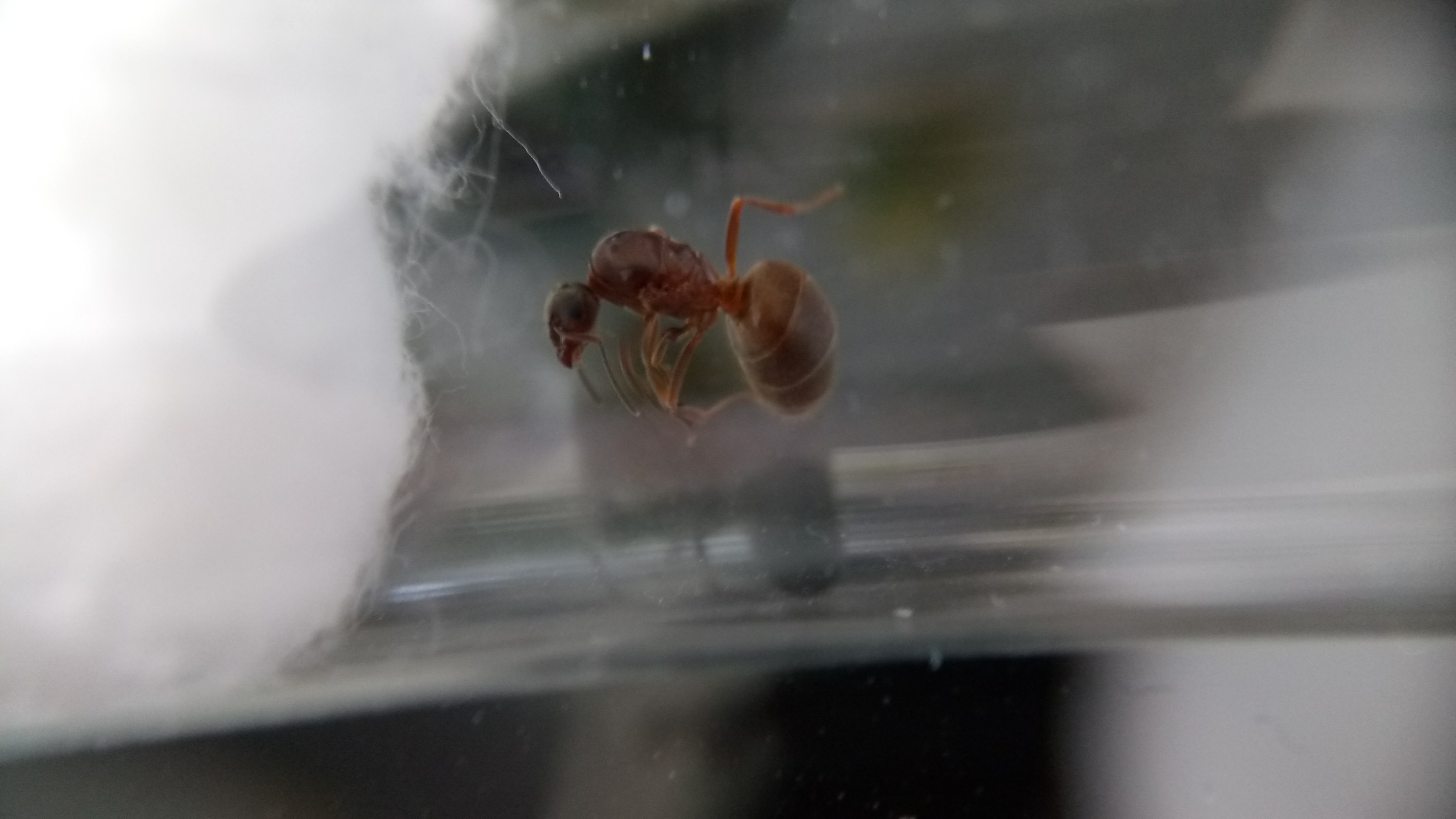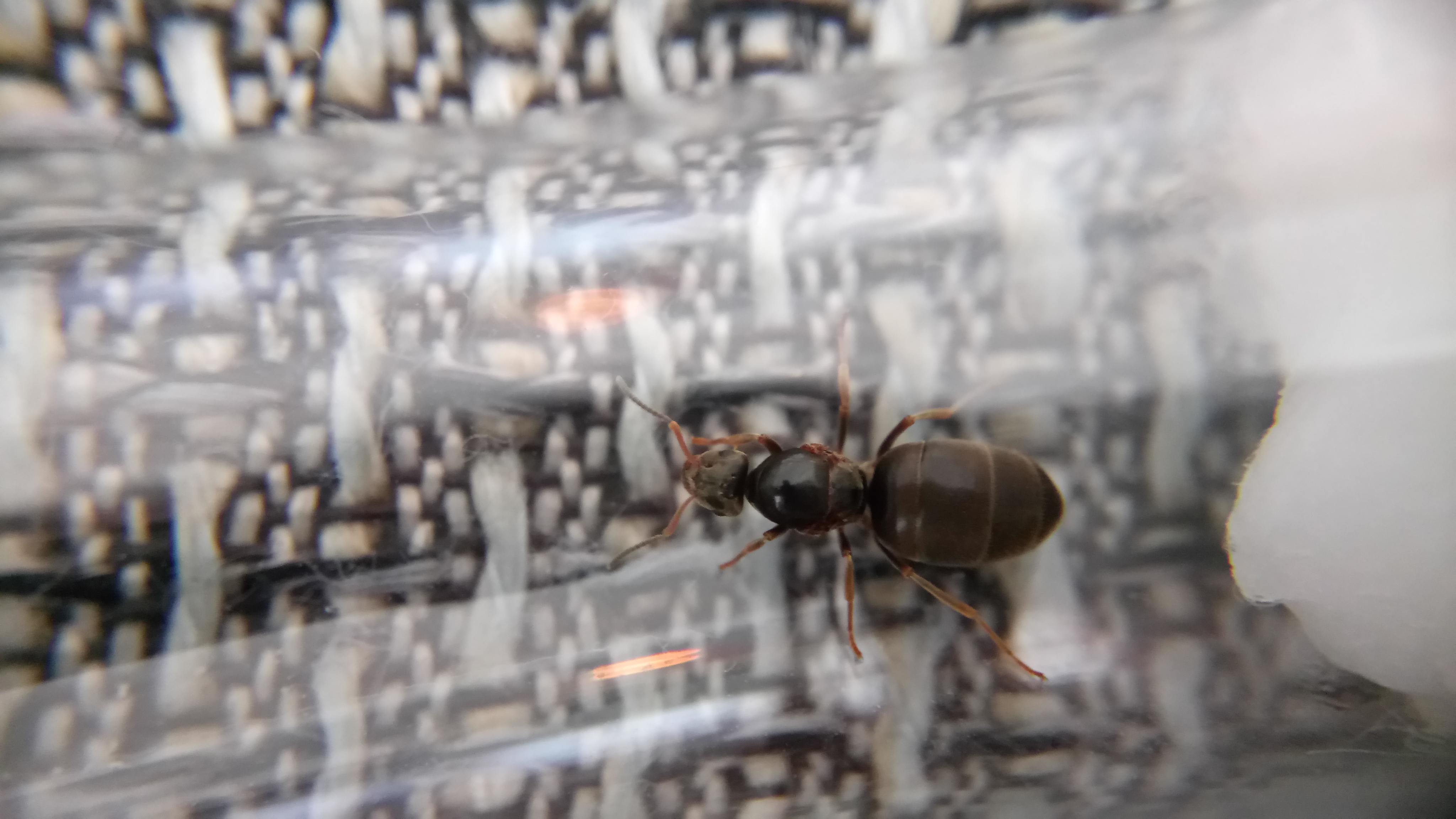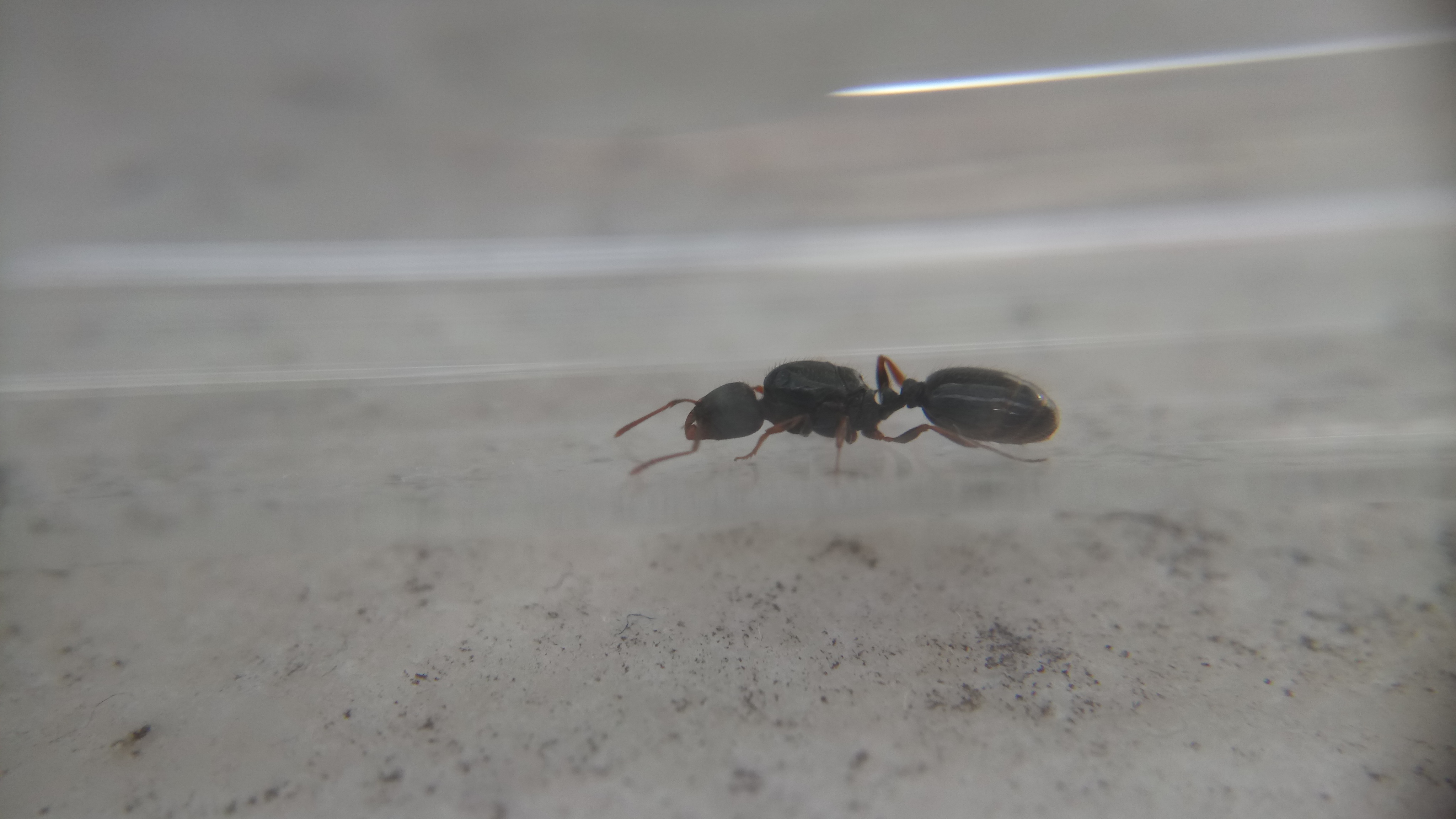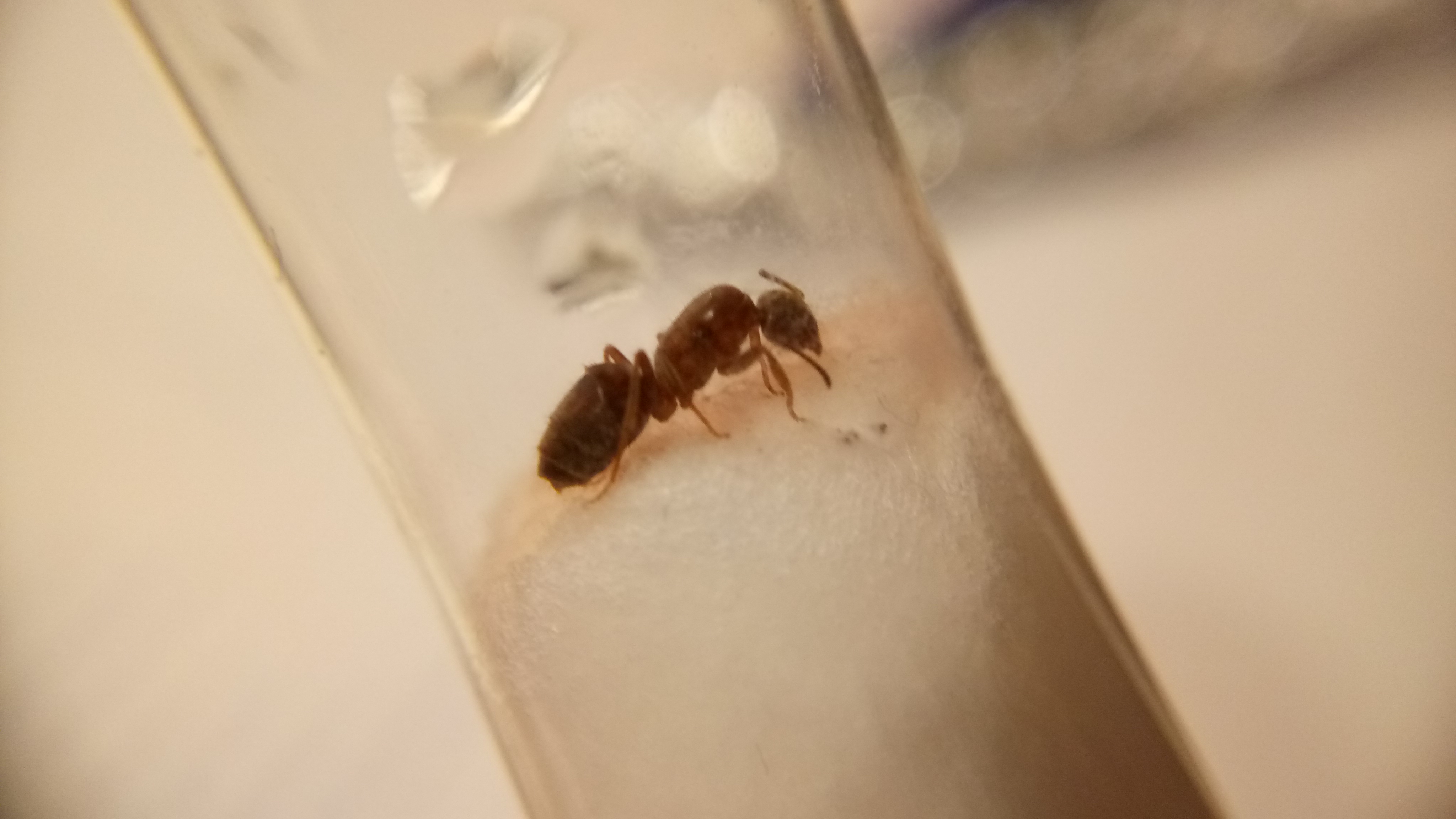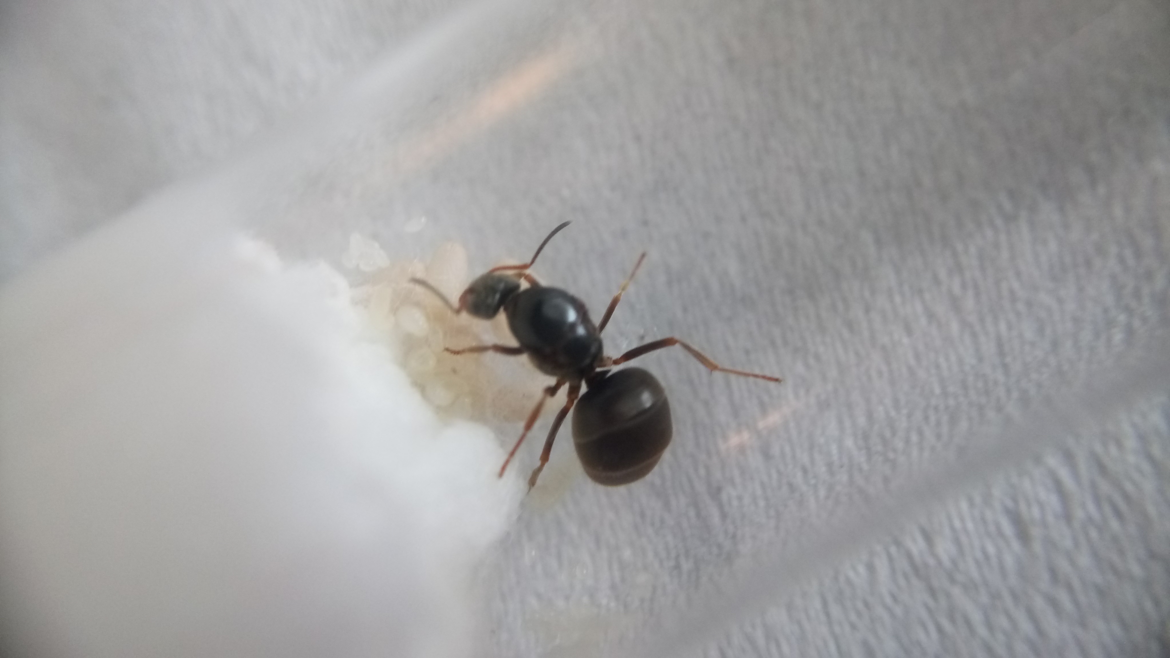 Gefunden habe ich sie in einer Stadt, als ich auf dem Weg zum Zug war. Provisorisch eingepackt habe ich sie, mit einem kleinen angefeuchtetem Stück Taschentuch, nach Hause transportiert. Dass es sich um Lasius emarginatus handelt und nicht um Lasius brunneus, konnte ich sofort feststellen. Im Gegensatz zu Lasius brunneus, die farblich teils an Lasius niger erinnern kann (markant ist hierbei dann das länglichere Gaster von Lasius brunneus), ist meine Gyne deutlich rötlich am Thorax gefärbt und weist ein schönes hellbraunes Gaster auf.