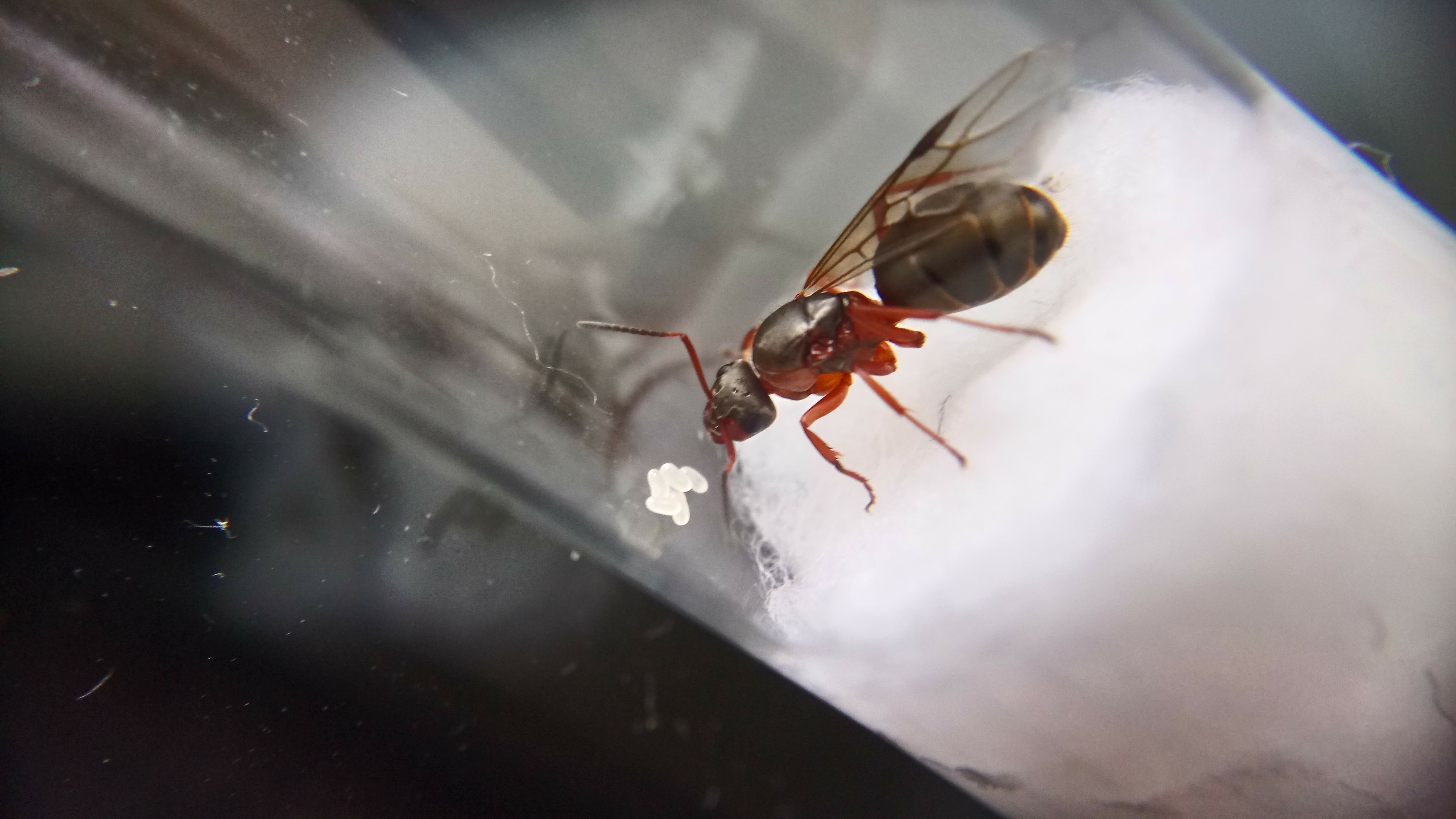 Im neuen Reagenzglas begann sie ziemlich schnell Eier zu legen. Mittlerweile hat sie 6 Eier. Den zweiten Flügel hat sie, wie man sieht, noch nicht abgeworfen. Vermutlich wird dies durch die ersten Arbeiterinnen geschehen.