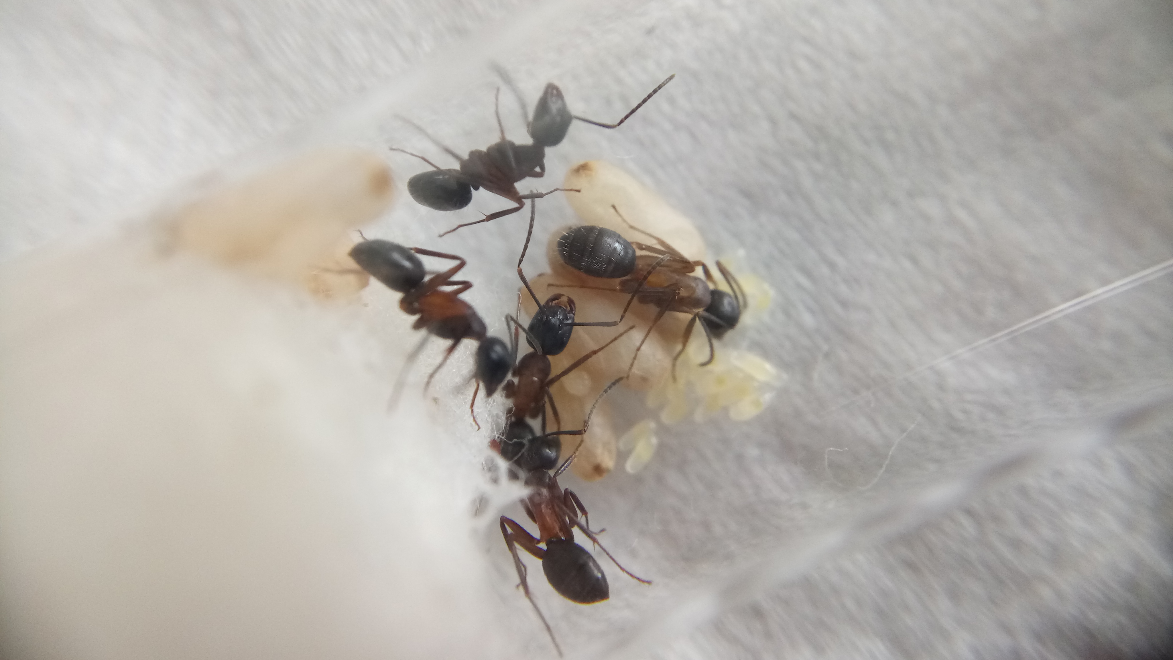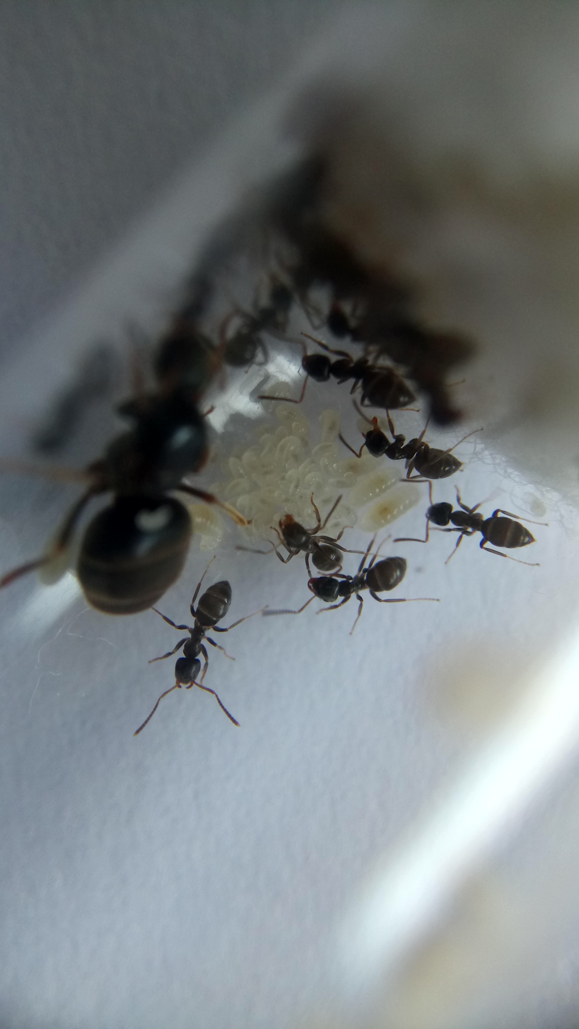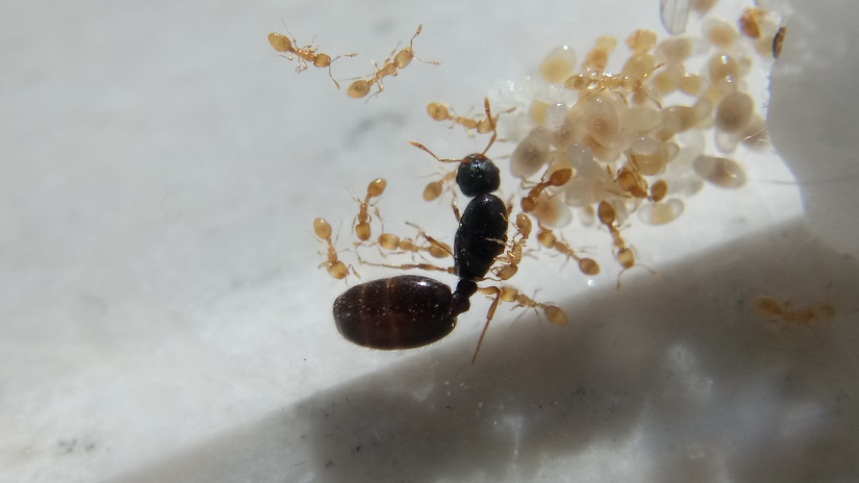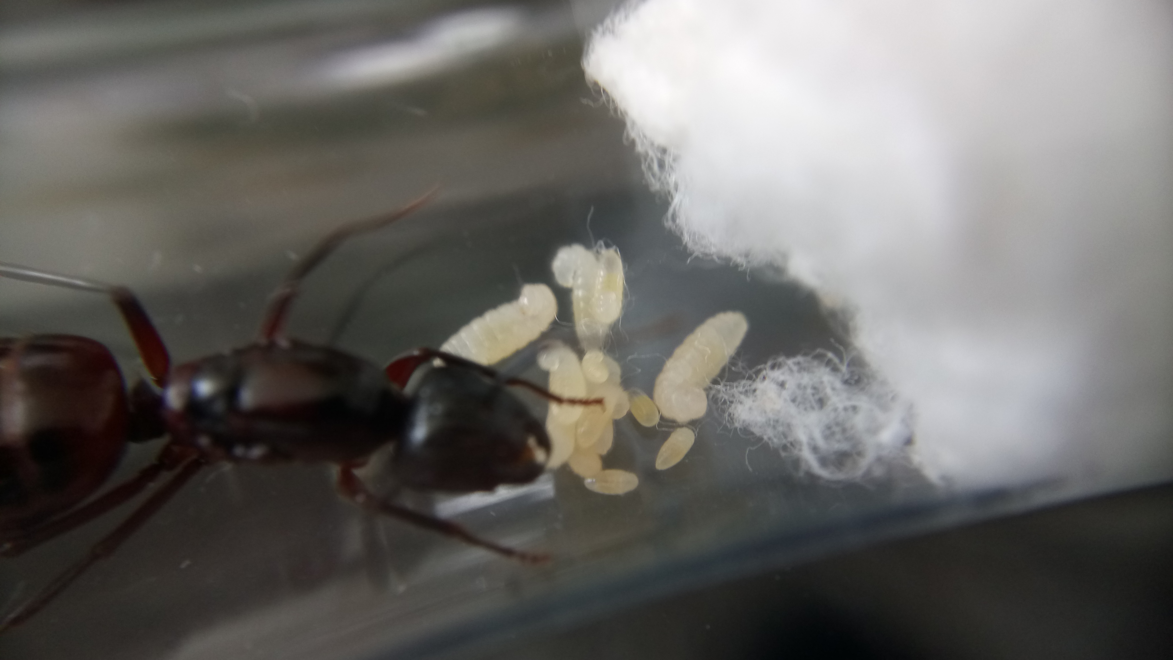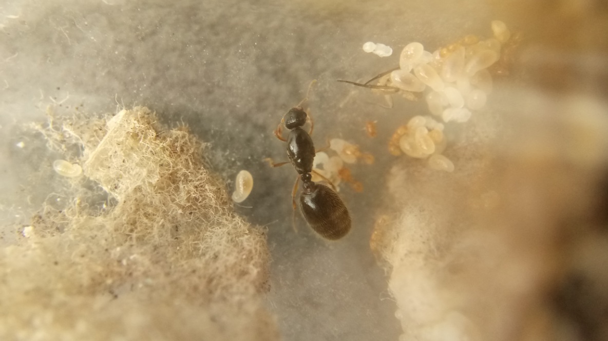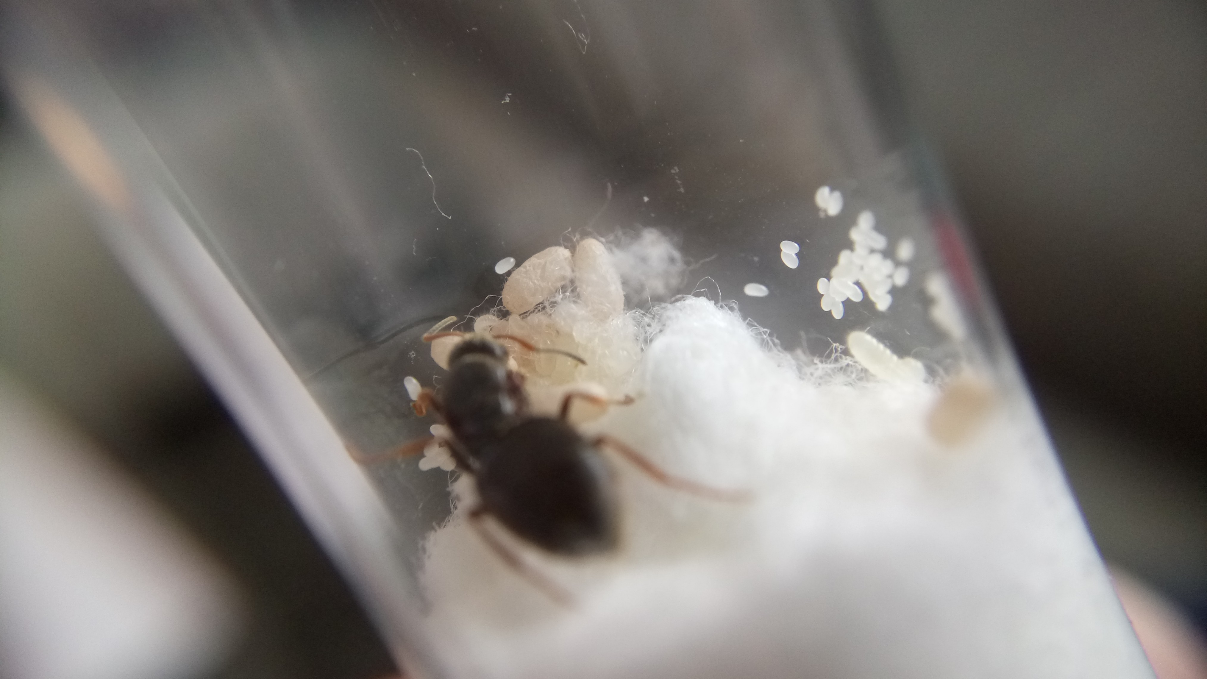 Die Gyne hat noch mehr Eier gelegt und erste Larven sind geschlüpft.