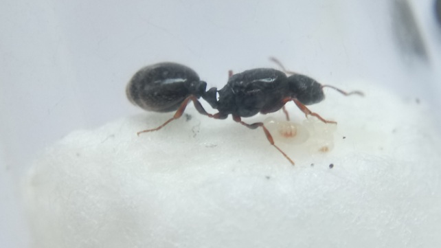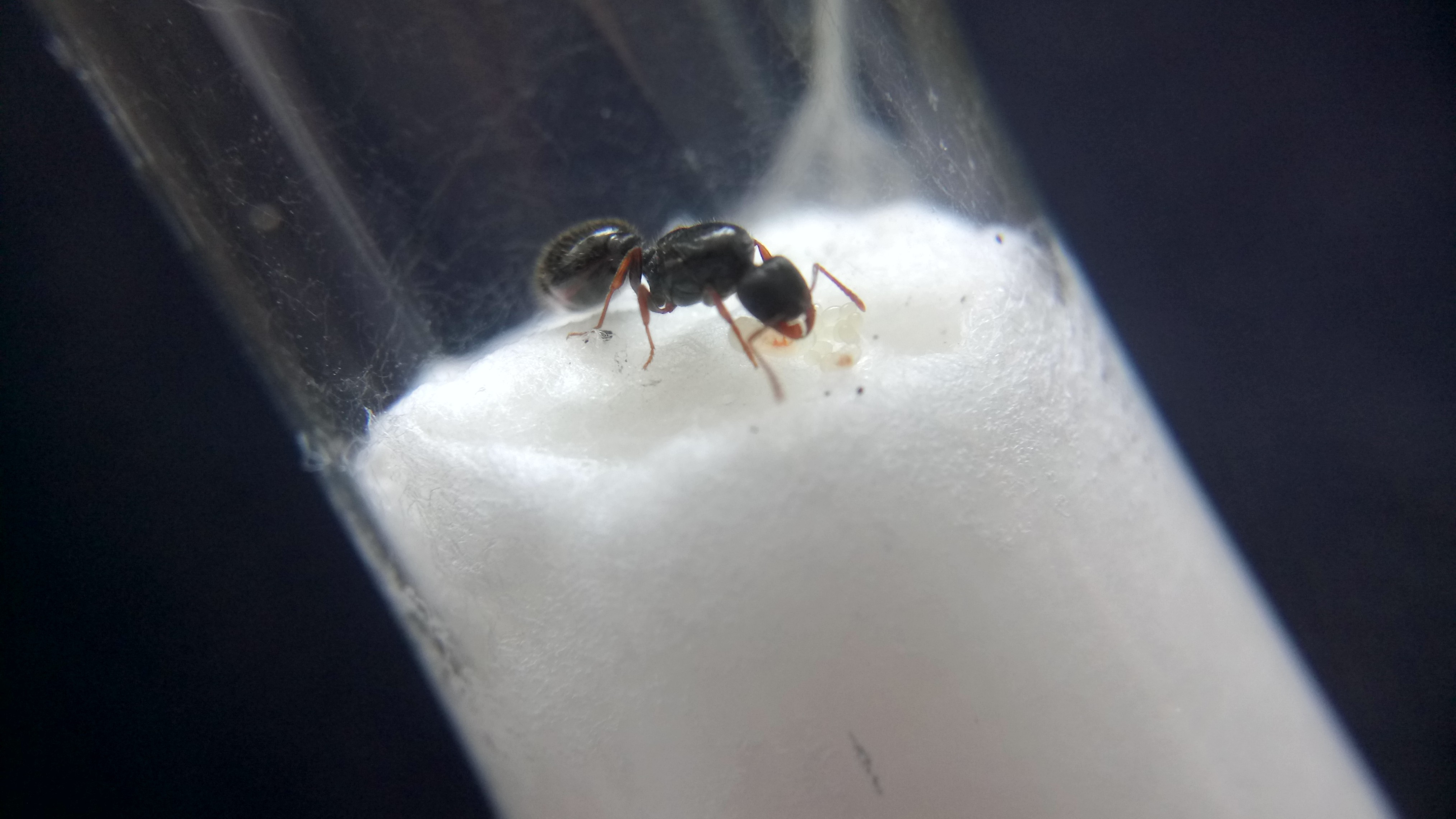 Die Kolonie umfasst nun 3 kleine Arbeiterinnen und einige Larven.