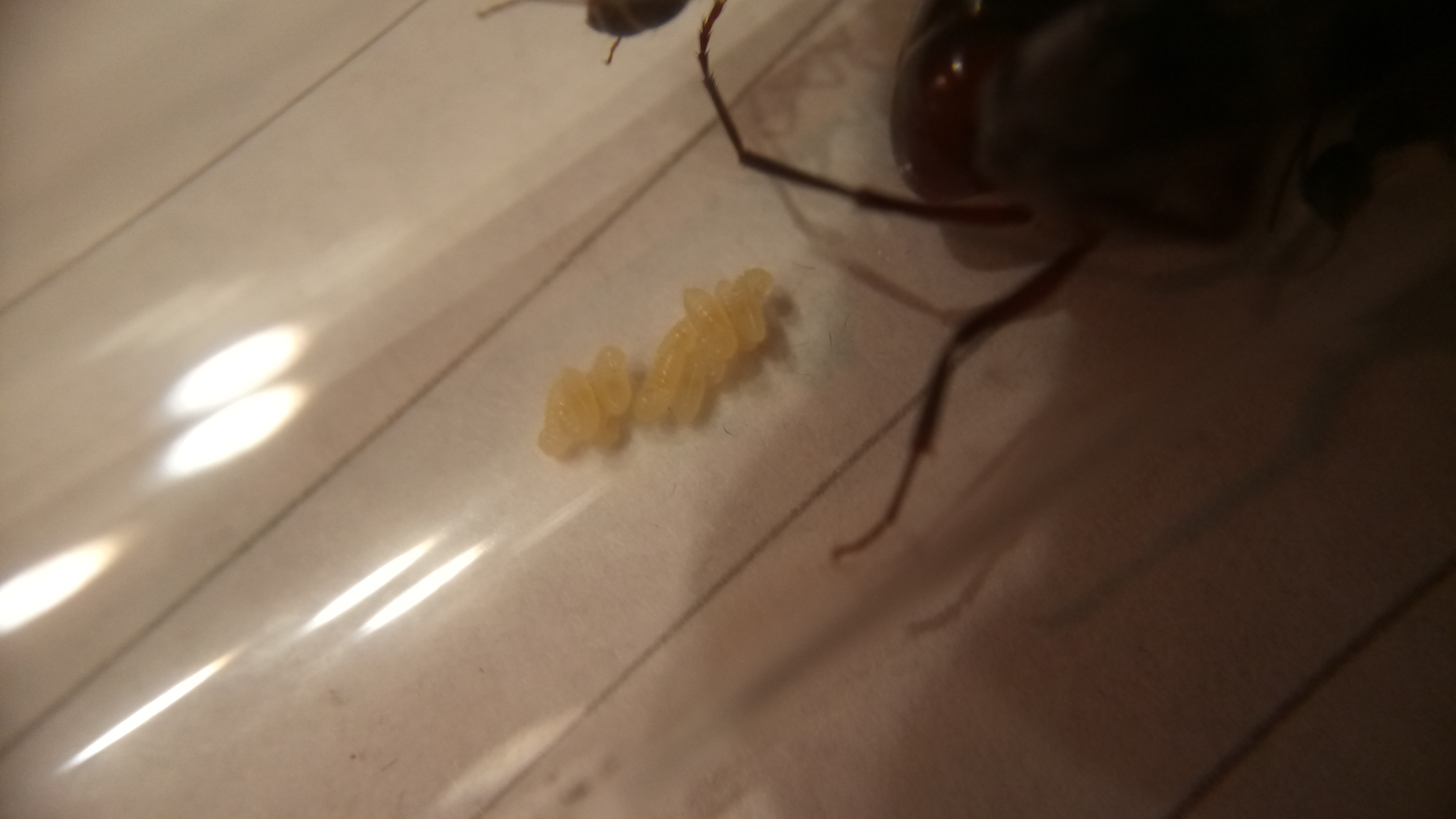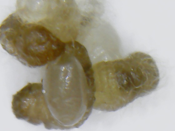 Außerdem sind gut 15 kleine Larven und Eier vorhanden, sowie 5 weitere Puppen.