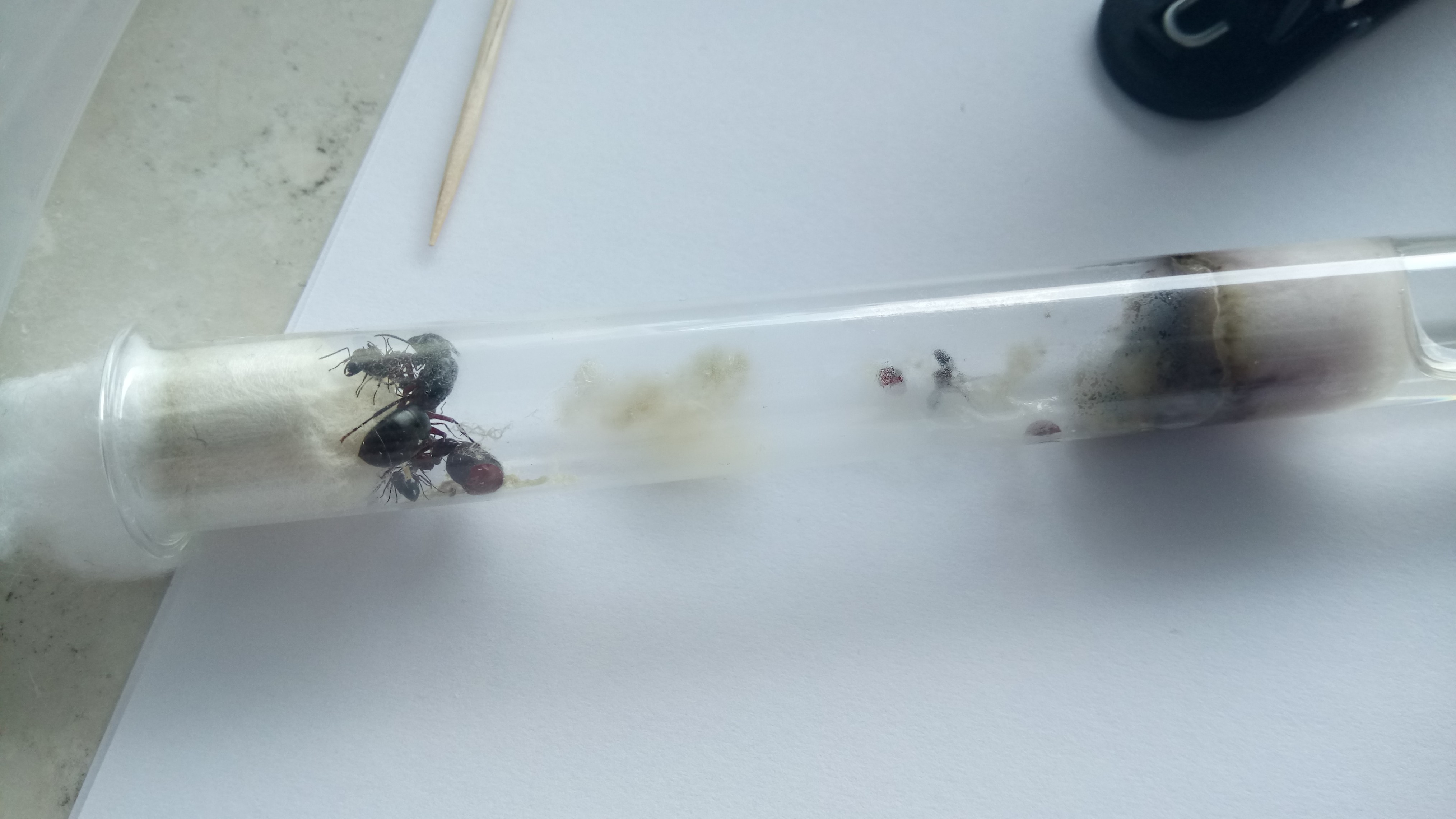 Nachdem die Gyne versucht hatte, aus dem Reagenzglas zu kommen und keine Eier legte, habe ich sie in ein neues RG umgesiedelt. Ich habe bei dieser eine neue Watte verwendet, die deutlich dichter als die vorherige ist, daher war der Stopfen zu fest und entsprechend zu trocken das RG.