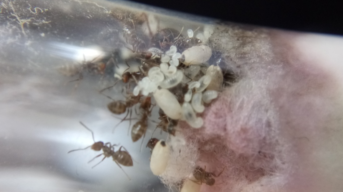 Die Gyne entwickelt sich gut und hat einige Larven in verschiedenen Größen.