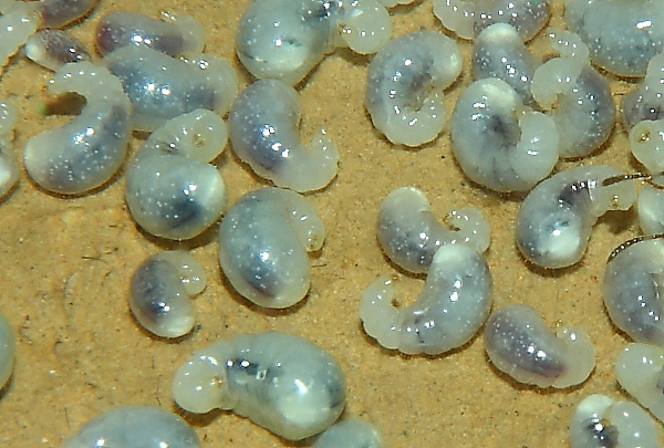 Larven sind weiß, feuchtglänzend und länglich mit einem spitzen Körperende, an dem sich ihr Maul befindet.