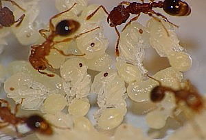 Sollten Eier einmal von einer Kolonie oder einer gründenden Königin gefressen werden, ist das ein Zeichen dafür, dass der Kolonie zu wenig Nahrung, vor allem zu wenig Eiweiß, zur Verfügung steht.