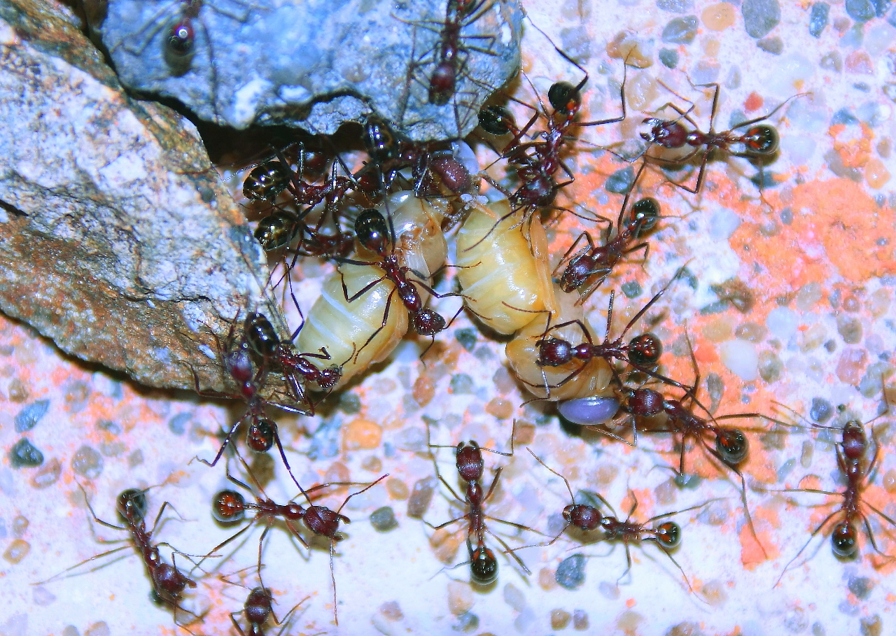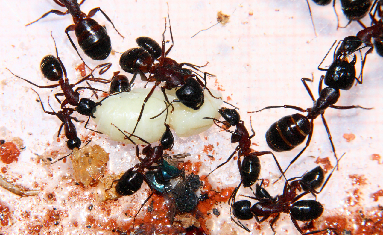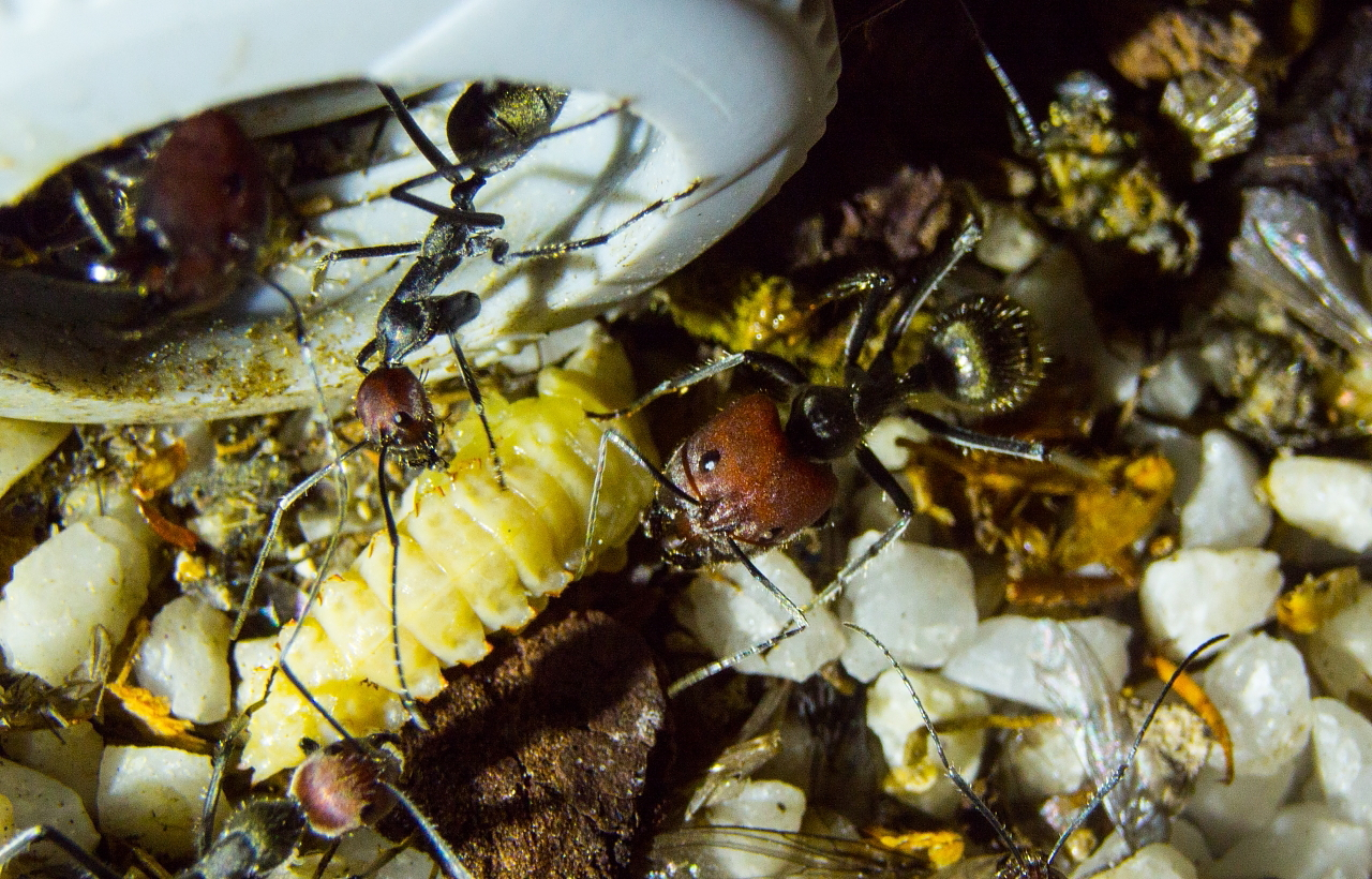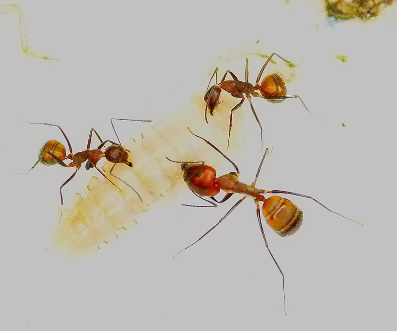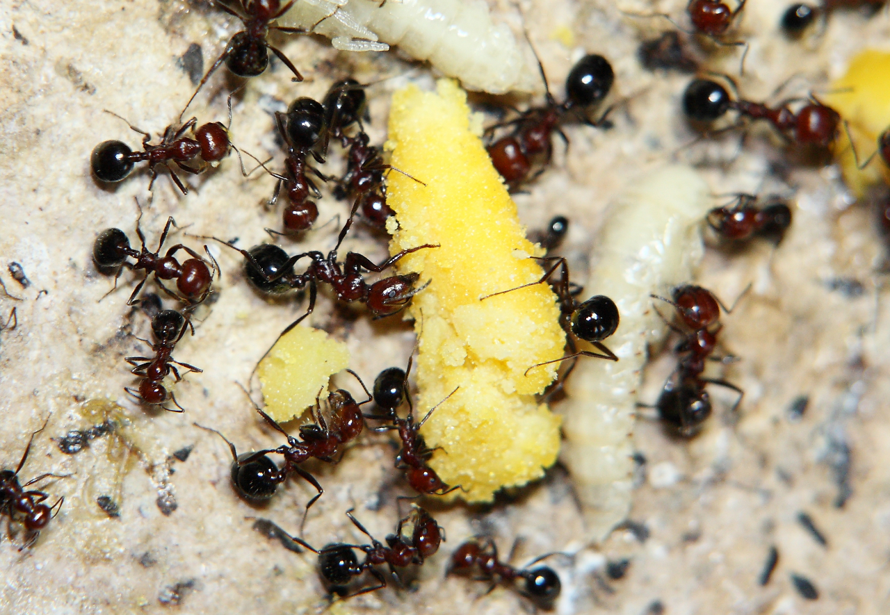 Für kleinere Arten und Völkern mit wenigen Ameisen hilft es die Larven zu zerkleinern.