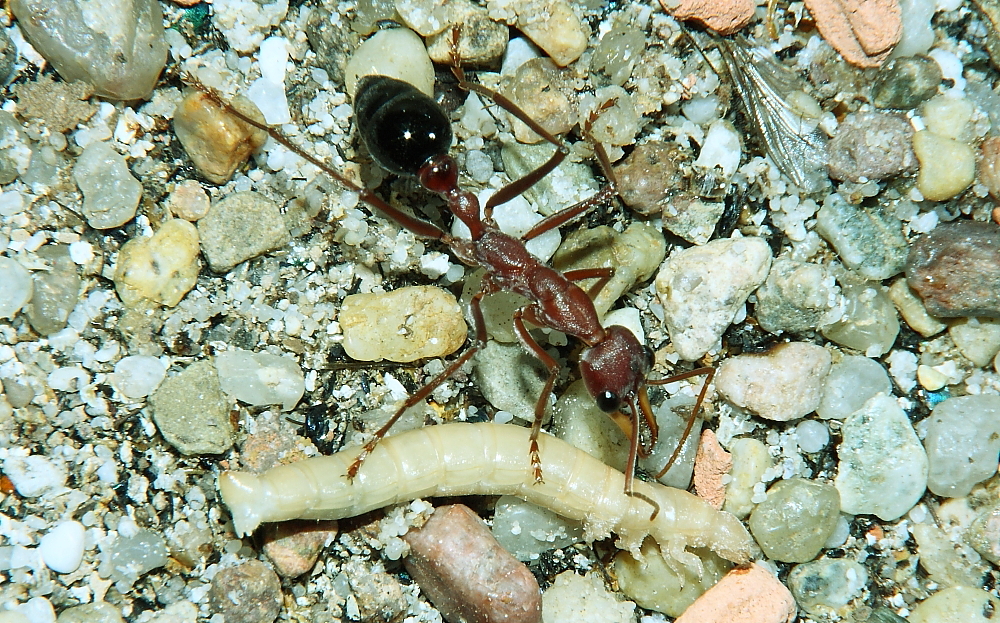 Myrmecia pavida mit Mehlkäferlarve 1