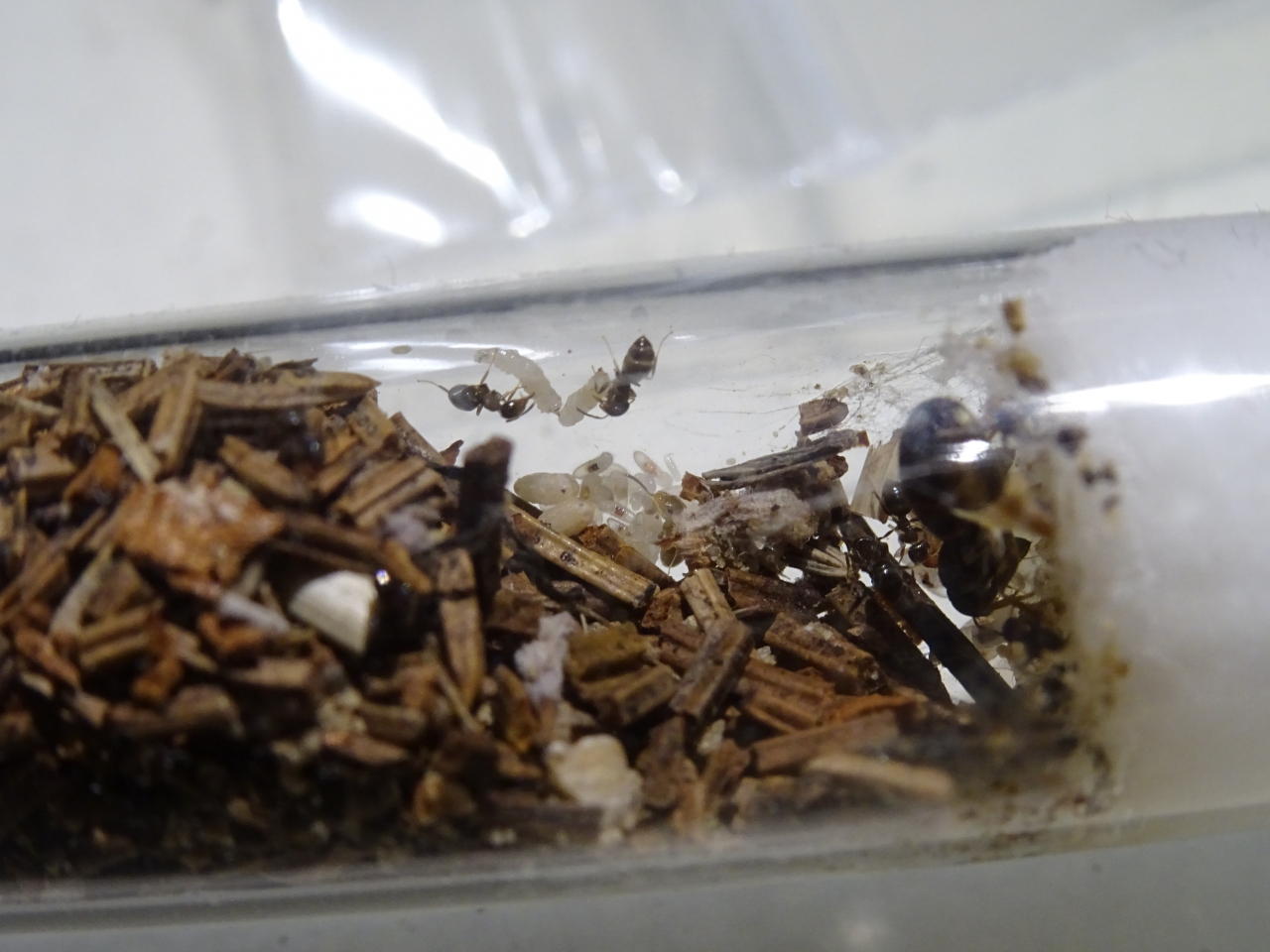 Lasius brunneus - Brut Lagerstätte, drüber kleben die zwei Würmchen am Glas und werden von den Arbeiterinnen bearbeitet.