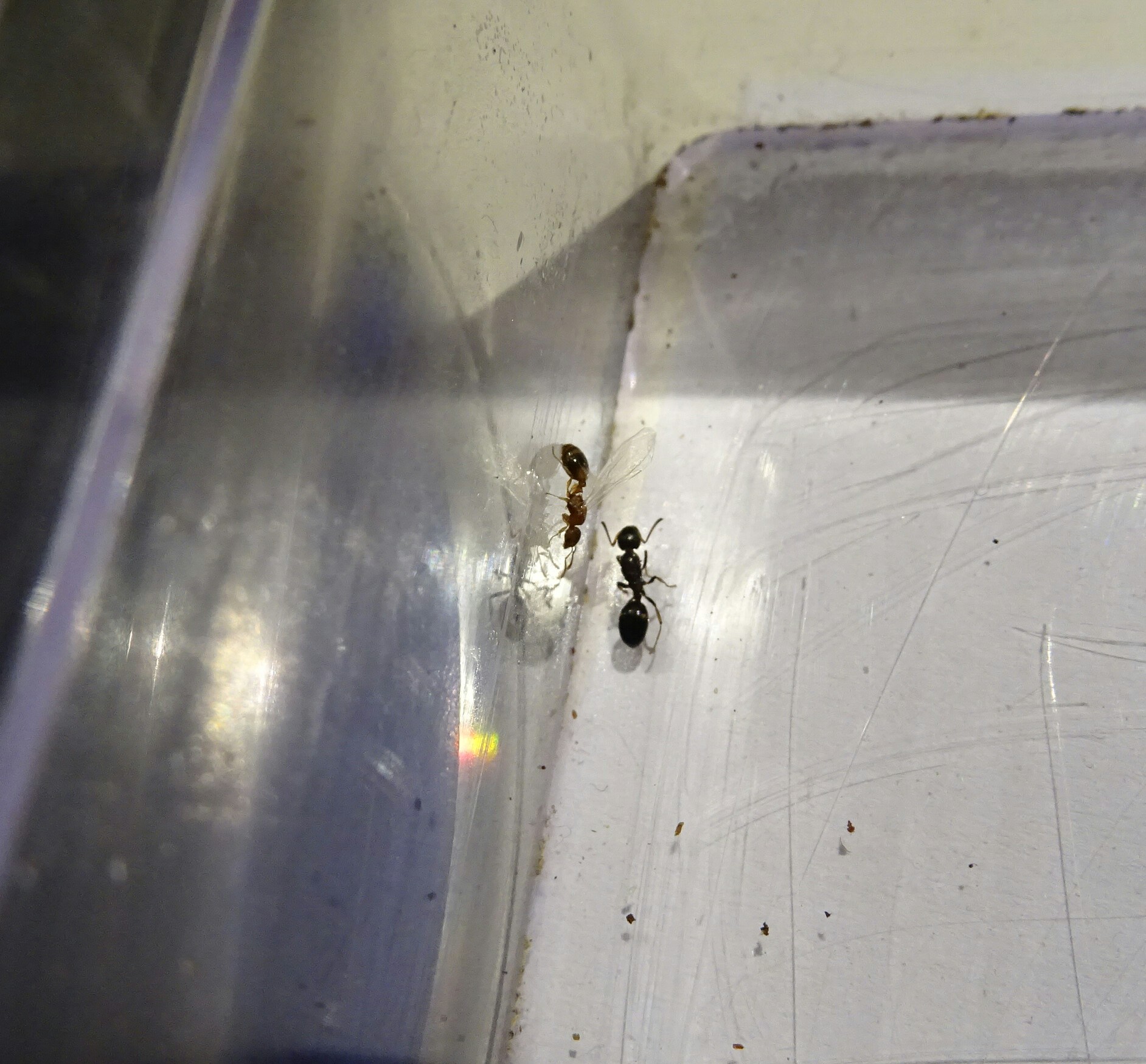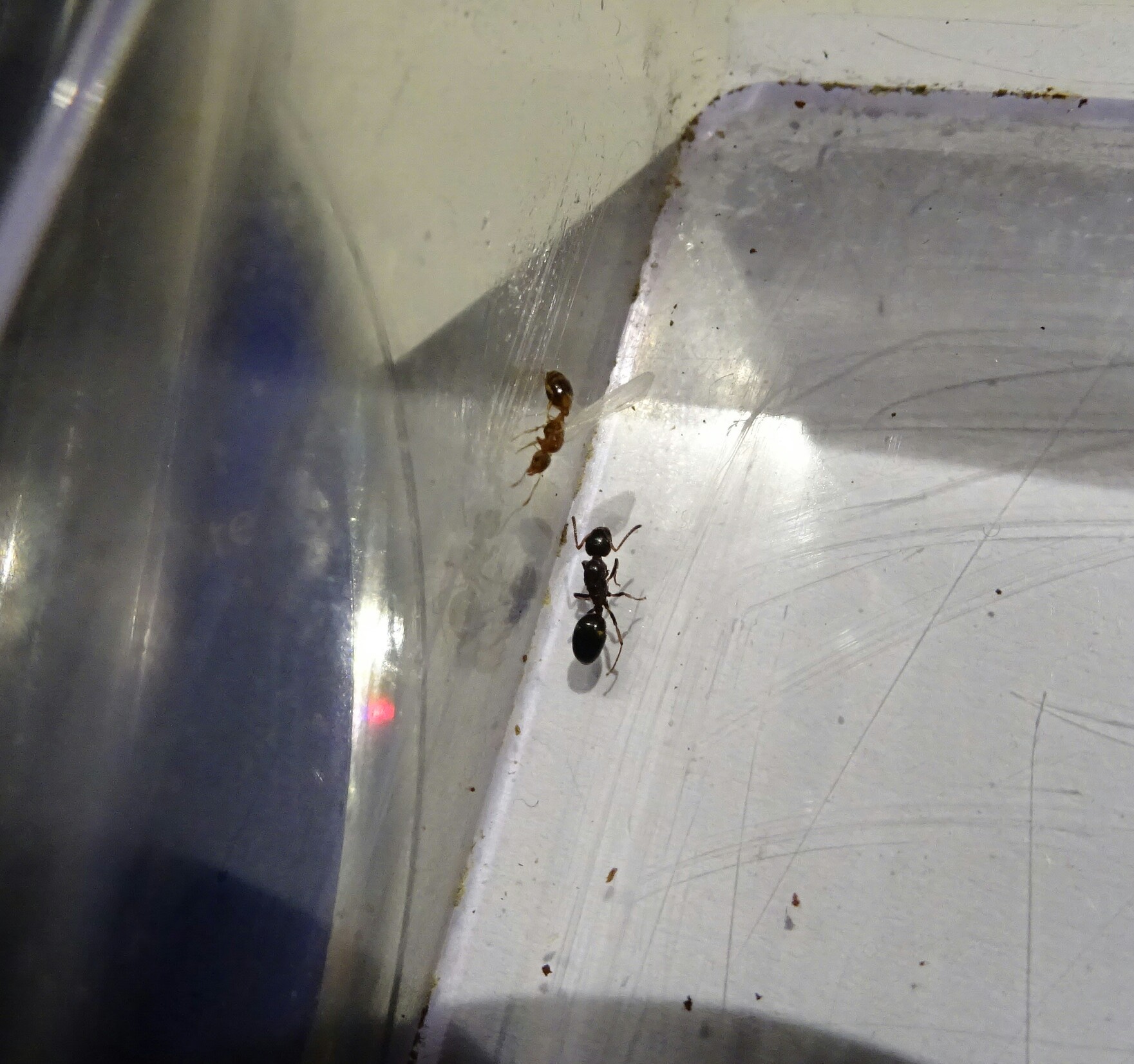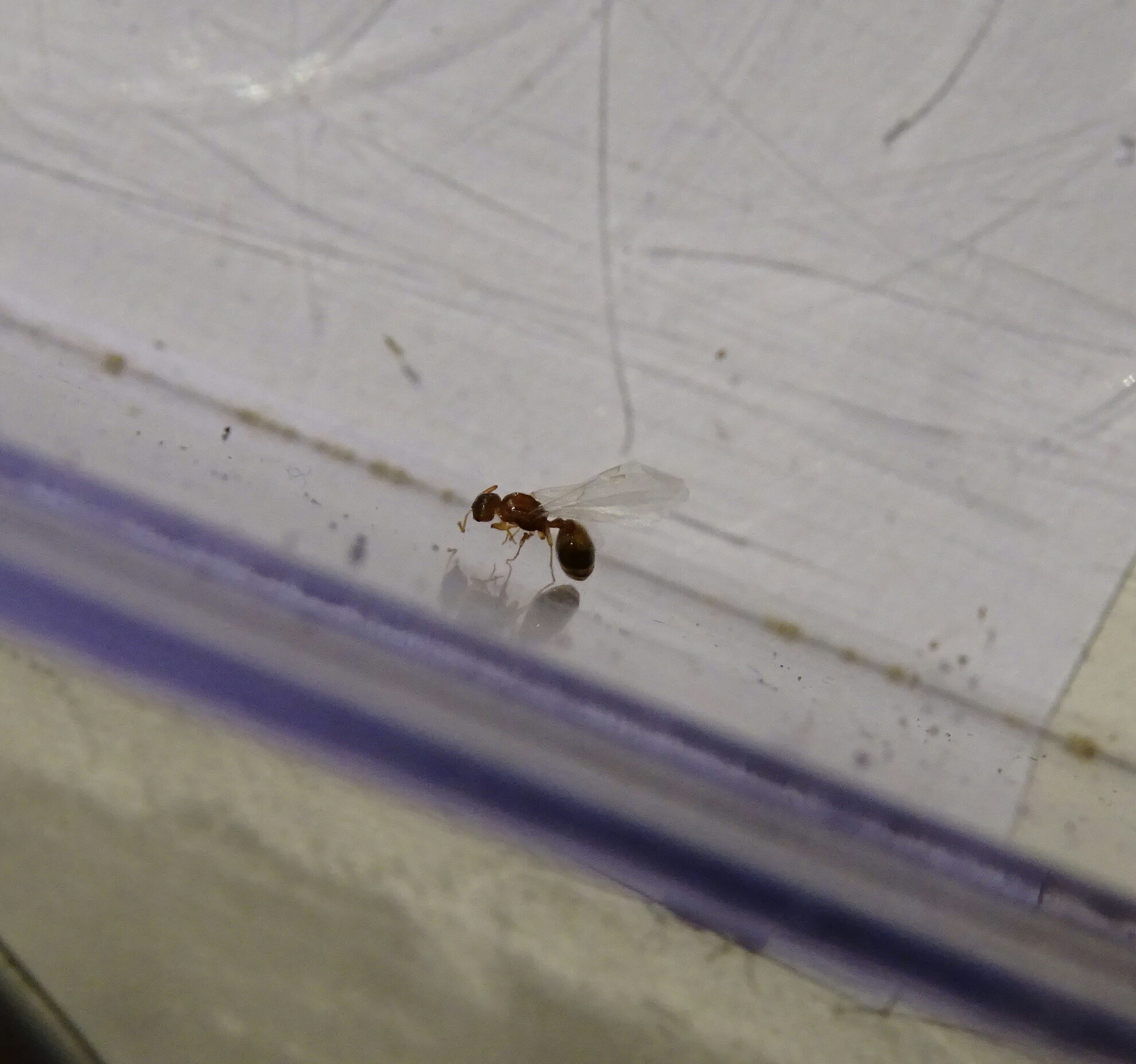 Bei der 3. Gyne habe ich keinen blanken Schimmer. Sicher ist lediglich(aber auch nicht zu 100%); Knotenameise. Sie saß reglos auf einem Blatt, auf dem eine Formica cf. fusca-Arbeiterin fouragierte. Ich hielt sie zuerst für die Arbeiterinnen einer Tetramorium sp., dafür war sie dann aber doch ein bisschen groß. Ich beförderte also auch diese vorsichtig in ein RG, um festzustellen, dass es ebenfalls eine Königin war.
