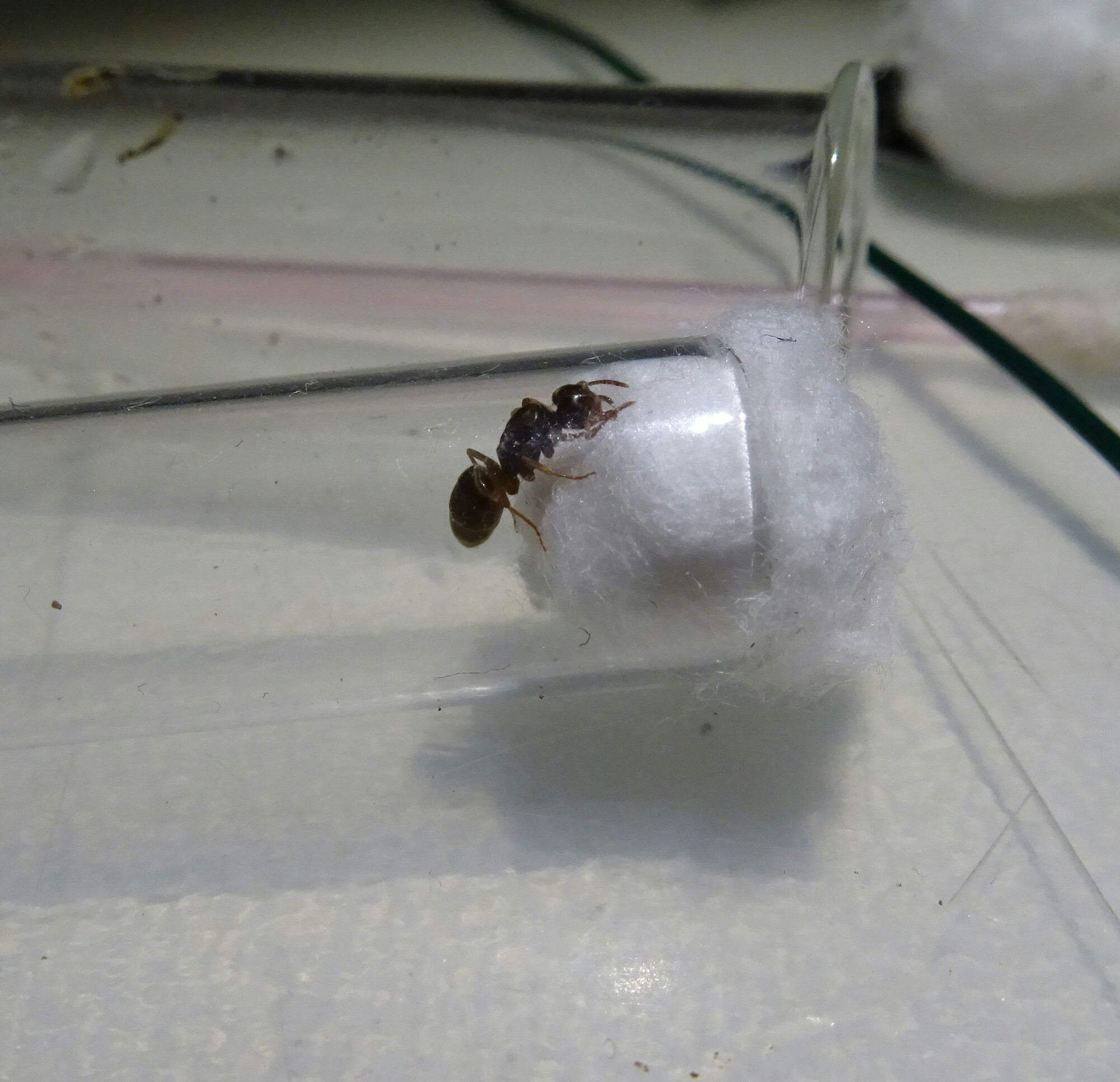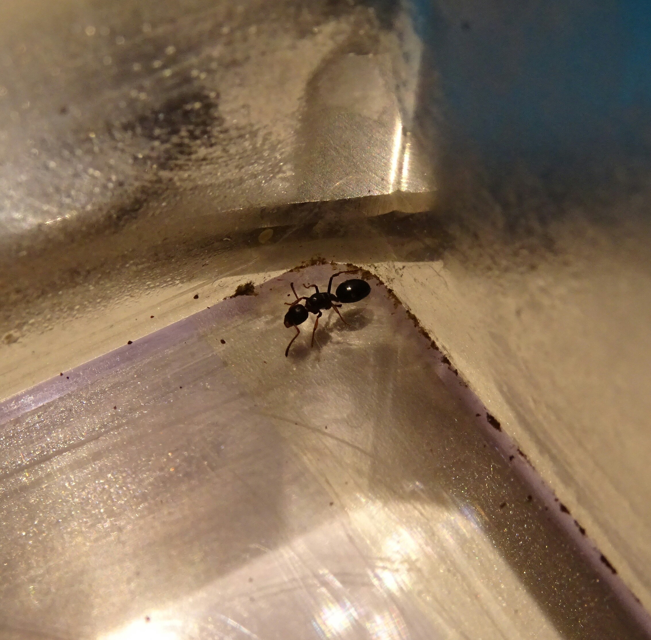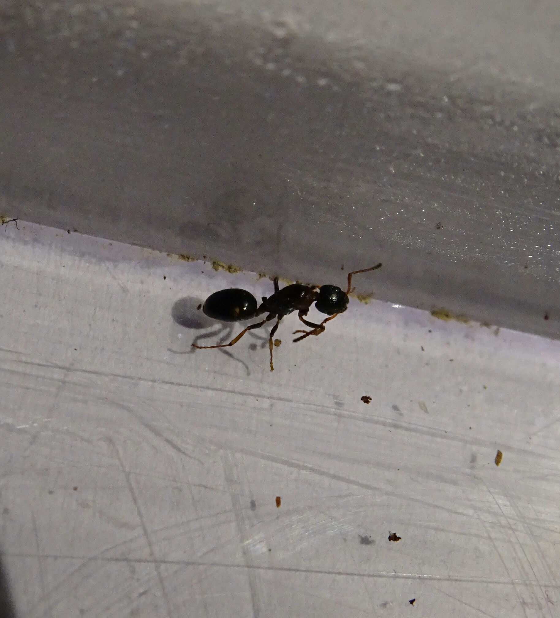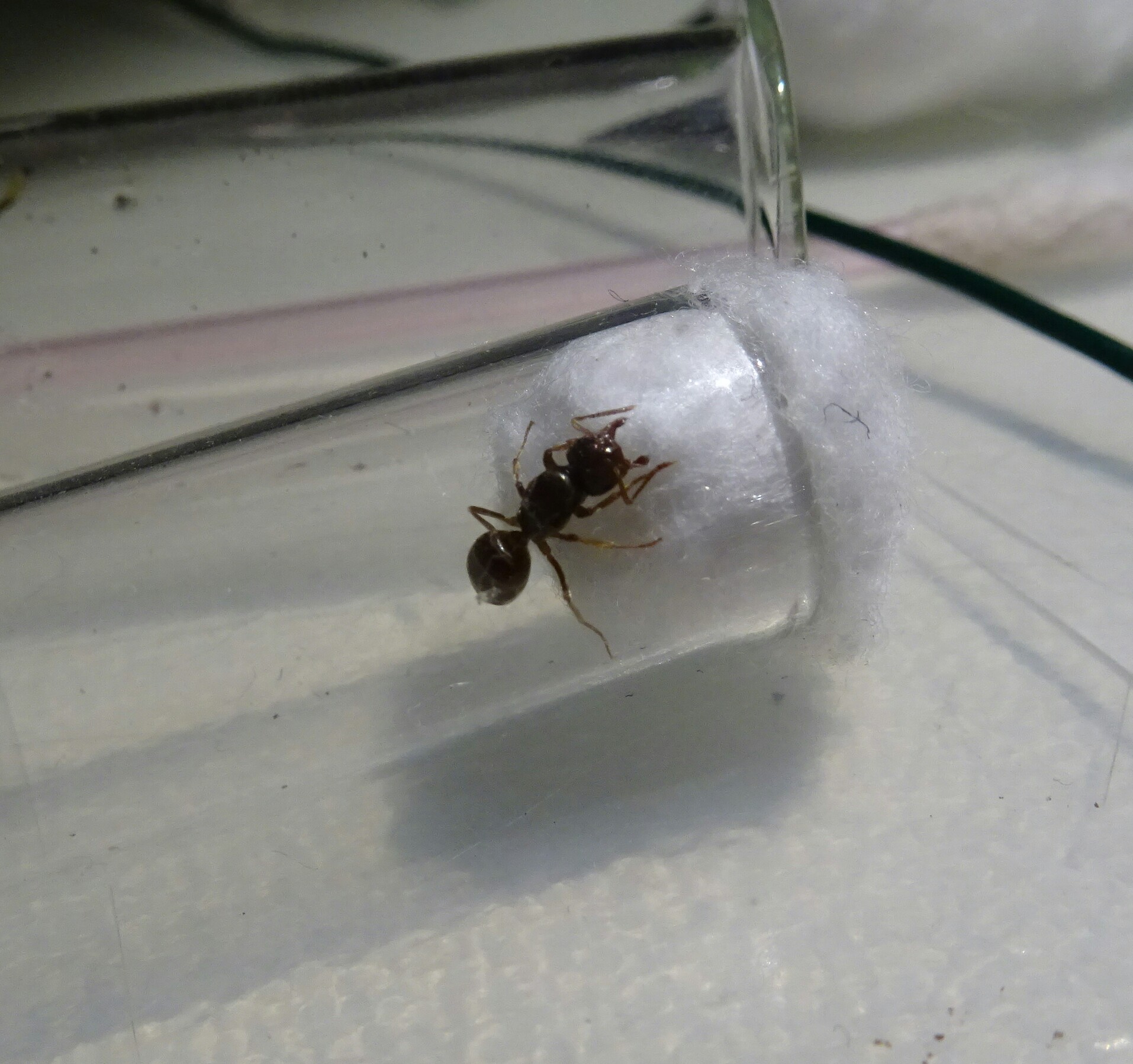 Bei der 3. Gyne habe ich keinen blanken Schimmer. Sicher ist lediglich(aber auch nicht zu 100%); Knotenameise. Sie saß reglos auf einem Blatt, auf dem eine Formica cf. fusca-Arbeiterin fouragierte. Ich hielt sie zuerst für die Arbeiterinnen einer Tetramorium sp., dafür war sie dann aber doch ein bisschen groß. Ich beförderte also auch diese vorsichtig in ein RG, um festzustellen, dass es ebenfalls eine Königin war.