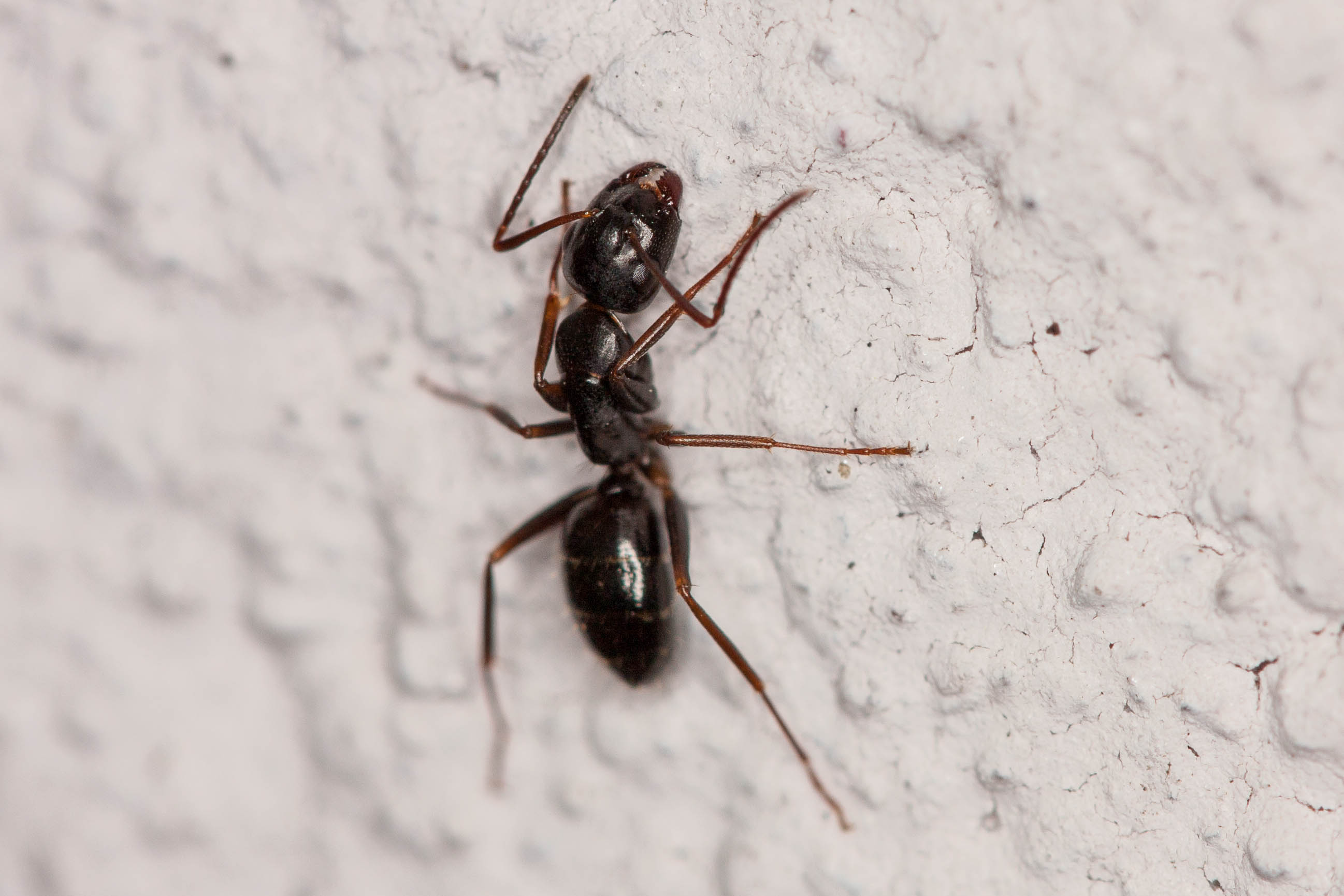 das sieht nach einer [I]Camponotus fallax[/I] Arbeiterin aus. Sie nisten entweder in einem nahegelegenen Baum (es handelt sich um eine arboricole Ameisenart) oder sogar in Holzteilen vom Haus.