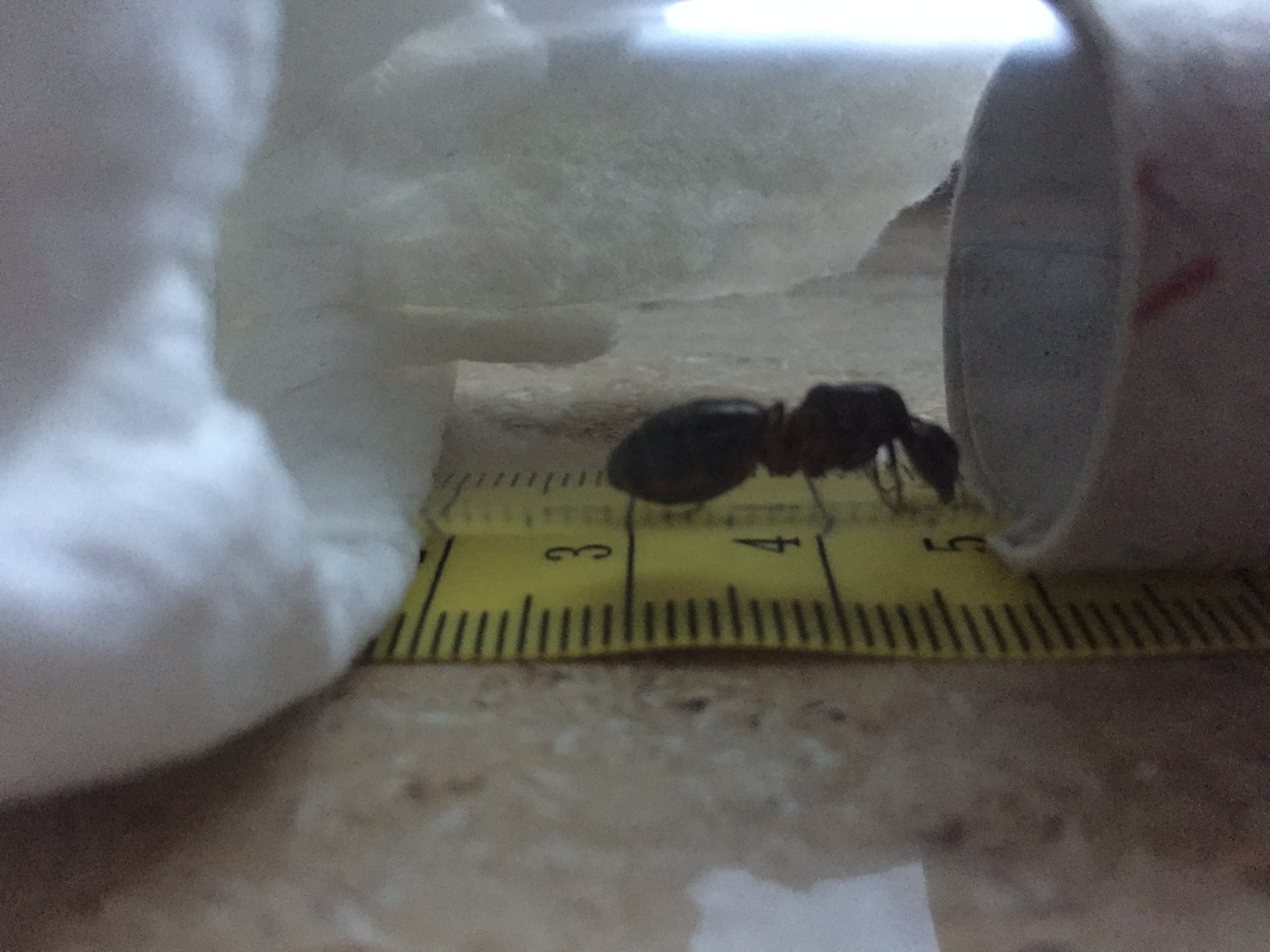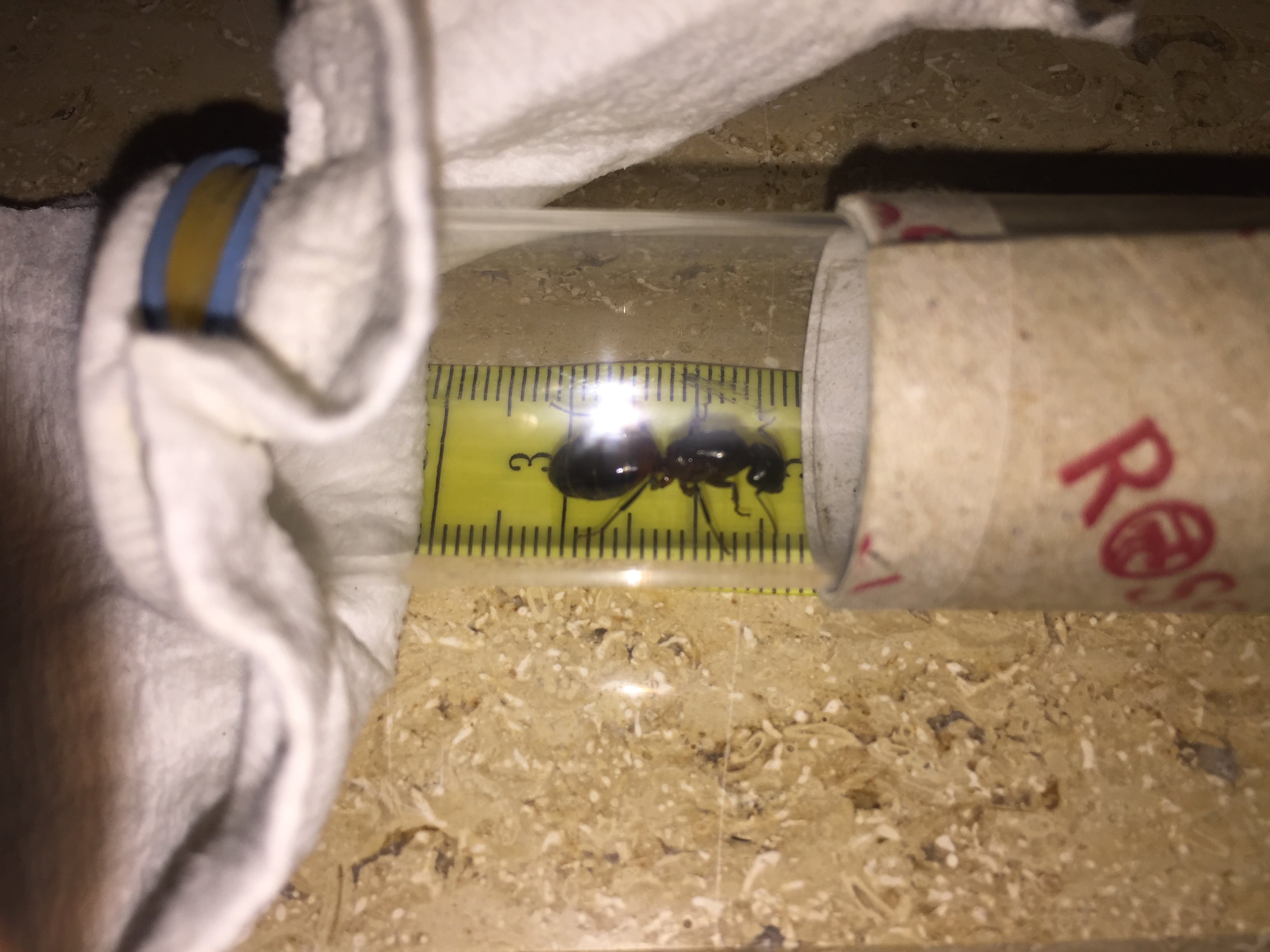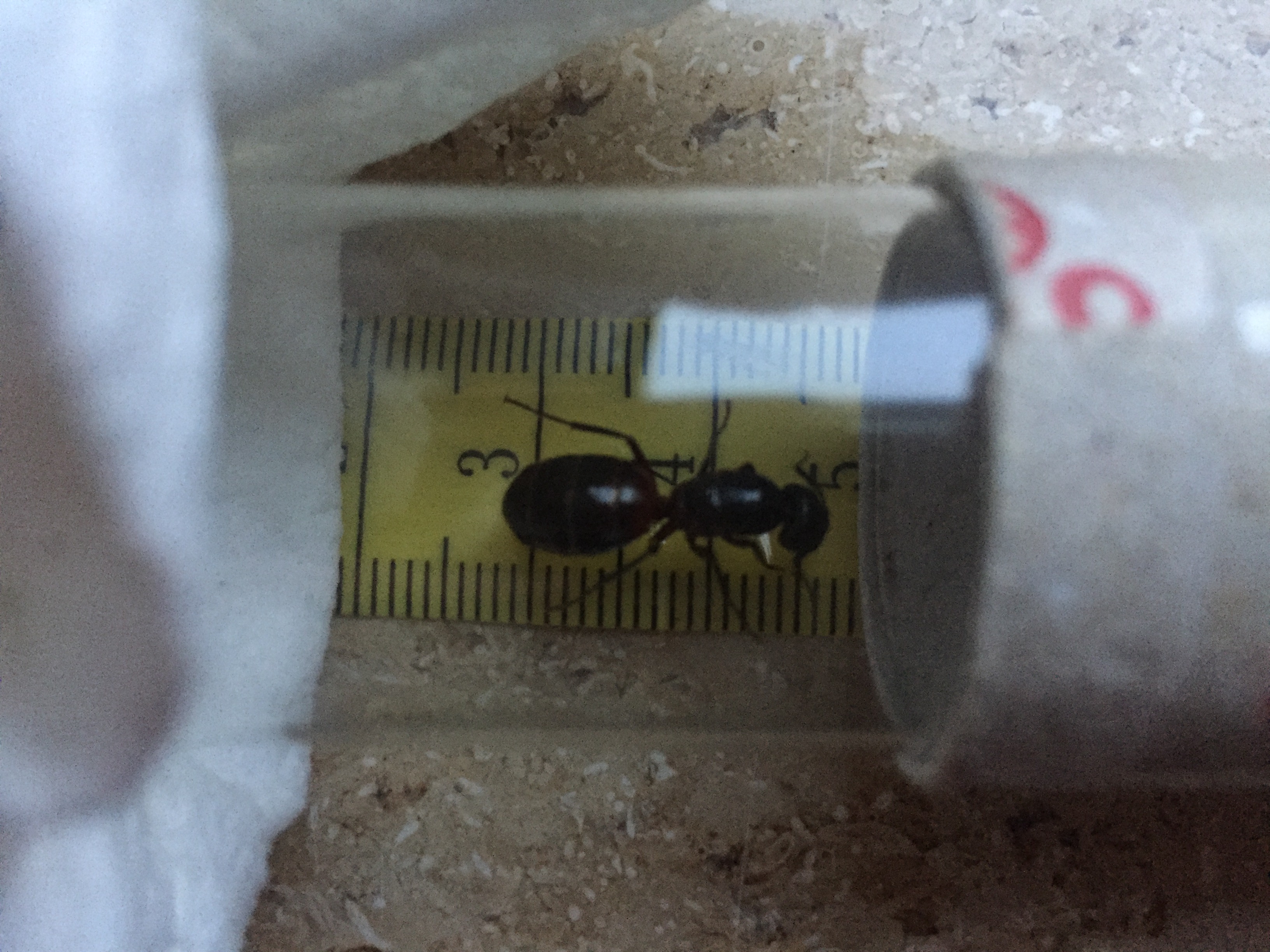 Wenn ersten die Arbeiterinnen da sind am besten das Reagenzglas in einen Plastik- oder Glascontainer (mit angebrachter Barriere, z.B. Fluon) legen und einen kleinen Tropfen Zuckerwasser plus etwas Protein in Form toter Arthropoden (Fruchtfliegen, kleine Spinnen) anbieten. Camponotus haben im Gegensatz zu anderen Ameisen nicht die Angewohnheit im Zuckerwasser zu ertrinken, da kann man einfach einen kleineren Tropfen z.B. auf etwas Alufolie oder eine kleine Plastikschale (Chipsdosendeckel sind super improvisierte Futterschalen) geben.