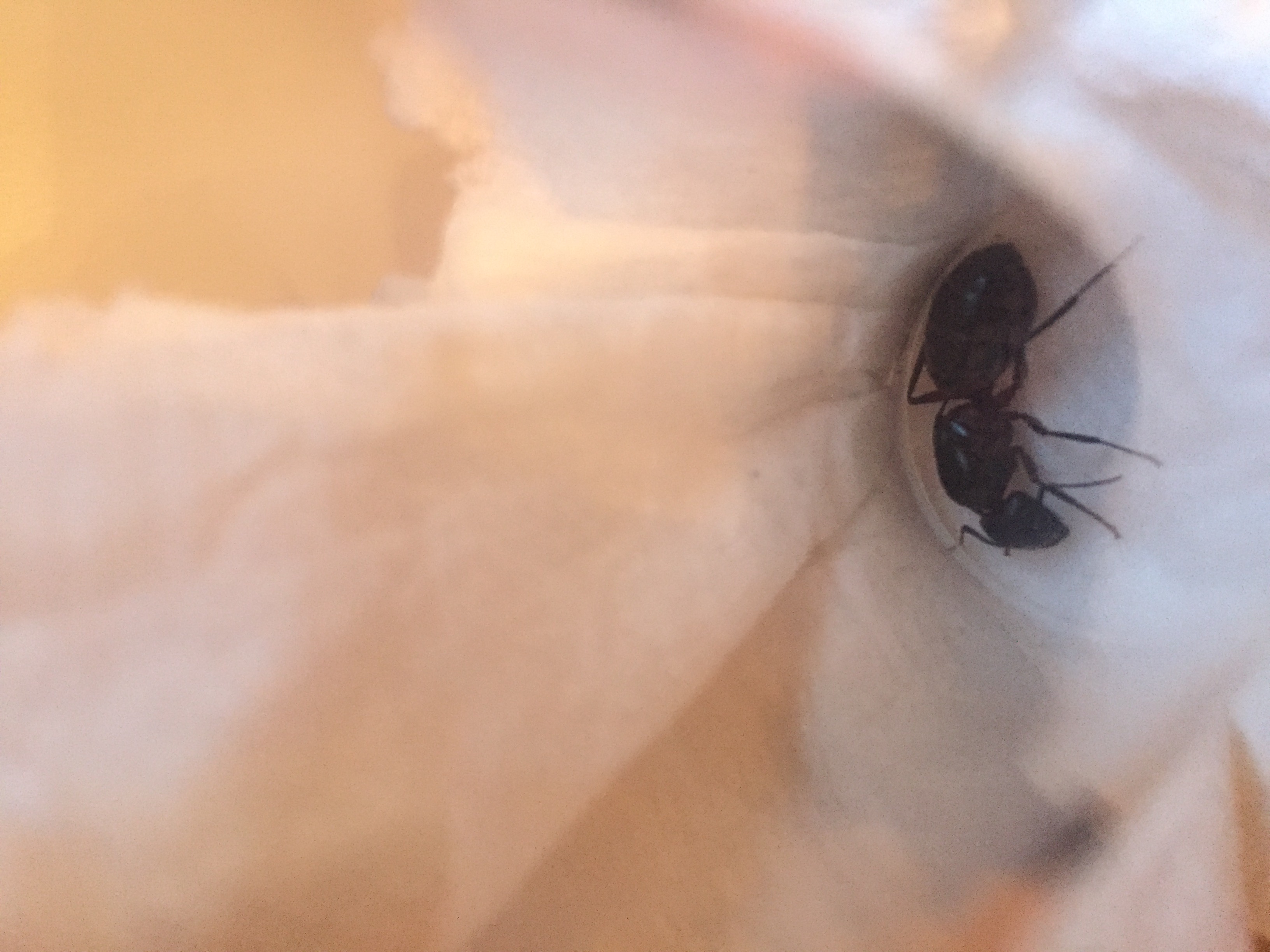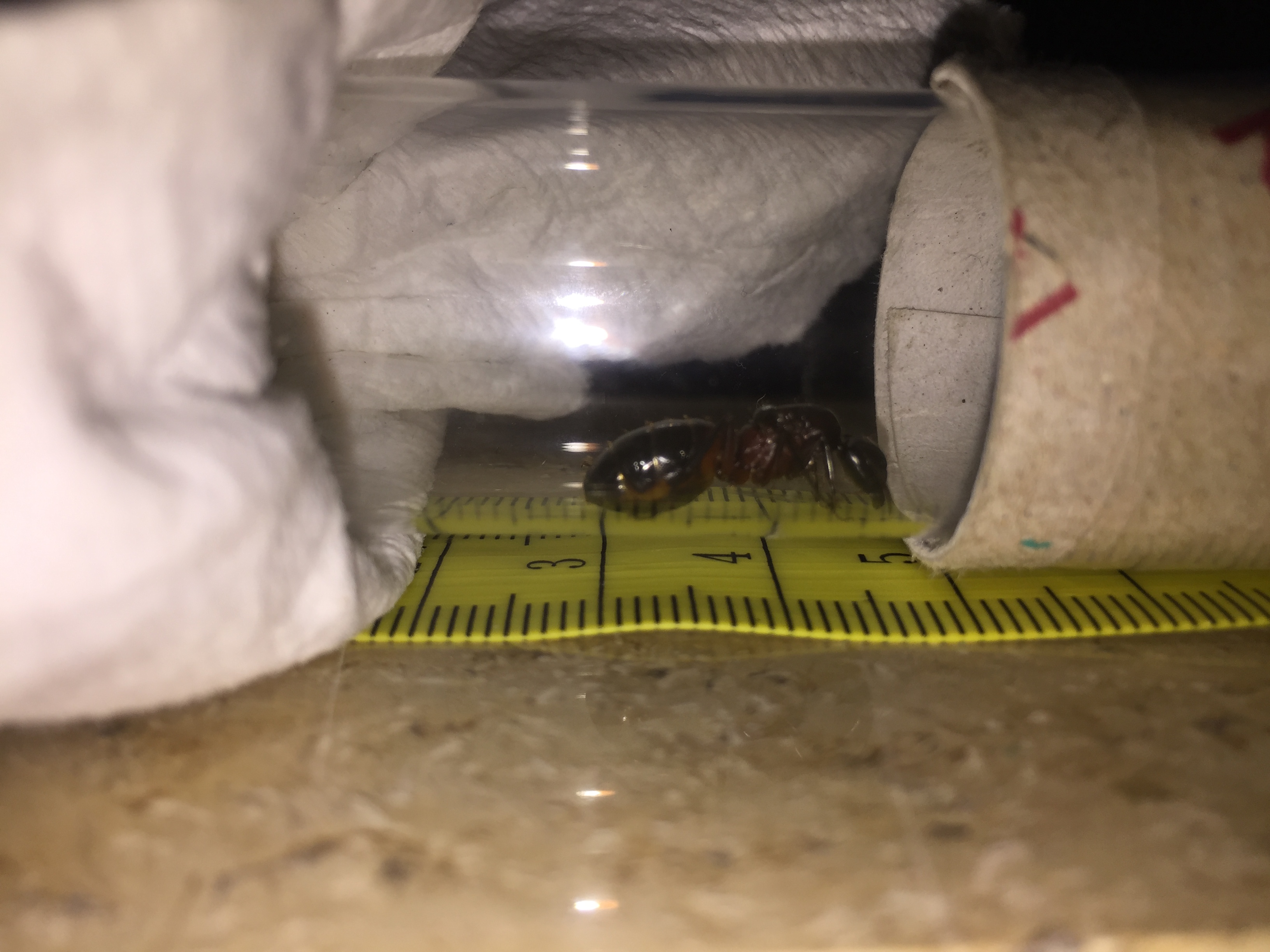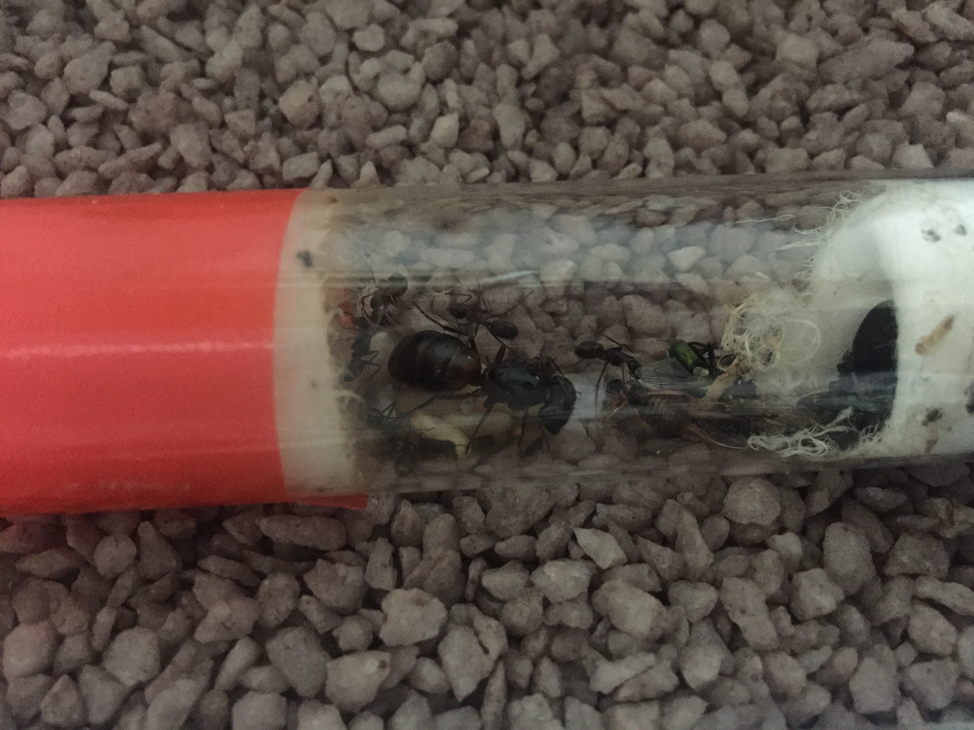 Wenn ersten die Arbeiterinnen da sind am besten das Reagenzglas in einen Plastik- oder Glascontainer (mit angebrachter Barriere, z.B. Fluon) legen und einen kleinen Tropfen Zuckerwasser plus etwas Protein in Form toter Arthropoden (Fruchtfliegen, kleine Spinnen) anbieten. Camponotus haben im Gegensatz zu anderen Ameisen nicht die Angewohnheit im Zuckerwasser zu ertrinken, da kann man einfach einen kleineren Tropfen z.B. auf etwas Alufolie oder eine kleine Plastikschale (Chipsdosendeckel sind super improvisierte Futterschalen) geben.