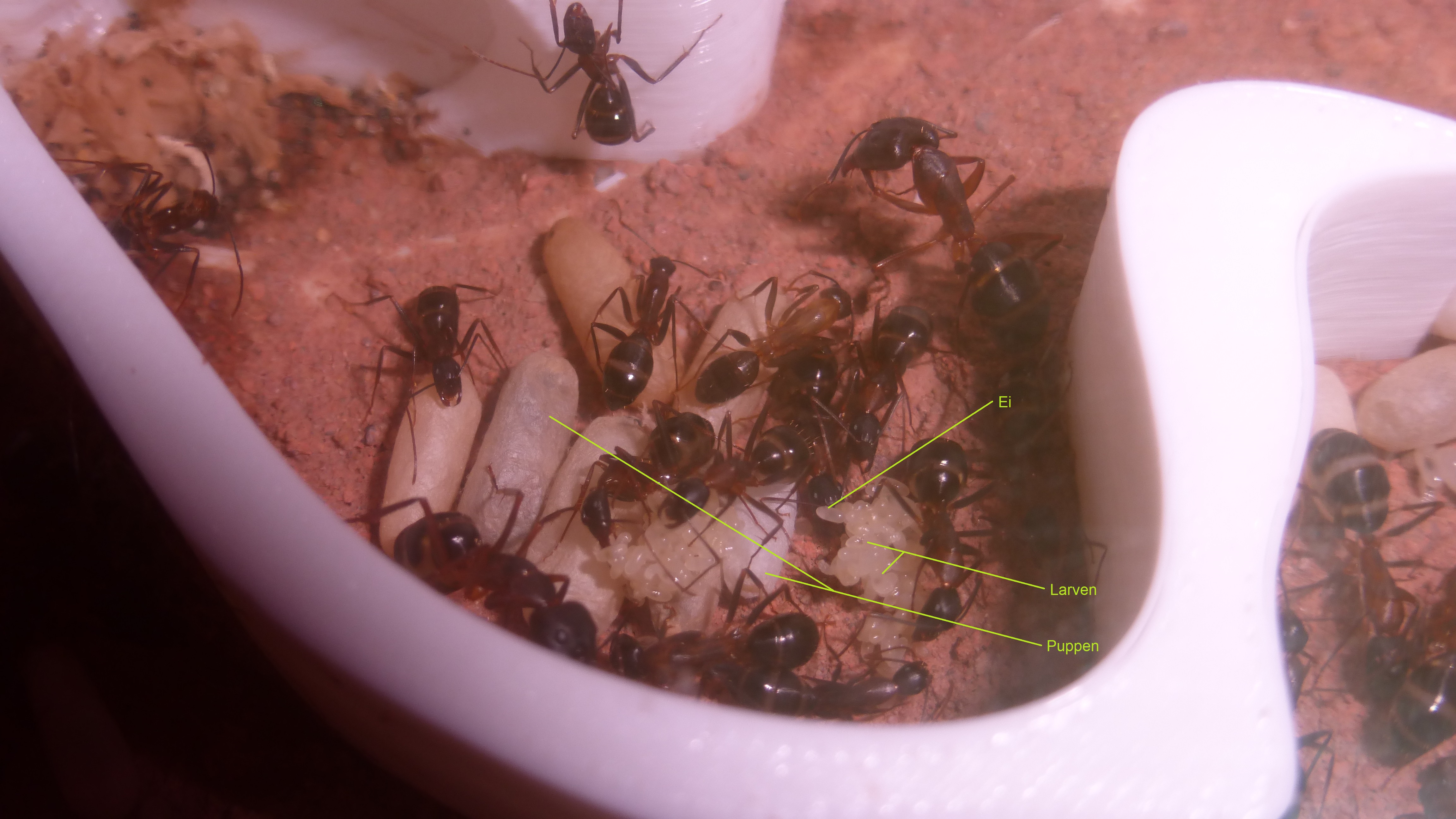 !Nach einer nervenaufreibenden Woche mit einem feuchtrn Ytongnest ist meine kleine Camponotus rufoglaucus feae Kolonie dann gestern endlich ins neue Zuhause gesetzt worden (Foto ist von heute morgen nachdem sie umgezogen waren)