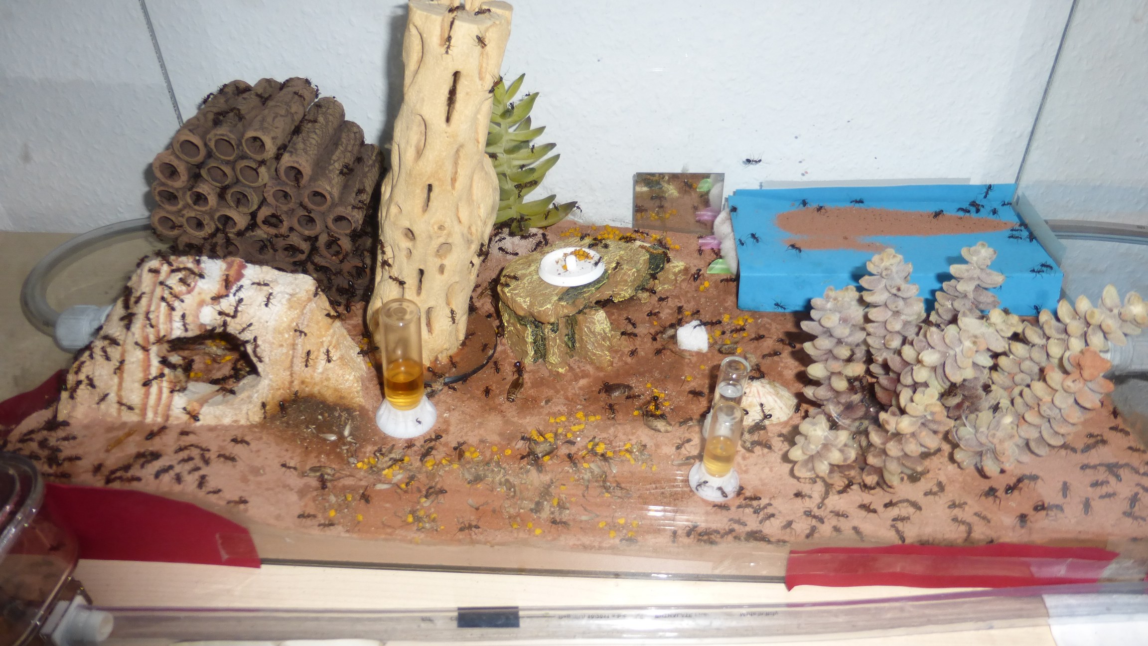 Diese Arena in der Nähe des Anlangenendes hat jetzt eine byformica-Tränke mit Wasser bekommen und interessanterweise trinken sie da tatsächlich während sie den zuckrigen Inhalt zuvor ignoriert haben (auf der anderen Seite der Schlauchbrücke ist noch eine Tränke, da holen sie sich immer ihren Zucker).