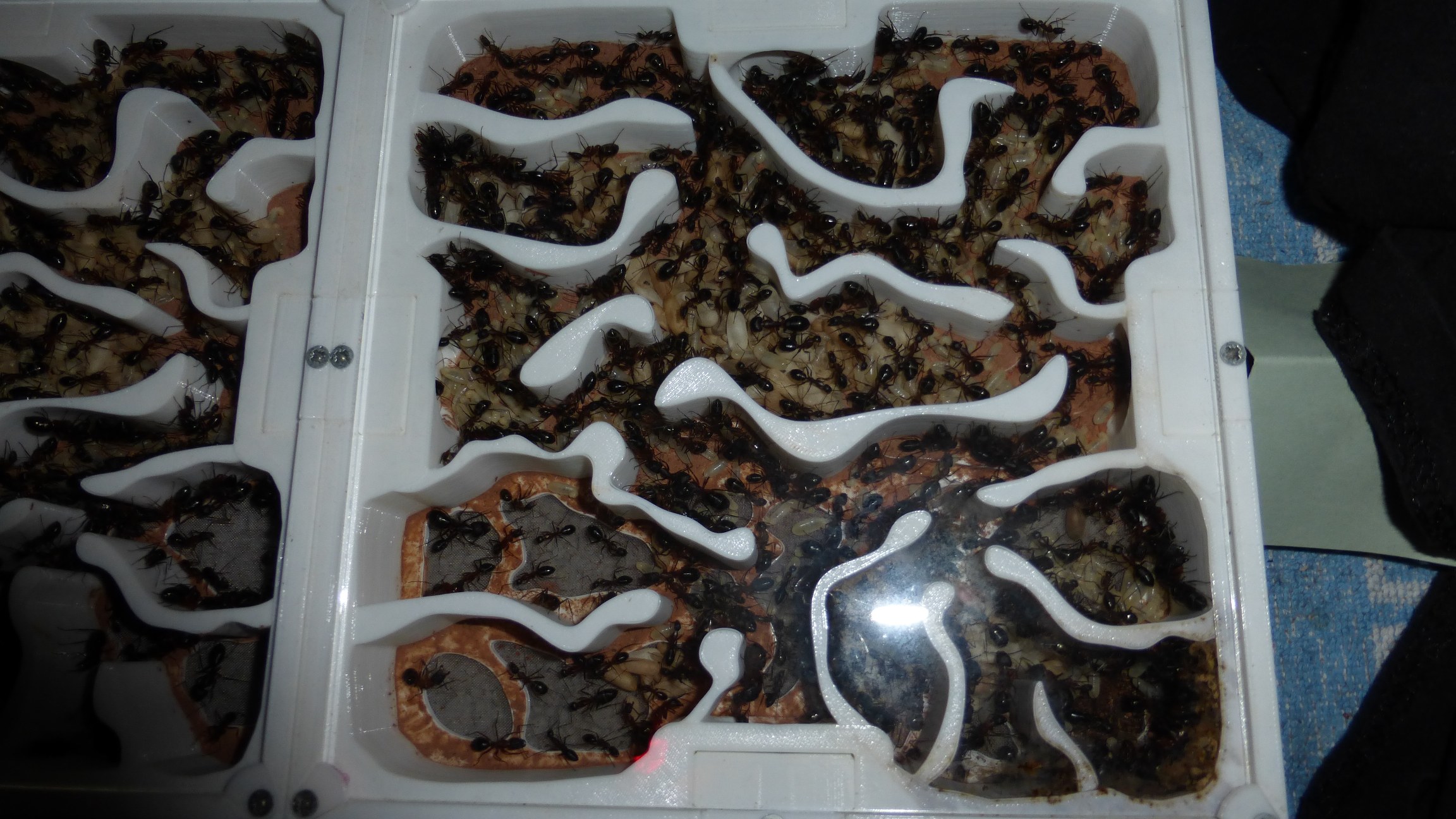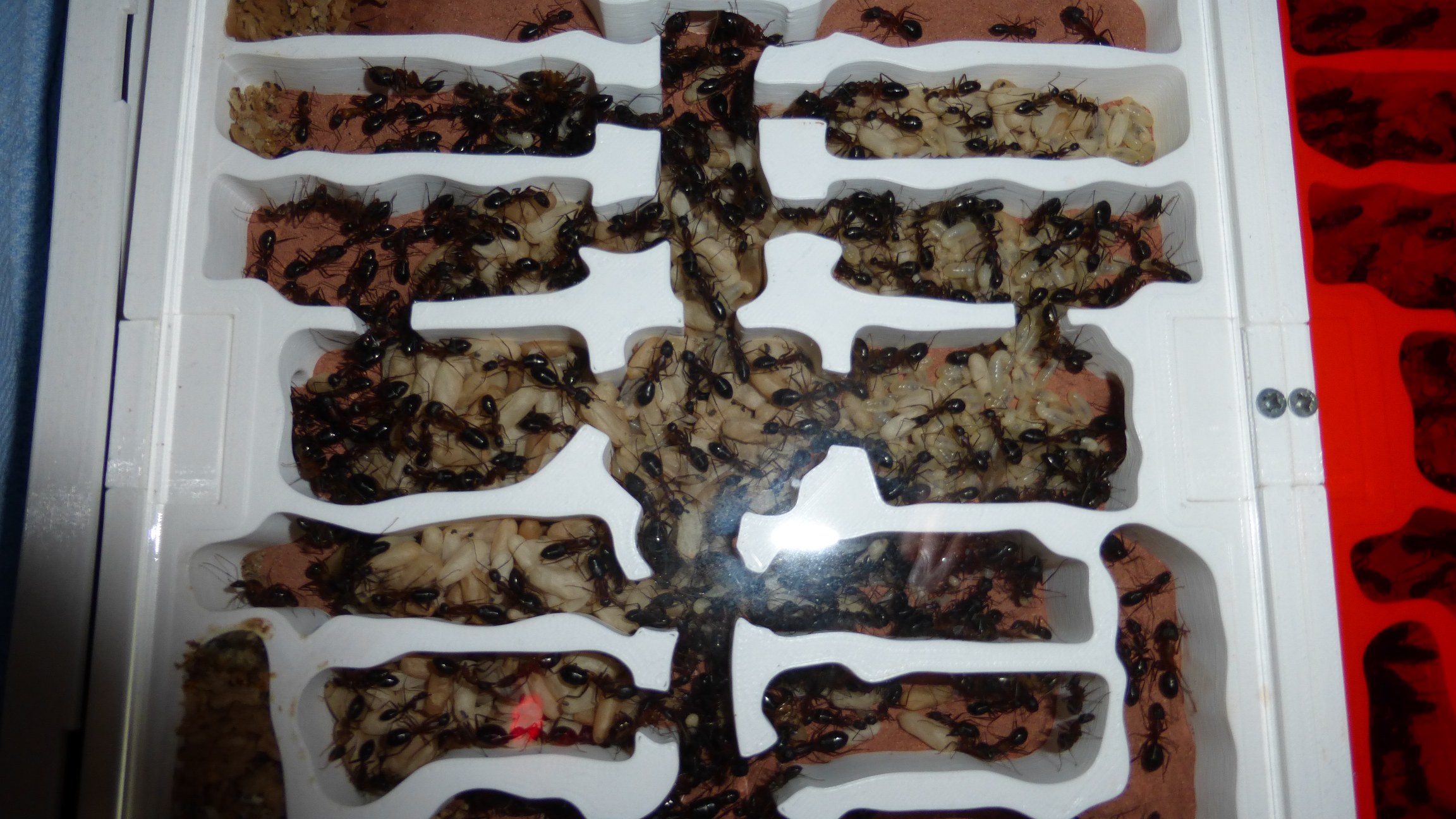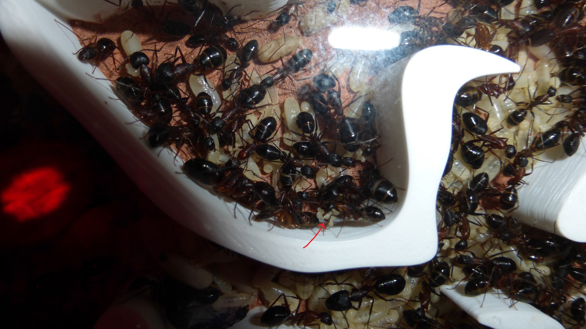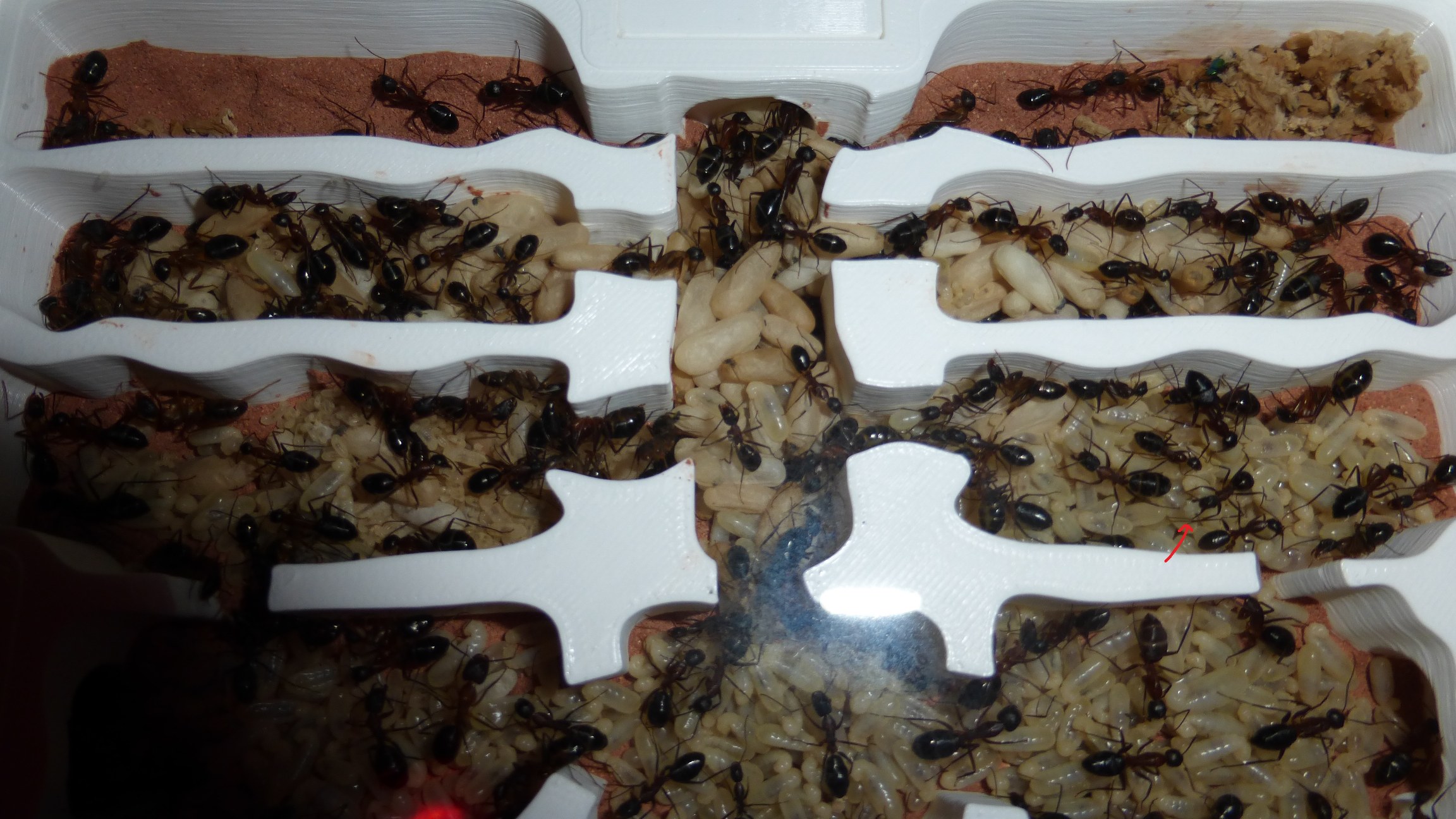 Sie hatten etwas Brut in den RGs der Futterarena eingelagert, aber nicht viele. Ich vermute allerdings dass sie größere Bruthäufen unterhalb des Substrats largern, in das sie einige größere Kammern gegraben haben - aber ich kann sie nicht sehen, weil man dafür das kompletten Glasbecken hochheben müsste.