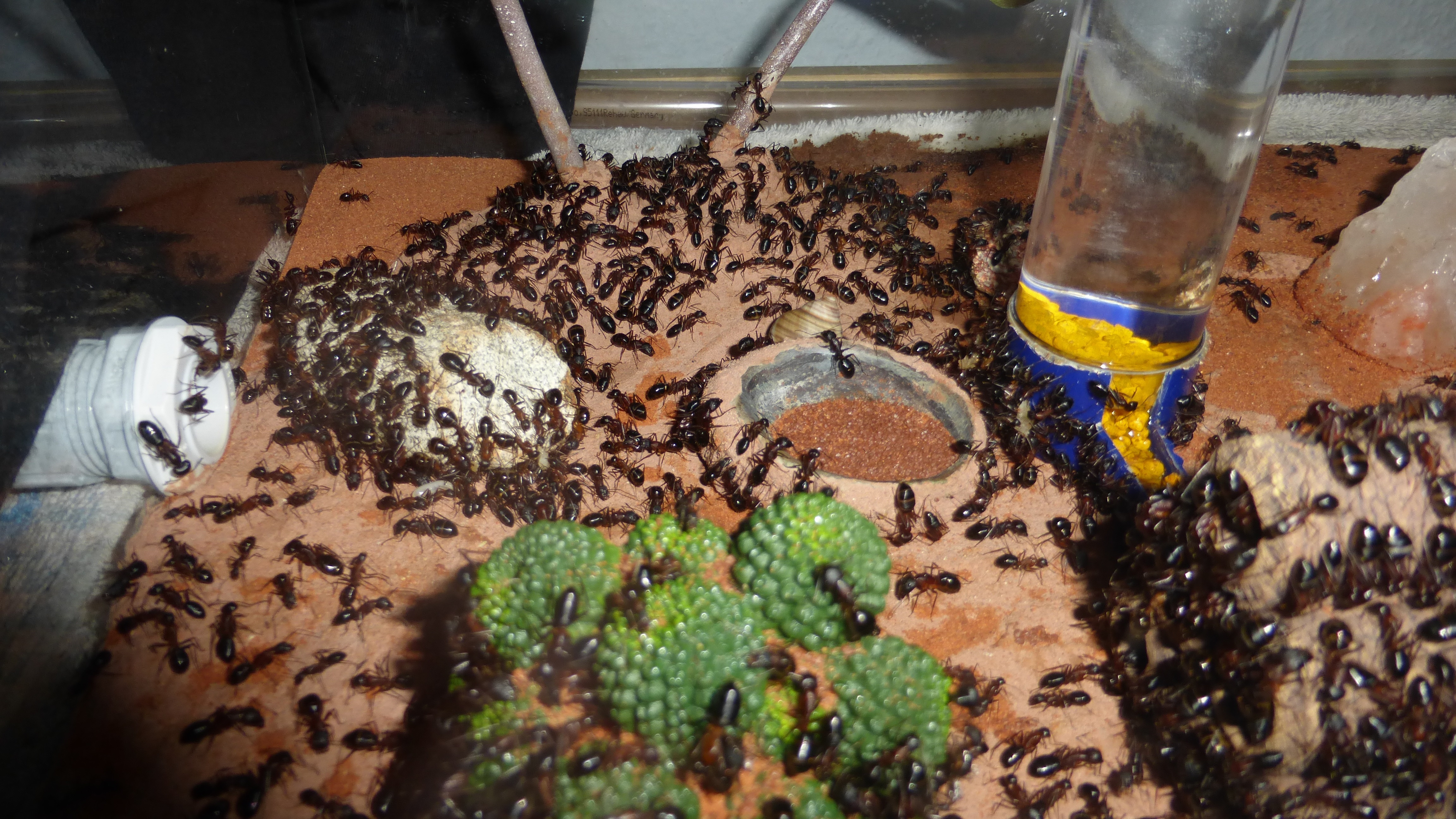 Außerdem hab ich die Watte in den Vogeltränken mit Aquarienkies ersetzt, weil die Arbeiterinnen immer Garnelensand und Bodensubstrat auf die Watte geklebt haben und obwohl das trinken von der Watte wohl funktioniert scheint mir als würden die Ameisen direkten Zugang zur Wasseroberfläche bevorzugen.