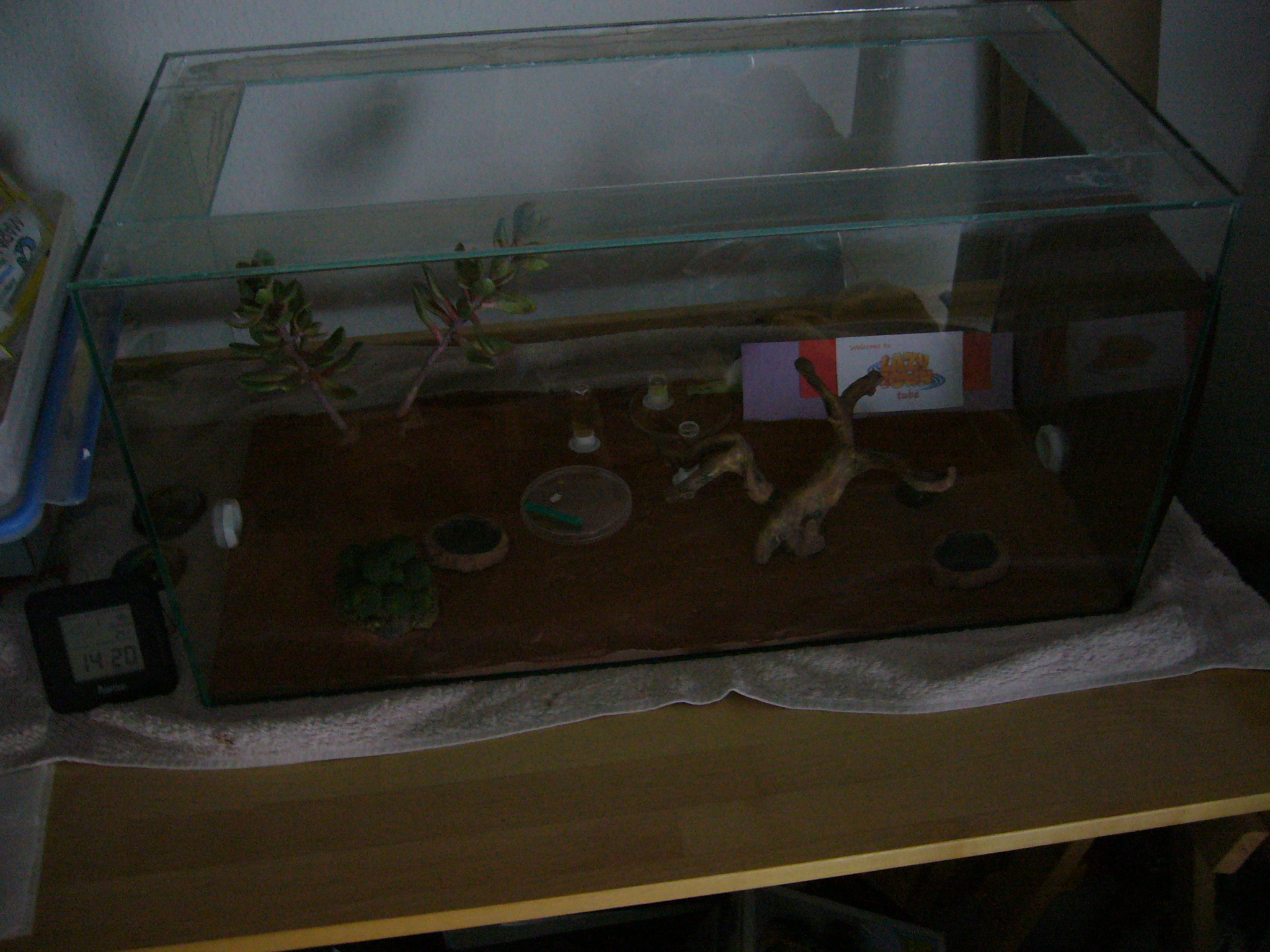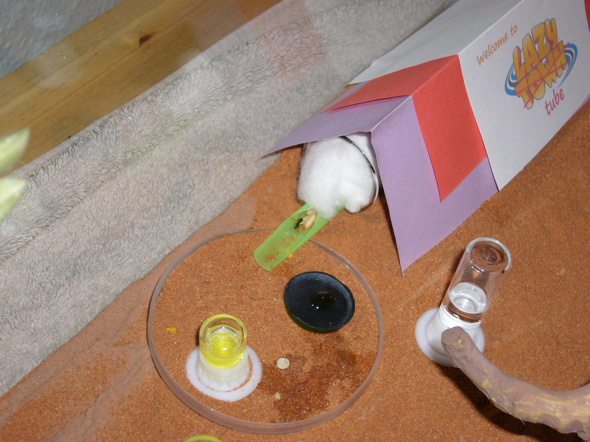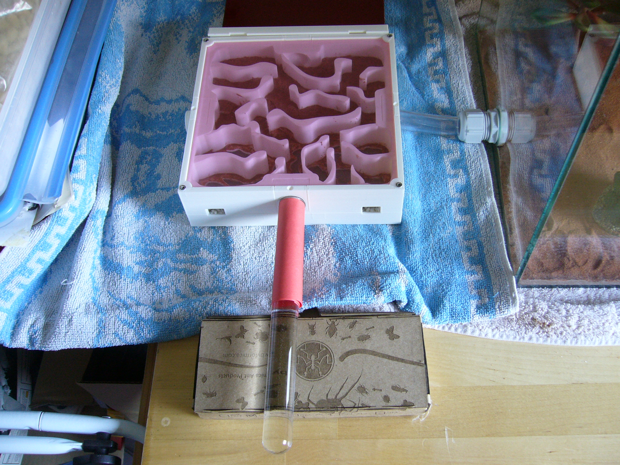 Die Wassertube anzuschließen war ein kleines Problem (15cm, Nesteingang 14cm), hab dann aber einfach ein Stück Schlauch genommen und die Wassertube daran angeschlossen. Hält nicht perfekt (das Ende sinkt ab), die Verpackung der byFormica-Tränken hat aber praktischerweise exakt die richtige Größe um das ganze abzustützen.