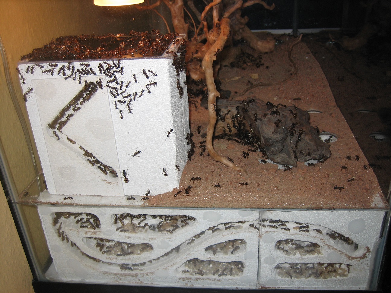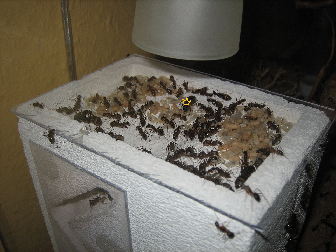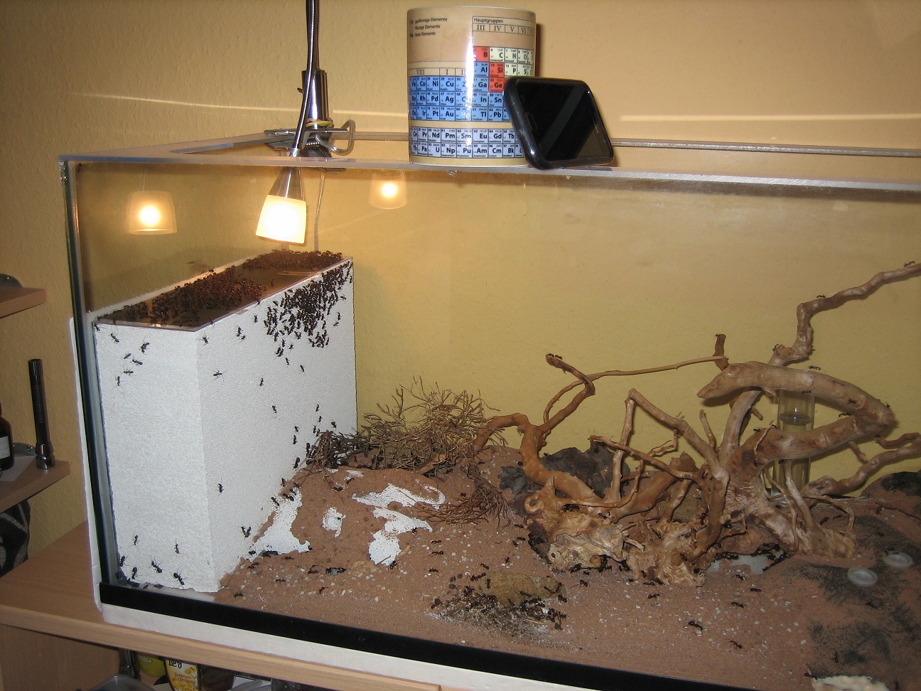 Allerdings durfte ich immer wieder beobachten, dass in der Nacht, wenn die Nestlampe aus ist, Arbeiterinnen diejenige Beckenscheibe belaufen, die durch Licht aus mehreren Metern Entfernung angestrahlt wird, also vom Schreibtisch oder Bett aus. Demnach hat also auch das Licht, und nicht die Wärme allein, einen Einfluss.
