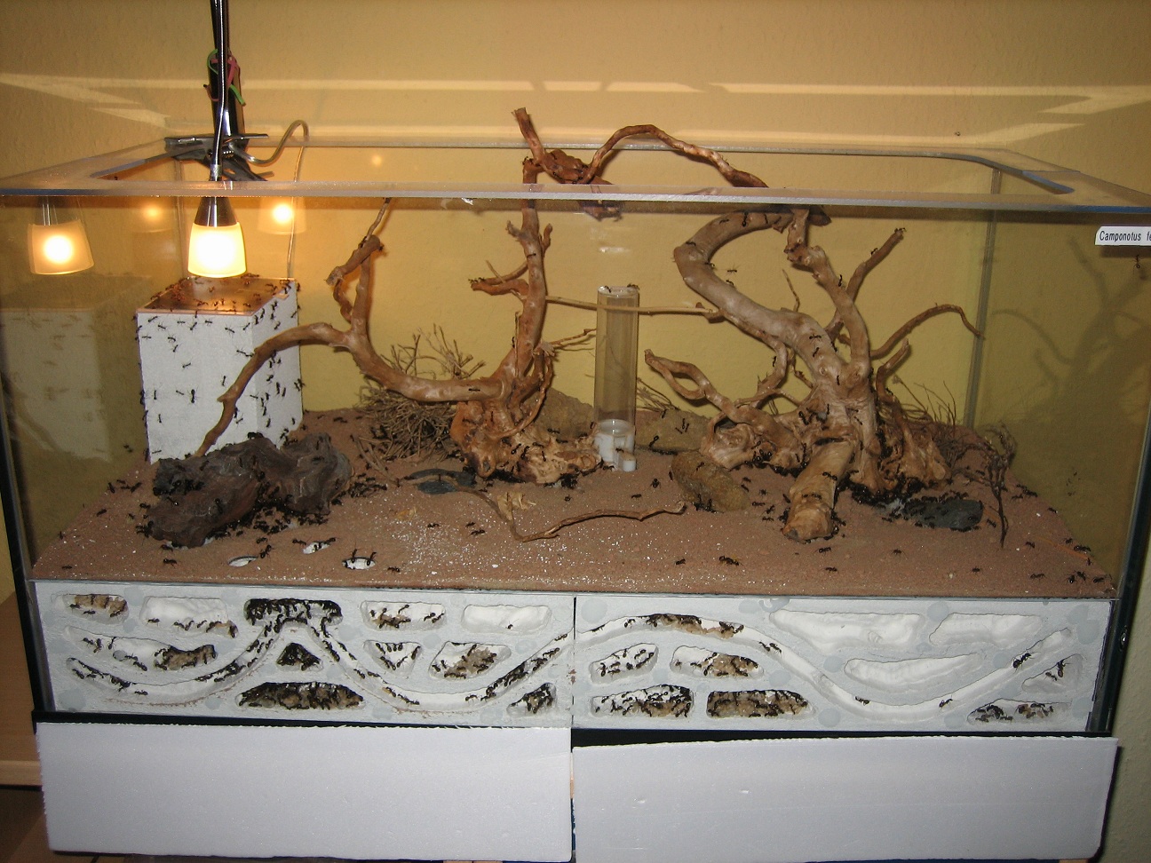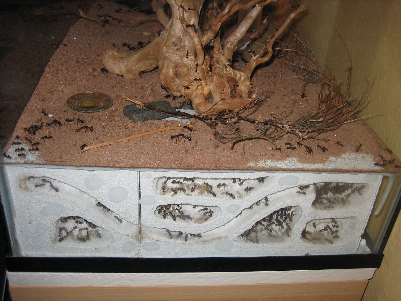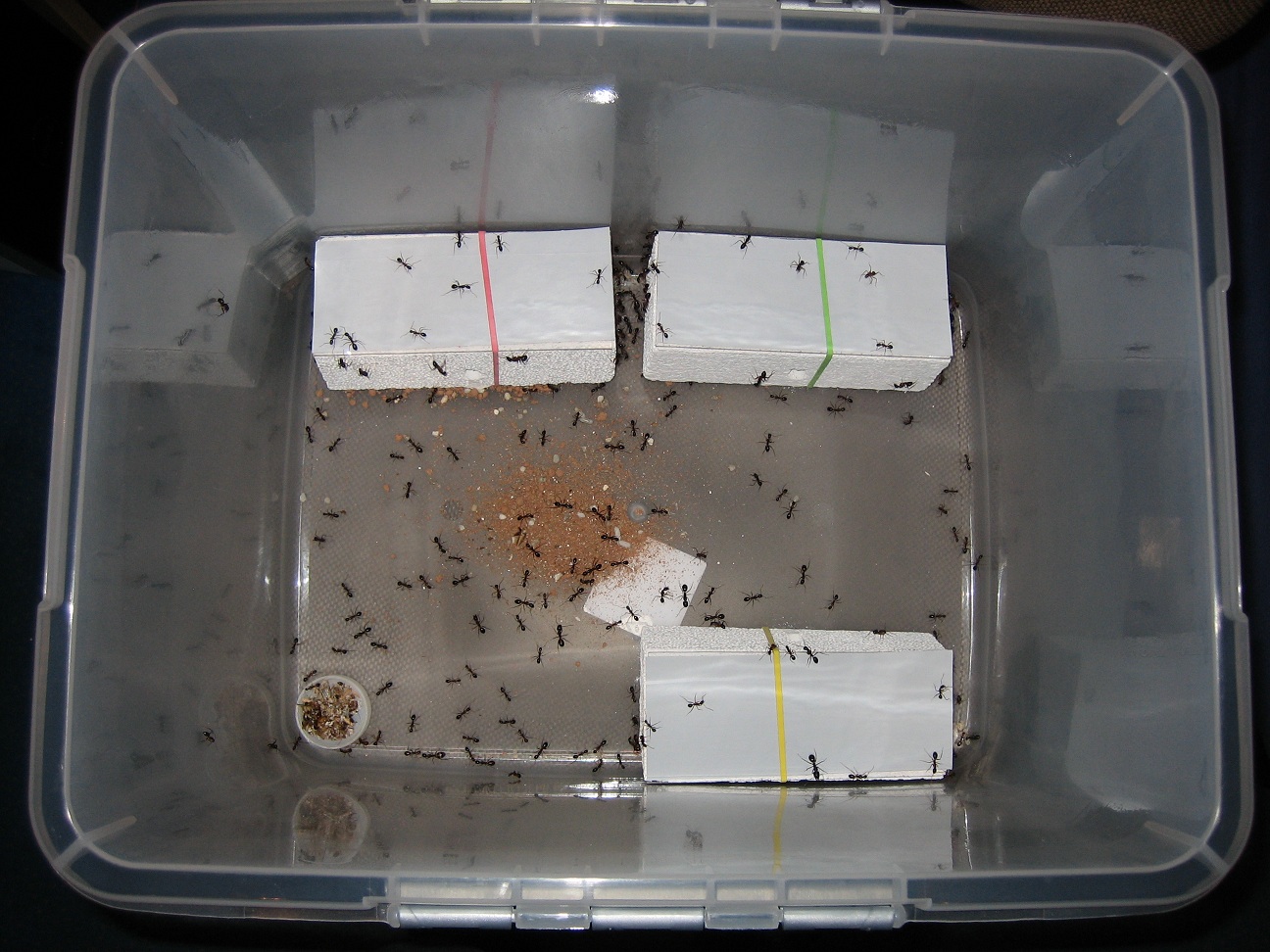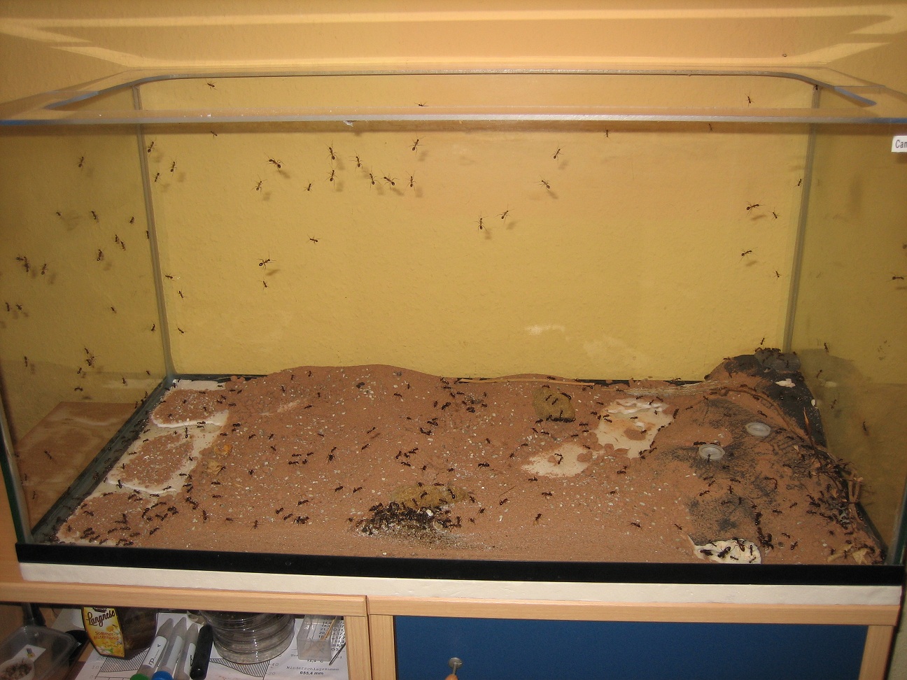Für alle Neugierigen habe ich meine improvisierten Aufbauten noch mal mit dem Fotoapparat festgehalten (2), (3). Die Aufnahmen von oben sind leider noch nichts geworden (4). Die Idee war Ameisenstraßen während der Fütterung zu erkennen, aber es kam keine zustande. Camponotus gelten sowieso nicht als die großen Straßen-Former, aber vermutlich ist das Becken einfach zu klein.