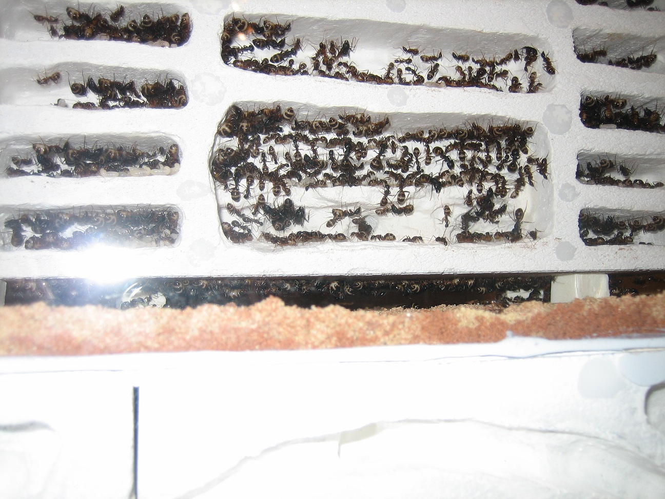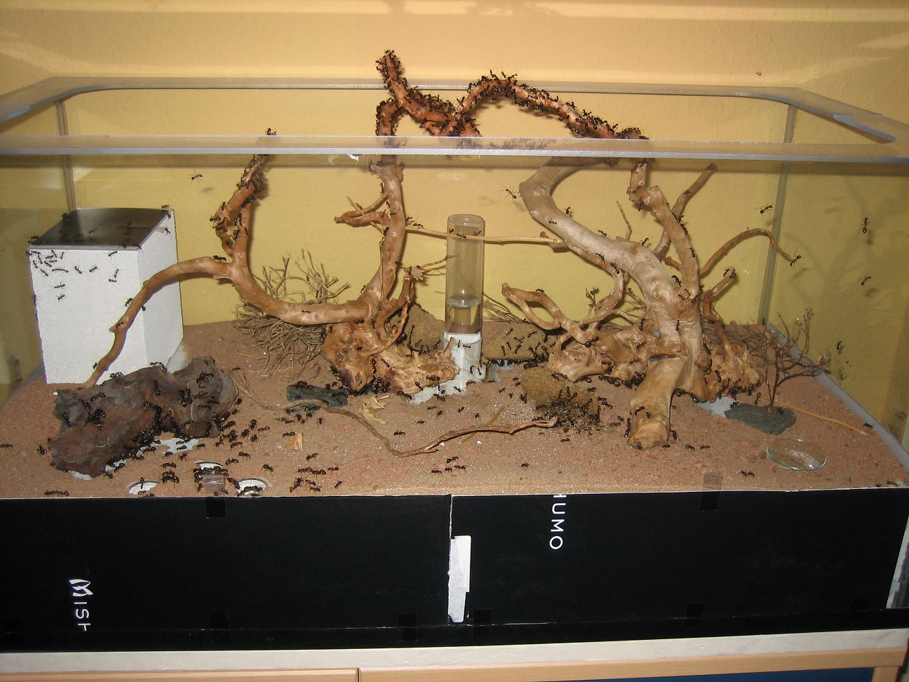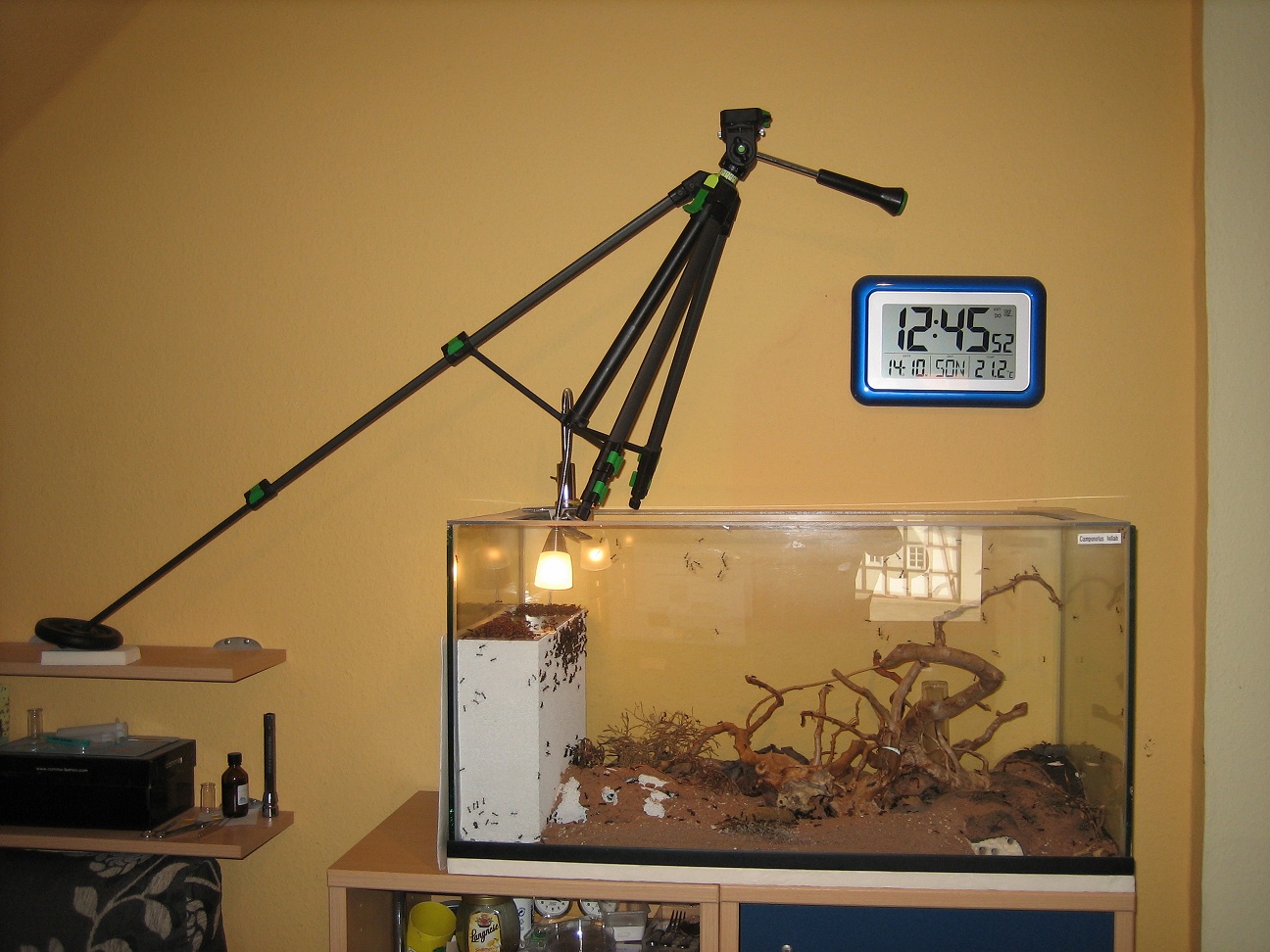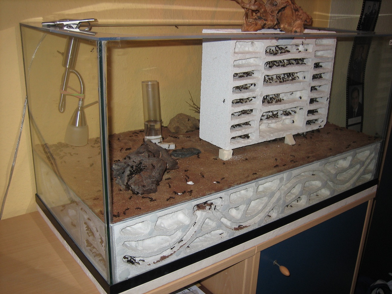 Für alle Neugierigen habe ich meine improvisierten Aufbauten noch mal mit dem Fotoapparat festgehalten (2), (3). Die Aufnahmen von oben sind leider noch nichts geworden (4). Die Idee war Ameisenstraßen während der Fütterung zu erkennen, aber es kam keine zustande. Camponotus gelten sowieso nicht als die großen Straßen-Former, aber vermutlich ist das Becken einfach zu klein.