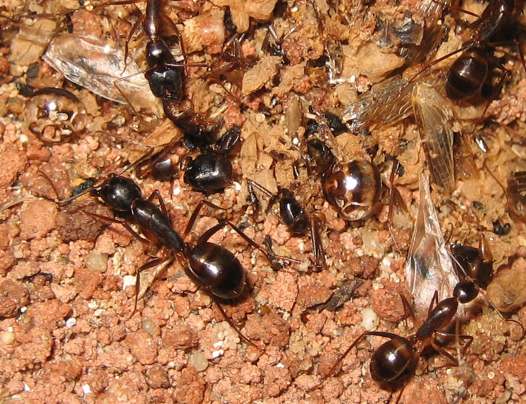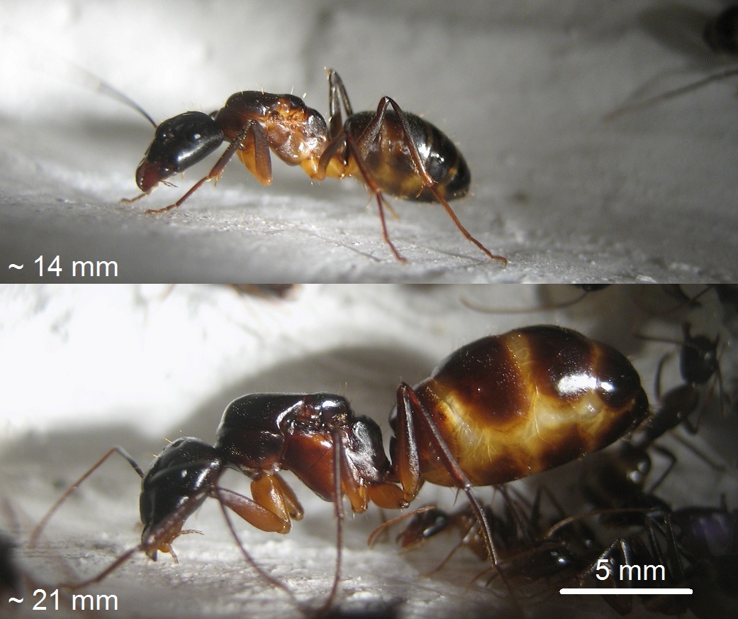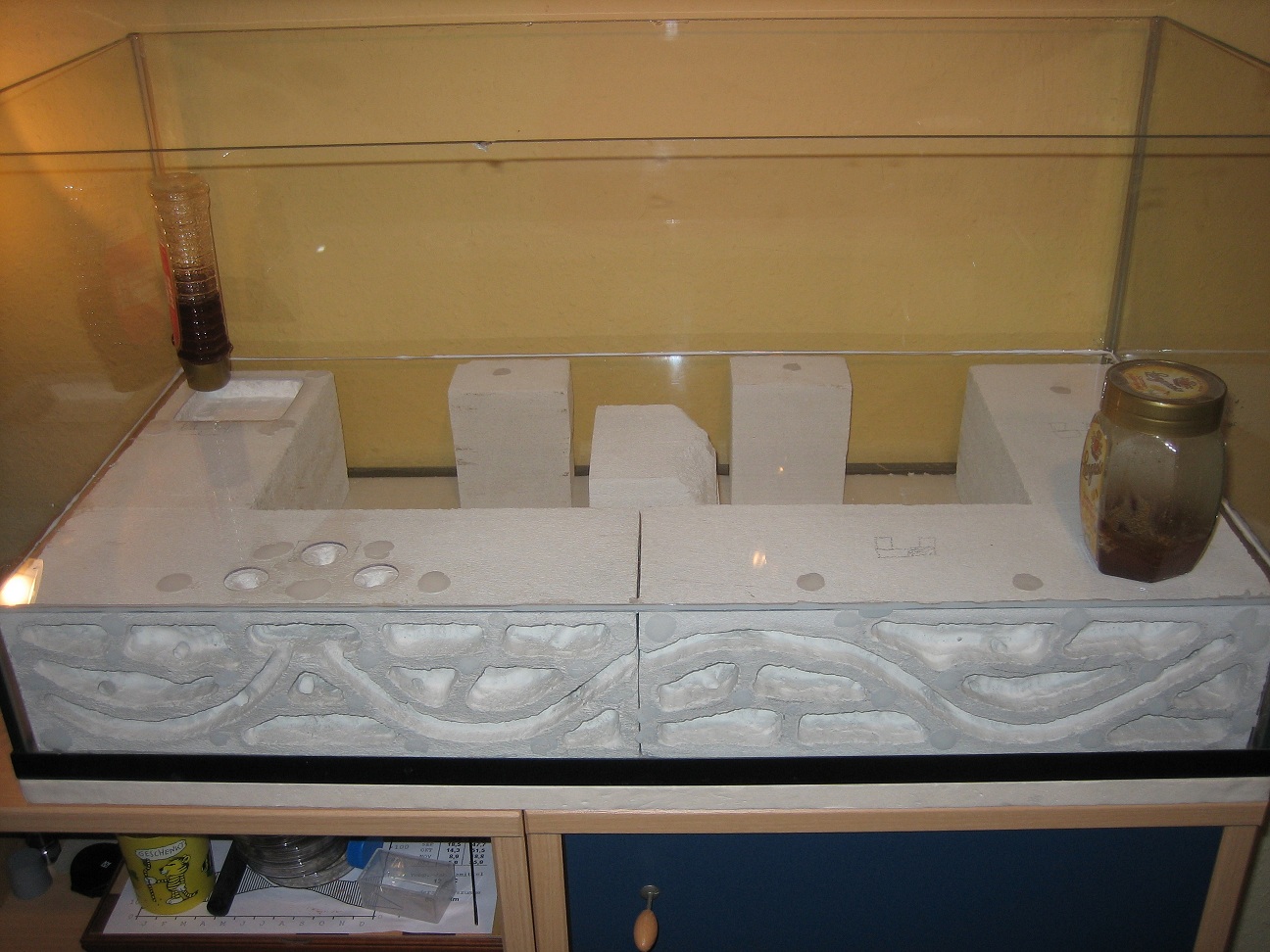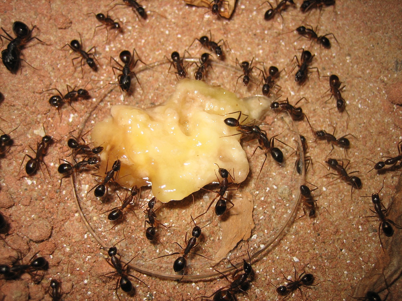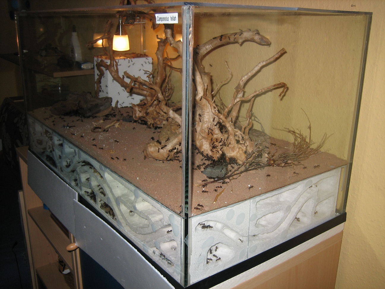 Für alle Neugierigen habe ich meine improvisierten Aufbauten noch mal mit dem Fotoapparat festgehalten (2), (3). Die Aufnahmen von oben sind leider noch nichts geworden (4). Die Idee war Ameisenstraßen während der Fütterung zu erkennen, aber es kam keine zustande. Camponotus gelten sowieso nicht als die großen Straßen-Former, aber vermutlich ist das Becken einfach zu klein.