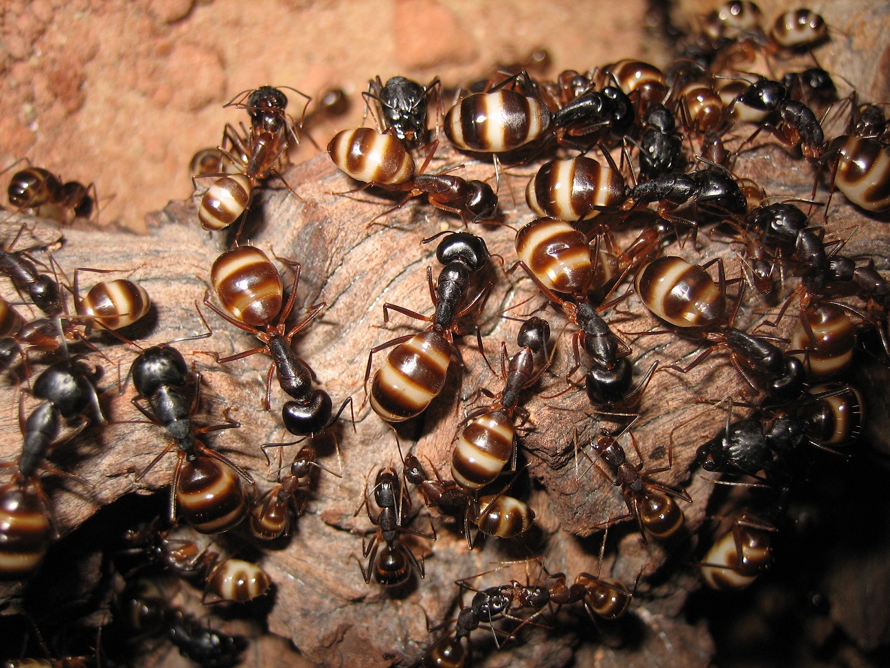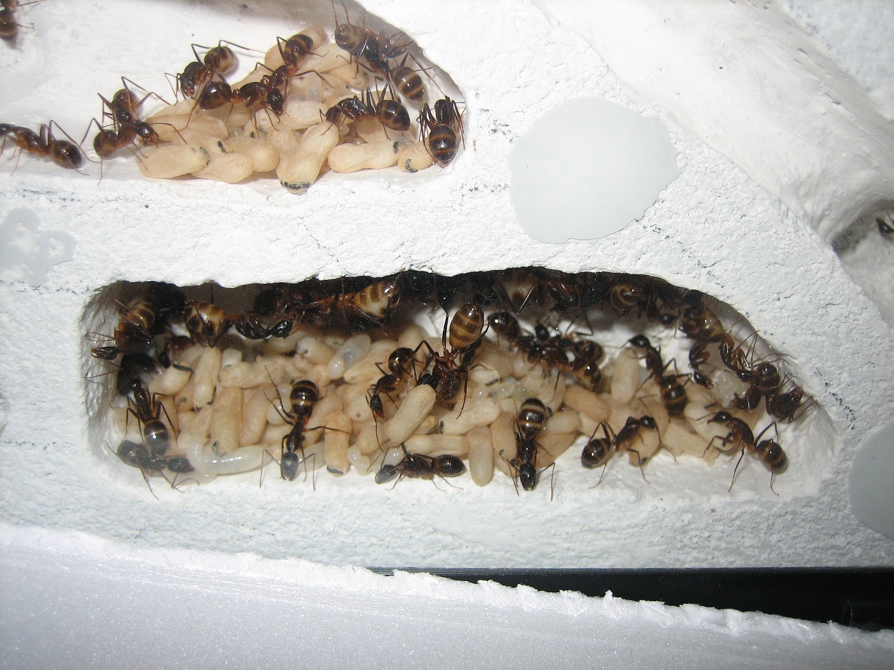 Als weiteren Beleg für die Photophilie meiner Kolonie habe ich dieses Mal alle meine technischen Möglichkeiten ausgeschöpft und ein Zeitraffer Video gedreht. Zuerst beobachtet man ein heilloses Durcheinander. Die Ameisen belaufen das Ytongnest und die Scheiben willkürlich. Aber sobald die Lampe eingeschaltet wird, bewegt sich ein Großteil der Arbeiterinnen auf die Lichtquelle zu und versammelt sich unter dieser. Von allen Seiten scheinen nun Ameisen von der Lampe angelockt zu werden. Nach etwa 20 Minuten hat sich die Meute wieder beruhigt, der Platz wird wärmer, so dass sich die Ameisen im leichten Abstand zur Lampe niederlassen. Weiterhin ist zu beobachten, dass bis auf wenige Media-Arbeiterinnen und die Intermorphe keine