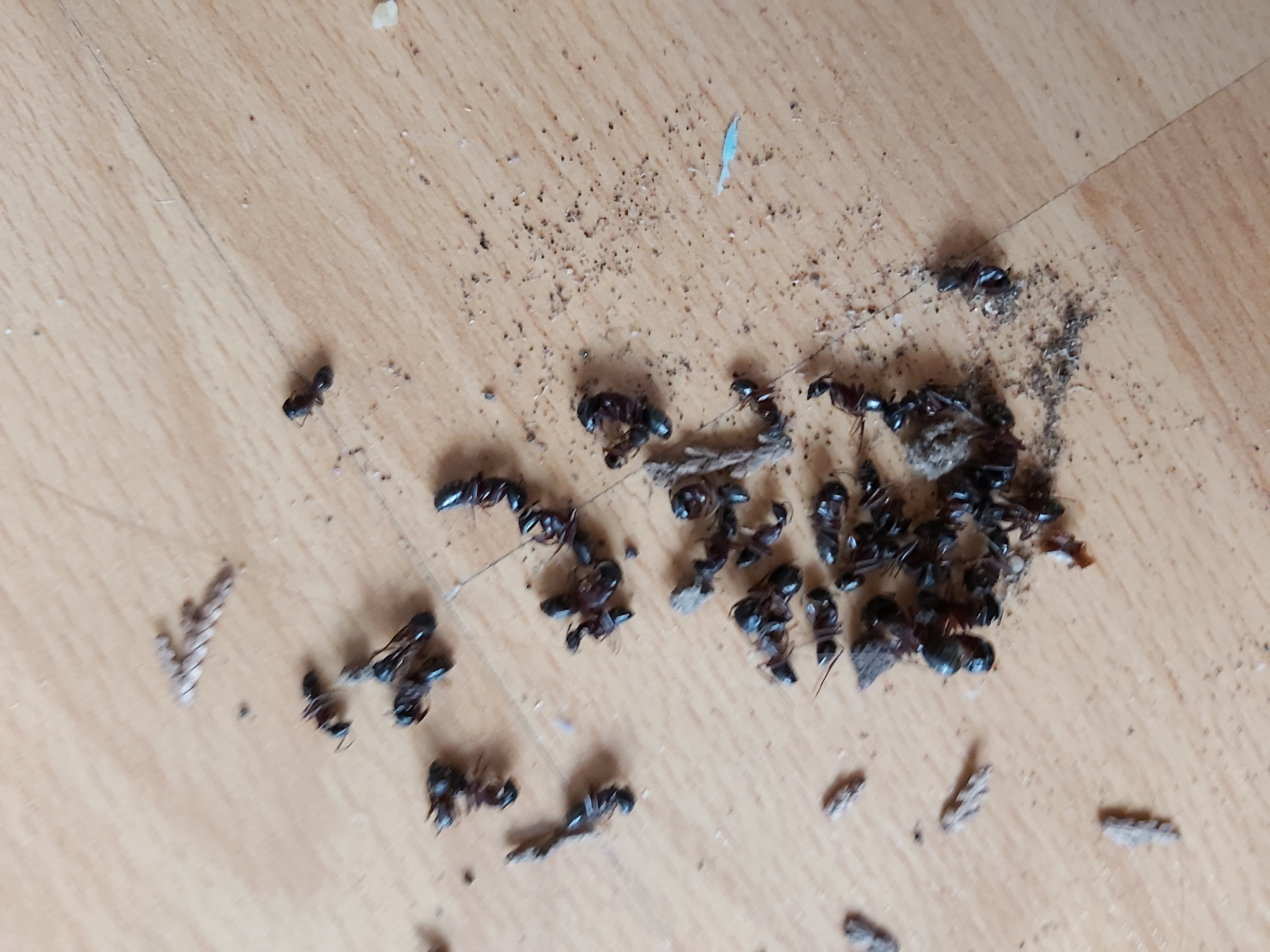 Also habe ich es vorsichtig ĂĽber dem Boden ausgeklopft. Die lebenden Ameisen habe ich mit Pinsel, Watte und Stoffresten ausgefegt. Sie verbissen sich natĂĽrlich im Material und so bekam ich sie unbeschadet rĂĽber.