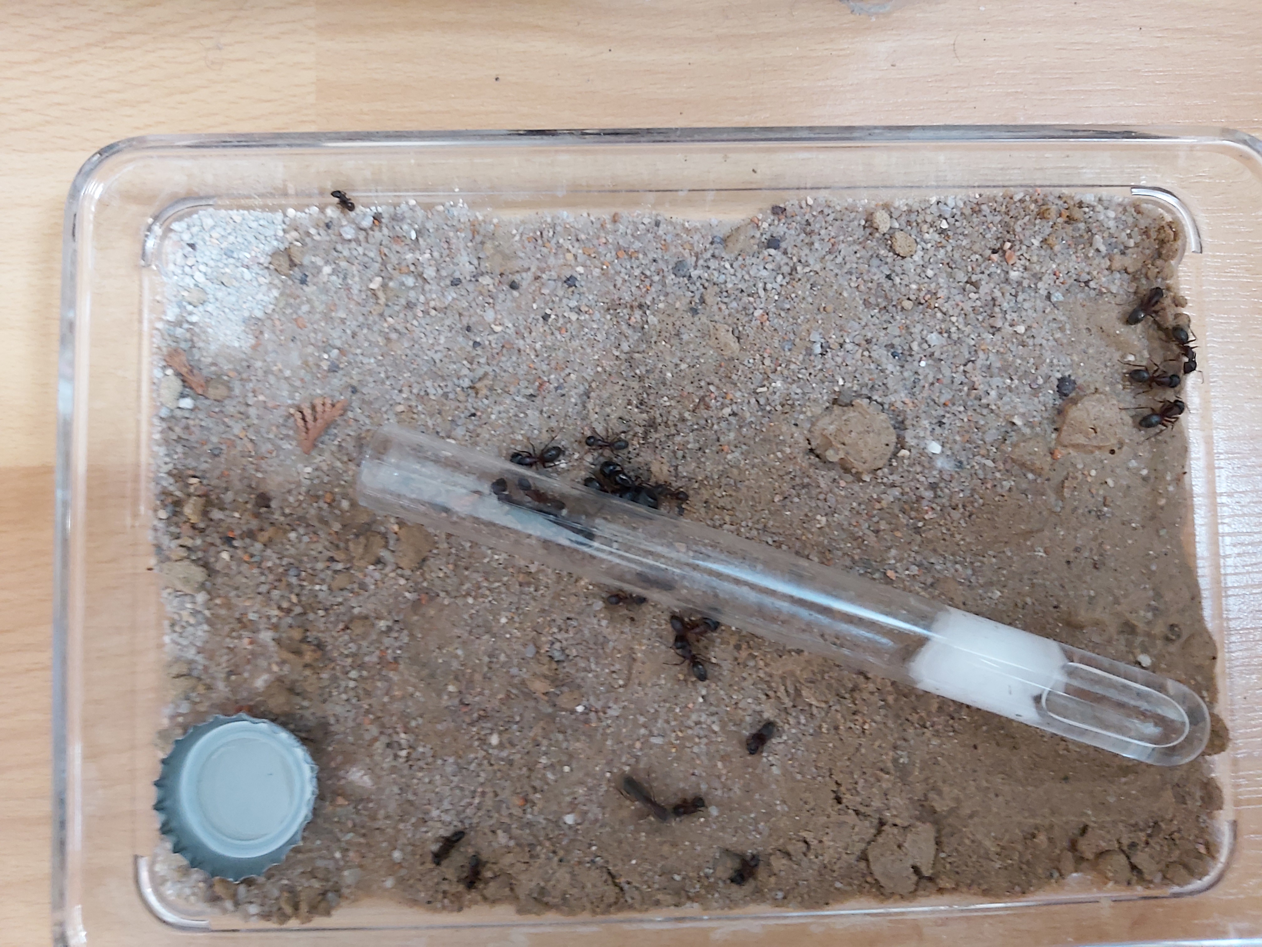 Zunächst hatte ich die Arena dunkel gestellt. Ein Fehler, sie ignorierten die Reagenzgläser und nutzten einfach die komplette Arena als Kammer. Nur zu blöd, dass ich alle 2 Tage den Deckel anhob. Ich habe sie dann ins Helle gestellt um sie dazu zu animieren, wenigstens unter die Folie zu ziehen. Immerhin: Zuckerwasser wurde inzwischen angenommen und die