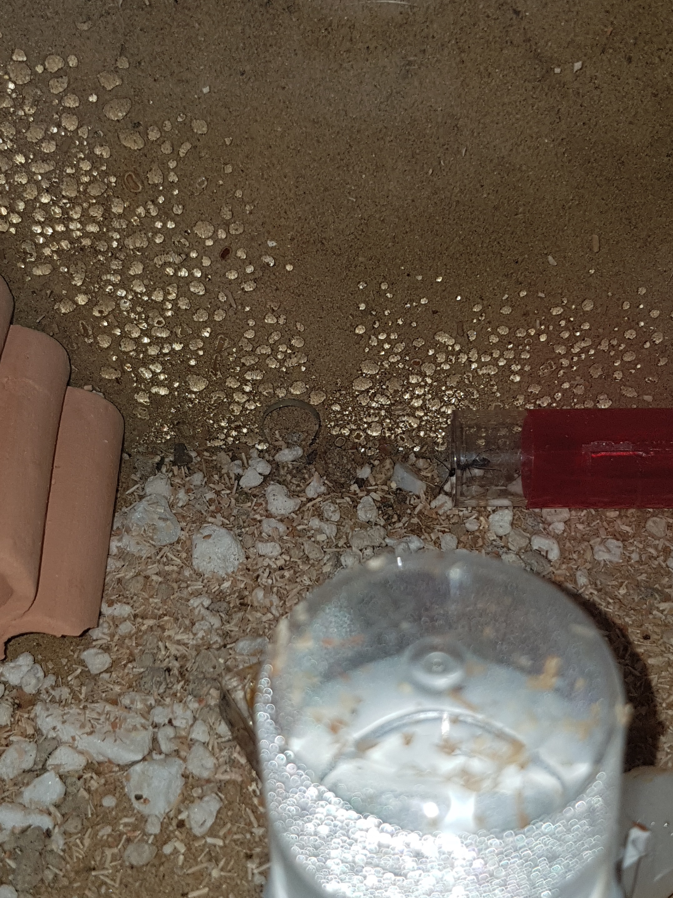 Ihr RG hab ich dann auch zügig ins Formicarium gelegt, den Stopfen entfernt und ganz in die Nähe vom Eingang die vorbereitete Wassertränke und etwas zu Futtern hingelegt.
