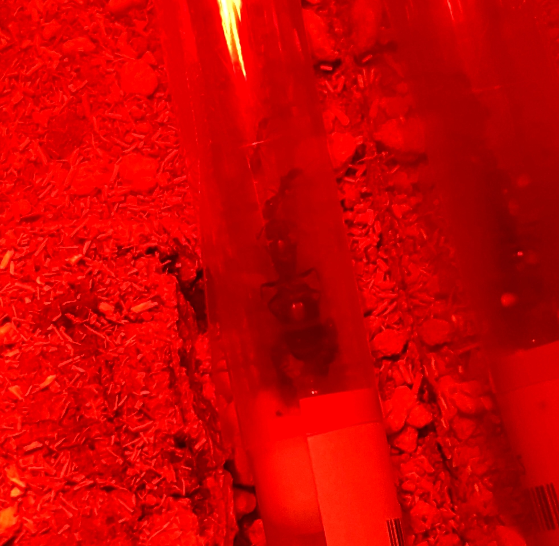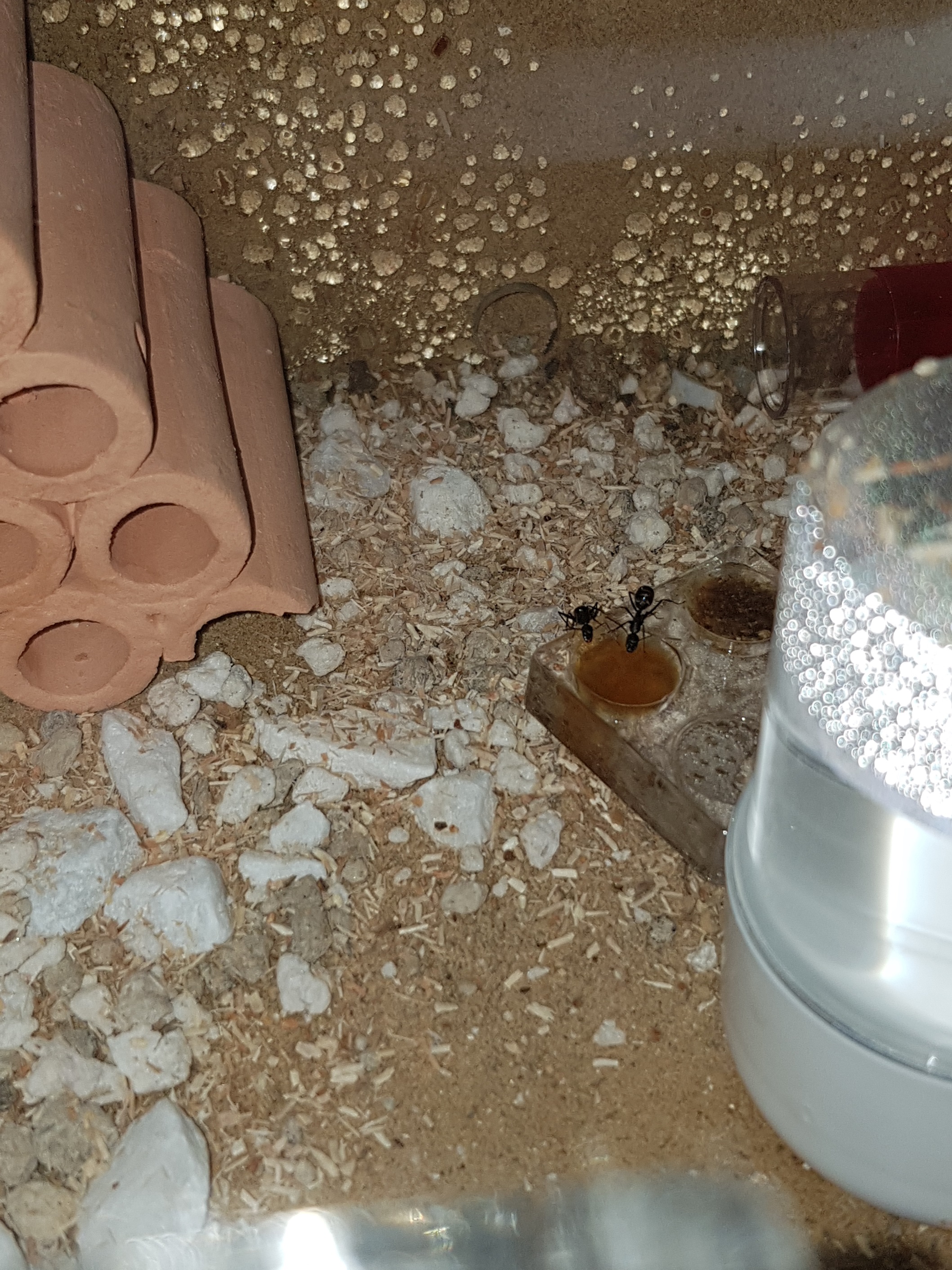 Dann dauerte es vielleicht 10 Minuten bis das Futter (leicht verdünnter Honig, Zuckerwasser, Insektenbrei aus Pulver vom Antstore und leicht verdünnter Agaven-Dicksaft, wie gehabt im 4x10mm Napf serviert) entdeckt wurde.