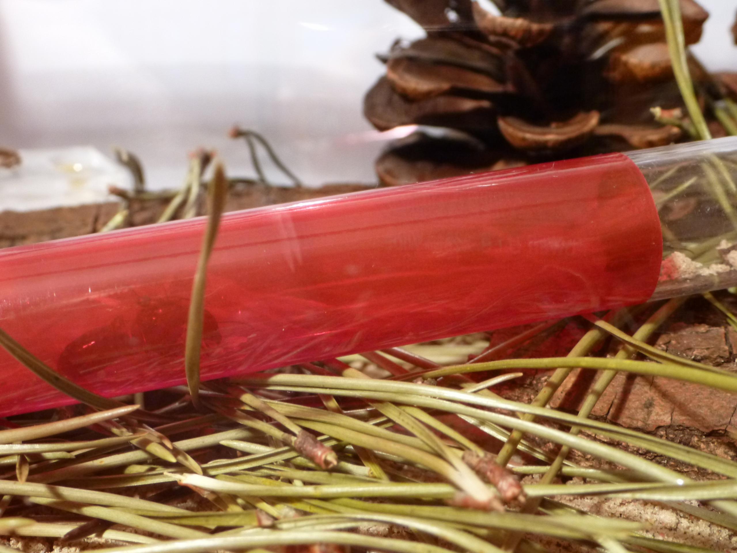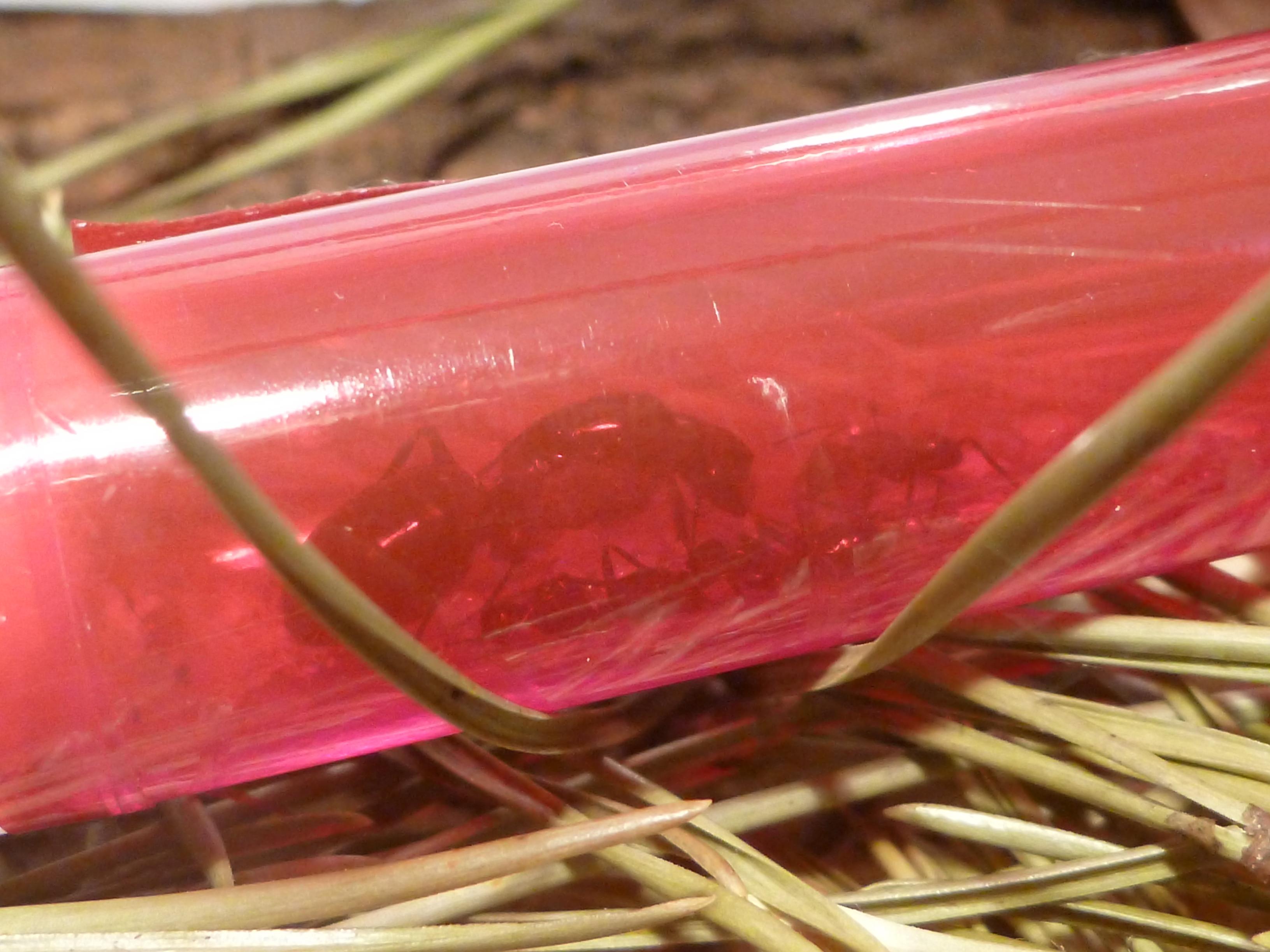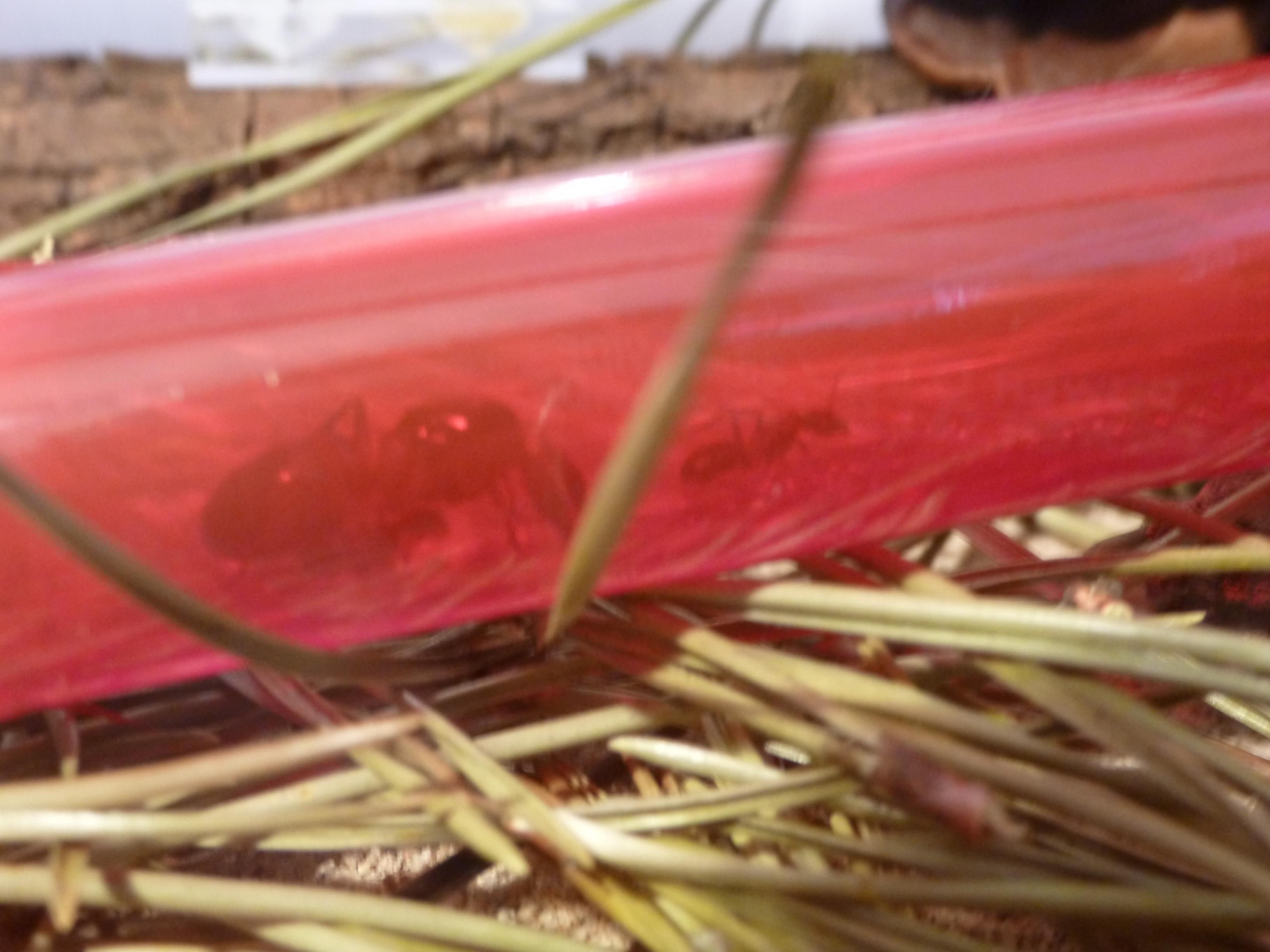 Ich habe sie dann gleich in ihr neues Zuhause gesetzt und vorher das RG mit roter, selbstklebender Folie umwickelt. So sehe ich zwar weniger, aber für die Ameisen sollte es besser sein.