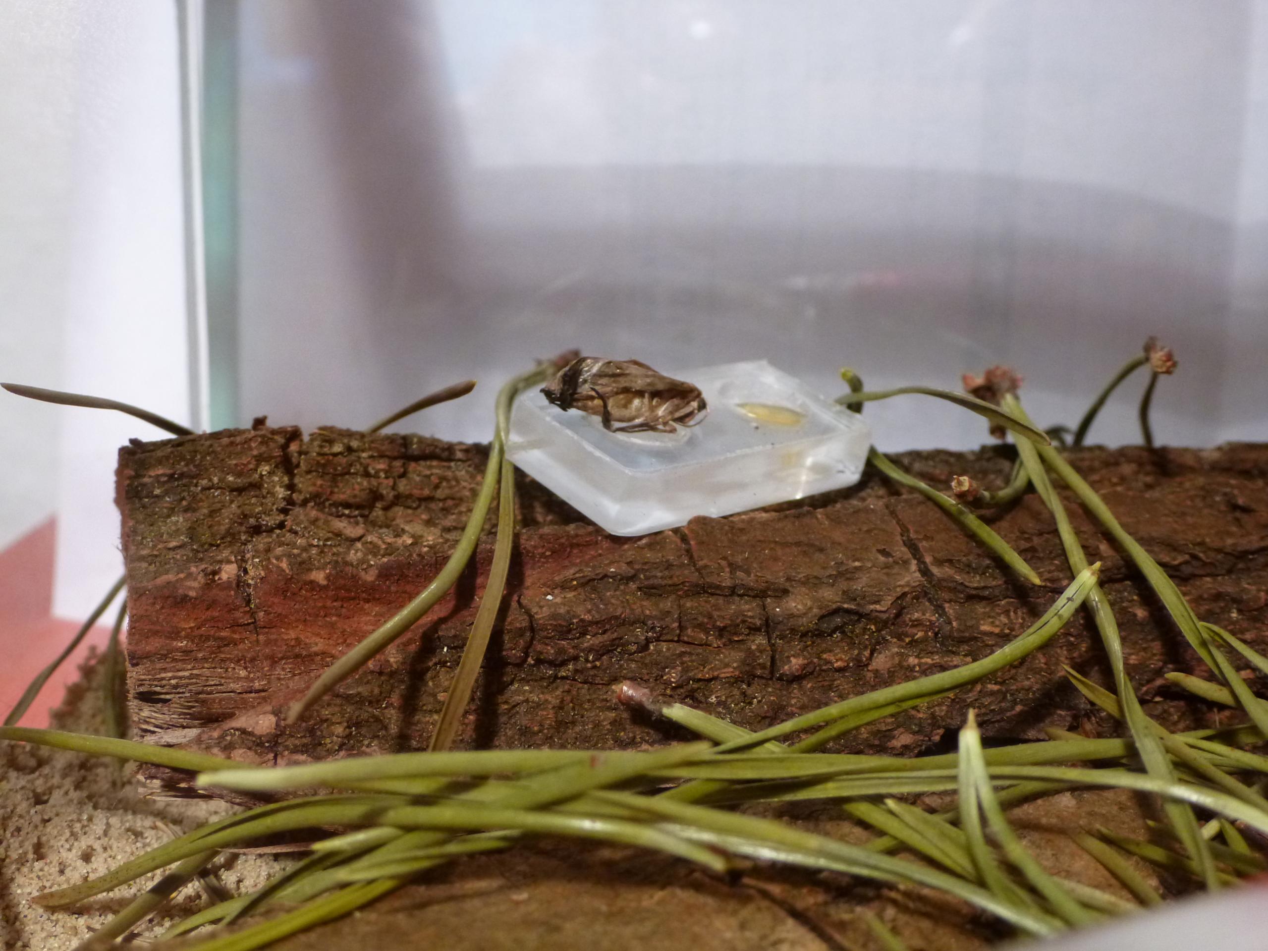 Abends habe ich mit der Hand auf dem Balkon eine Motte gefangen, abgebrüht und ins Formicarium gelegt. Dazu habe ich einen Tropfen Zuckerwasser-Honig-Mischung getan.