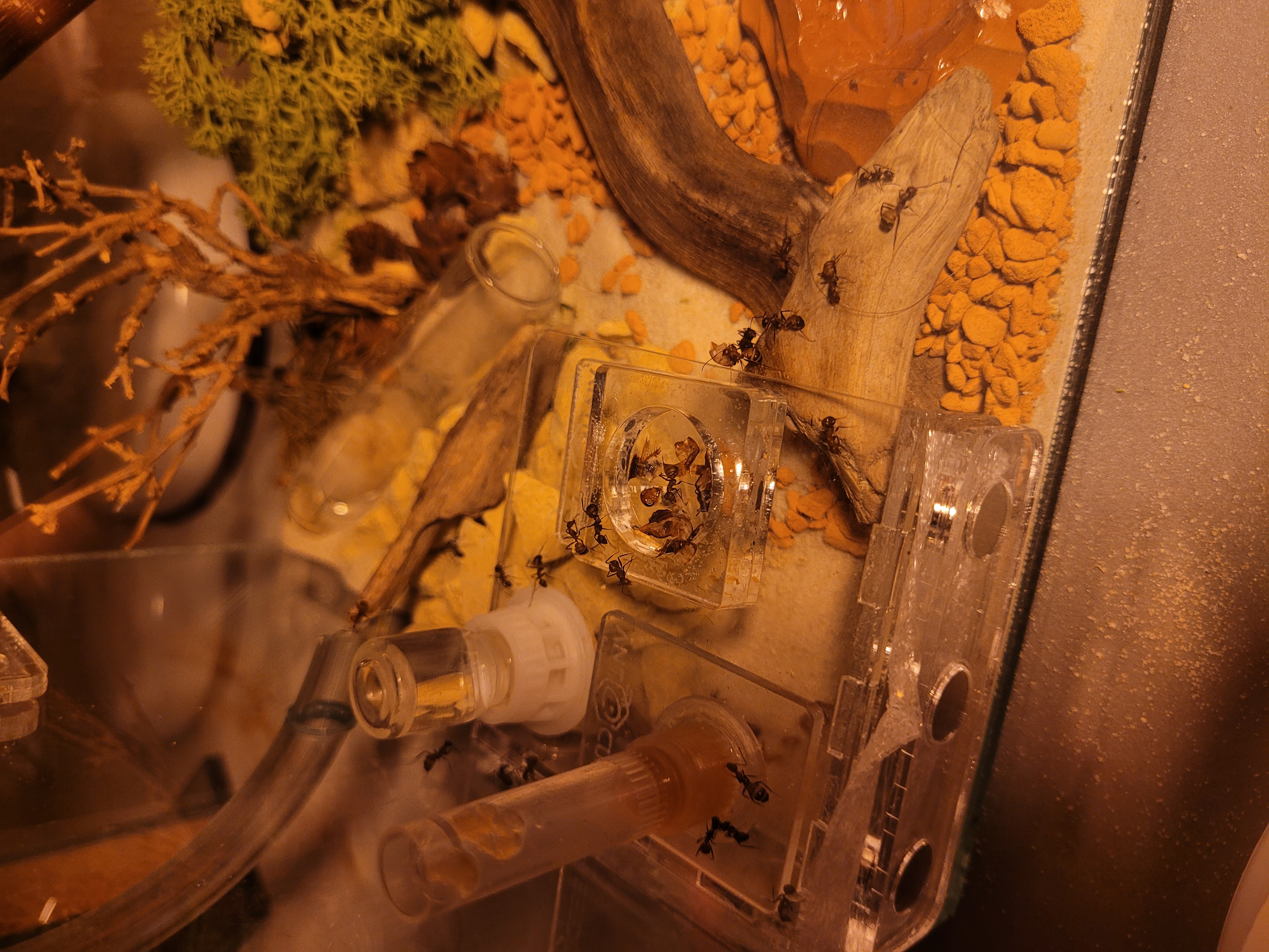 Neben dem Arena-Cube haben sie noch das Nest, was mit beim Starterset dabei war. Kleines Standnest mit Sand gefüllt, mit Wasserreservoir an der Seite. Ab und an buddeln sie da noch rum, aber viel passiert da nicht. Vielleicht ziehen die Kleinen auch nur etwas Feuchtigkeit aus dem Sand. Wer weiß.